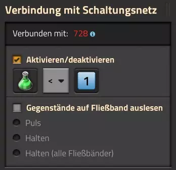 特点 所有三种可能的变量,即红色、绿色和黄色星星,当设置在输入端时,都可以单独处理所有物品。但也可以将这些变量设置在输出端:此时获得的材料、数量等将通过输出端传递。 当您以后处理复杂网络时,如果突然在网络中发现完全错误的数字或材料,了解这一点非常重要! 机械臂的激活 例如,机械臂也可以自动激活。为此我创建了一个新布局