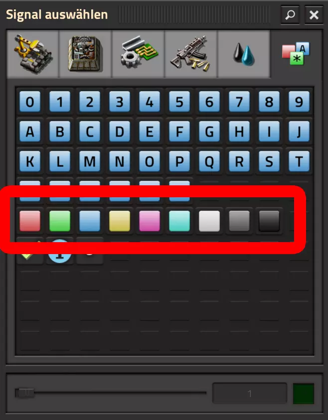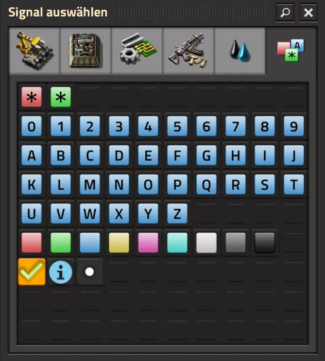前五个标签页代表普通资源,第六个标签页代表这些变量。 根据选择的符号不同,存在几种变量类型: 红色星星:必须满足所有条件,激活功能才会启用。 绿色星星:只要满足一个条件,即可生效(启用)。 黄色星星:仅用于计算,代表所有获得的物品。 颜色:除了正常的数值传输外,还可用于为灯光等物体上色。 其他符号:包括所有字母、数字以及绿色对勾、蓝色“i”和白色圆点。这些符号可自由使用或仅作为数值载体。关于红色星星的说明: 例如,当你检查两个箱子是否满足【红色星星】>100时,只有当两个箱子的内容物都至少有100个时,条件才成立。如果其中一个箱子的数量低于该值,条件将不再成立。这个符号很常见,许多设备都可以使用红色星星。 关于绿色星星的说明: 在与之前相同的例子中,当至少有一个箱子的数值达到100或以上时,【绿色星星】会判定条件成立。如果两个箱子的数值都低于100,条件也会失败。这个条件只在非常特殊的设备上出现。电缆颜色与变量 基本上,你可以从两个不同的来源为变量“A”赋予1的值。如果两个生成器都位于红色电缆上并相遇,那么在所选颜色中会生成两个“A”,因为“A”在网络中存在两次。 相反,如果你使用分别传输一个“A”的绿色和红色电缆,将会输出一个绿色和一个红色的“A”信号。 我知道这部分内容相当抽象,但我会在相应的地方详细说明! 比较组合器 接下来我们看