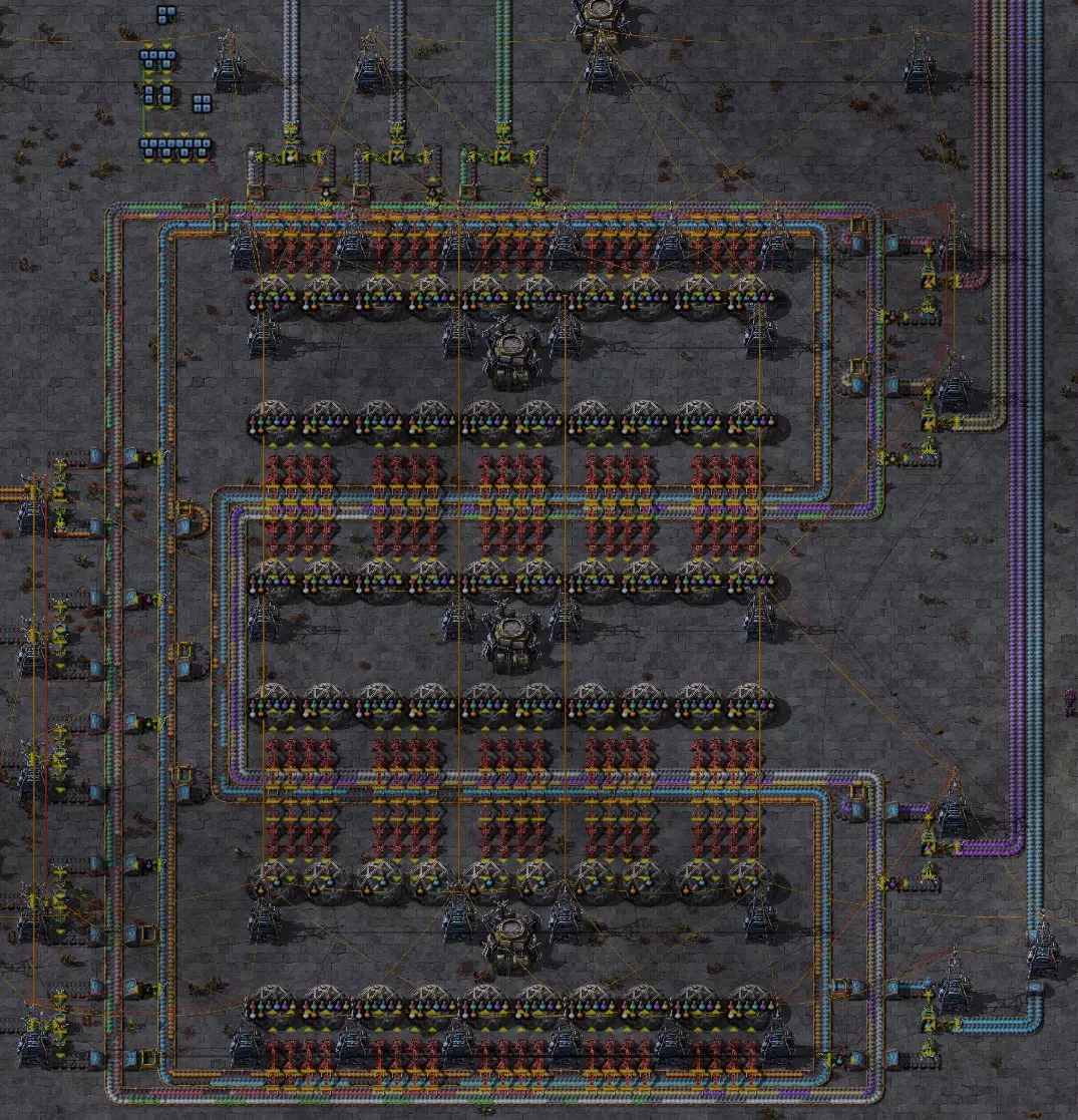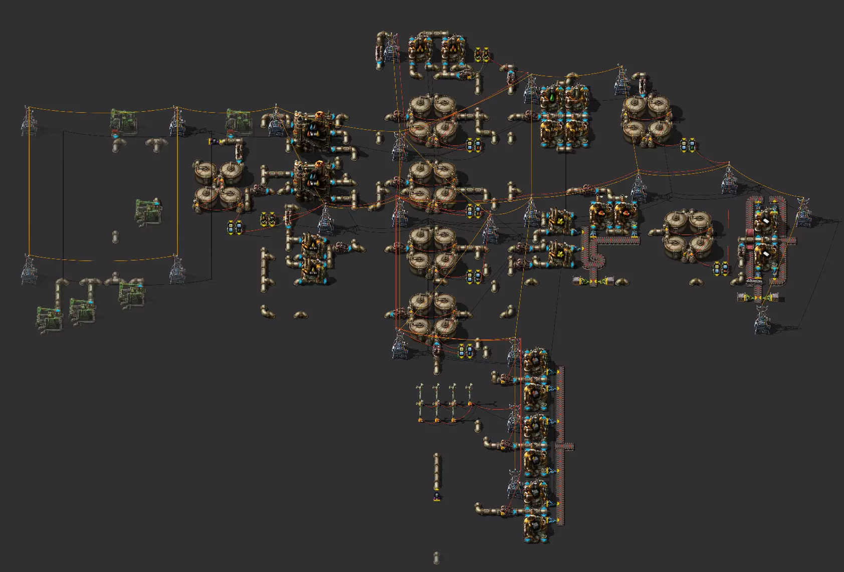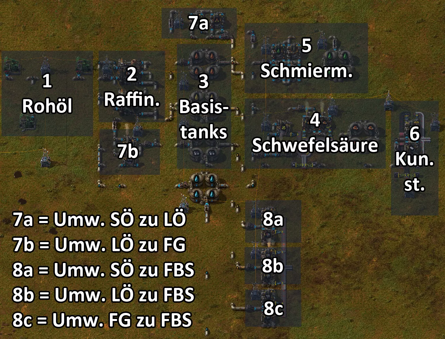 无法翻译的内容已删除无法识别内容,已删除。附加视频:所有储罐的平均值 几个月前,我在YouTube上SeeNo的一个很棒的《异星工厂》教程视频下留了一条评论。内容是关于填充量的,因为他在视频中总是取用最后一个储罐的物料。由于这个例子很合适,我想在这里附上我的视频。 这里还有我提出该观点时参考的视频。 示例:石油加工:准备阶段 在这个示例中,我搭建了一个相当紧凑的石油加工设施,仅用于演示操作步骤。让我们了解一下石油加工流程: 原油泵将原油注入原油储罐。 原油储罐为炼油厂供料。 炼油厂会生产三种产品:液化气、轻油和重油。 到目前为止,所有最终产品都会分别流入四个储罐。 石油加工的问题在于,只要其中一个现有最终产品的储罐满了,整个炼油厂的生产就会停止。 因此,我们需要尽量将储罐库存保持在理想范围内。 那么,我们接下来要高效加工什么呢? 我们可以从液化气中生产硫磺,然后在另一个装置中将硫磺转化为硫酸。我还计划为硫酸设置四个储罐(电池生产用)。不过,如果硫酸储罐已满,就不需要再进行任何操作。储罐满了,这套设备就会自动关闭。目前来看没有问题。这与我们中间产品储罐的初始问题只是间接相关。 此外,我们还可以用液化气来生产塑料。 从重油中我们可以提炼润滑剂。这里同样有四个润滑剂储罐。当储罐满了,这套设备也会自动关闭。目前这也与我们无关。 轻油可能会成为问题,因为在游戏结束前我们都没有它的直接用途。它是用于生产火箭燃料的。问题分析 我们可以在储罐容量达到例如80%时开始利用各自的基础资源生产固体燃料。此时会消耗适量的材料。 此外,我们可以从重油中提炼出轻油,再从轻油中生产出液化气。 通常问题在于,我们会得到过多的轻油,而一开始无法处理掉这些轻油。 石油工业示例(高度简化)