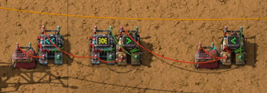 现在让我们来看看布线。从第二个位置开始,刚刚配置好的比较组合器会将其输出信号发送到当前面板。为此,我使用一根红色电缆,并将新比较器的输出端与当前位置的显示器进行相应连接。