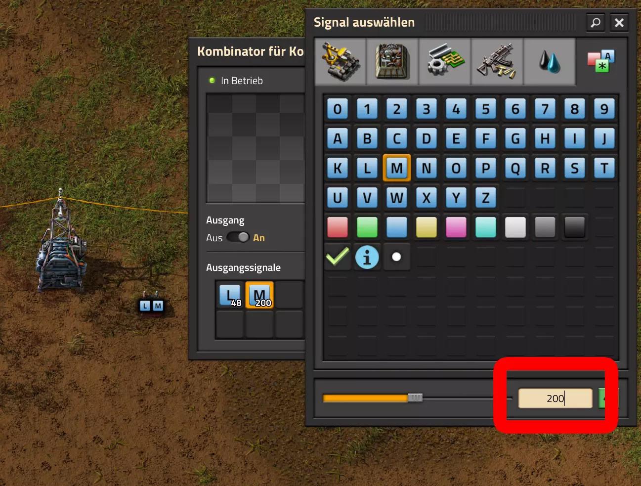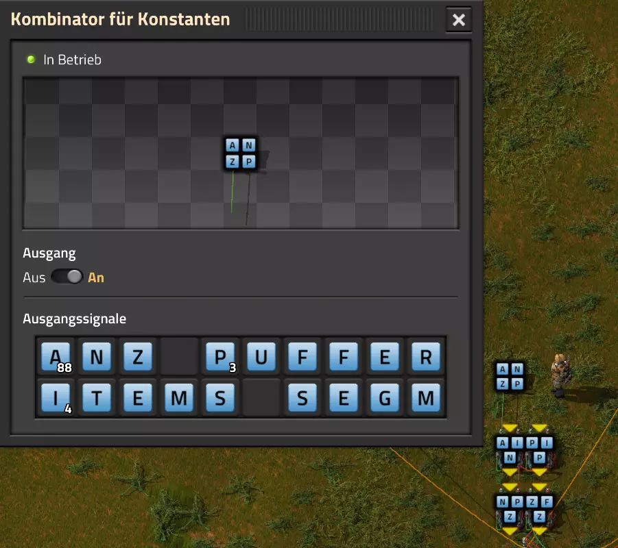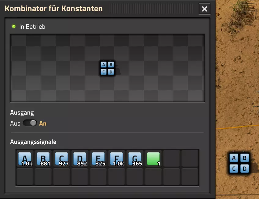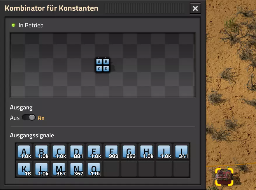 我直接从“全部”–1000中获取输出信号:在这里我可以看到未改变的输入值,也能看到减去1000单位后的值。由此得出以下用于传输的变量值: 变量A:1023 变量B:1007 变量C:1005 变量D:881 变量E:2 变量F:909 变量G:893 变量H:1006 变量I:1021 变量J:341 变量K:18 变量L:1017 变量M:367 变量N:367 变量O:1023 现在我将这些变量手动传输到常量组合器,它将为我提供显示屏的基础数据。