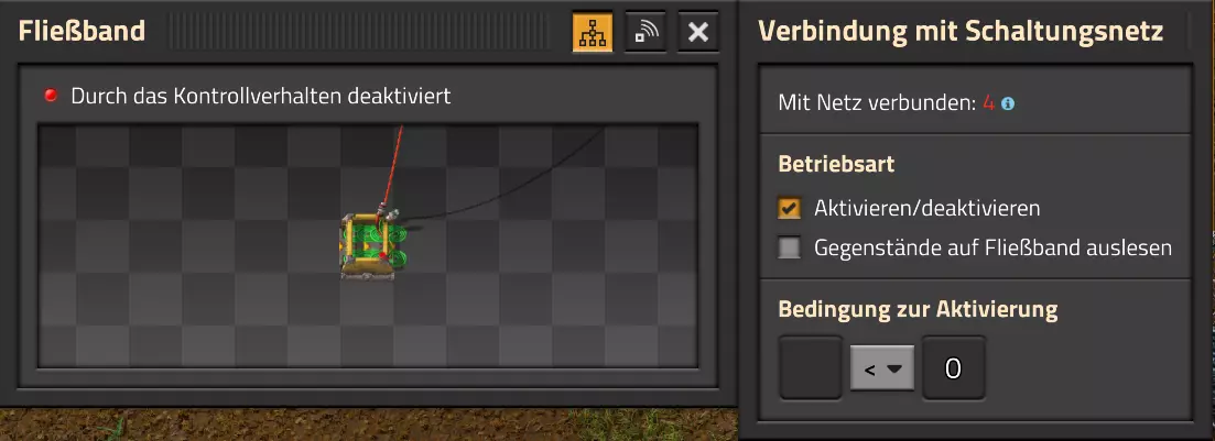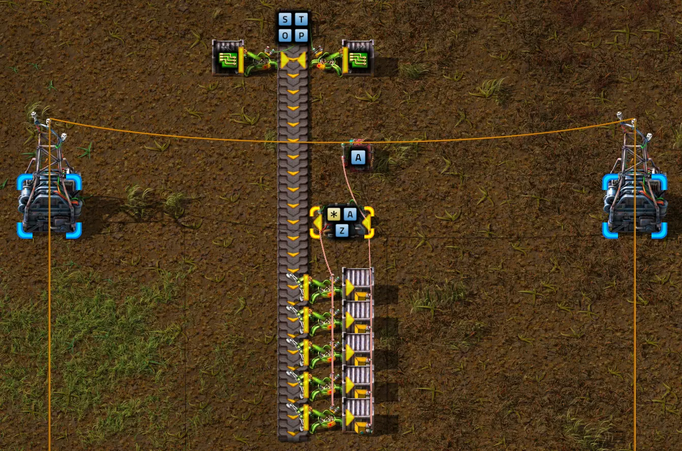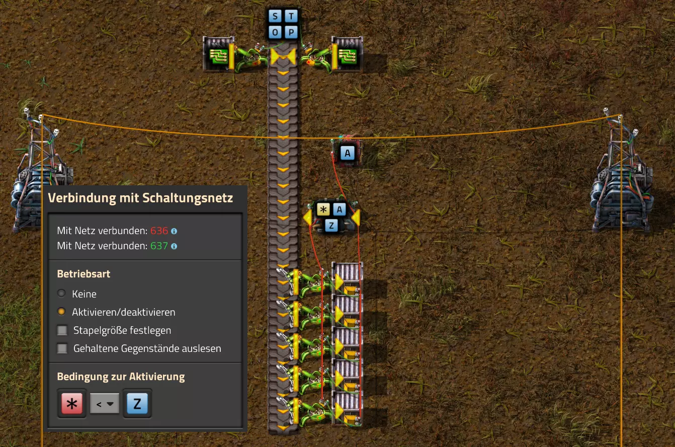 在我的情况中,我现在将所有四个组合器的结果分别连接到两条传送带的各一个传送带段上,并进行设置,以在整个传送带长度上生成一个持续的信号。