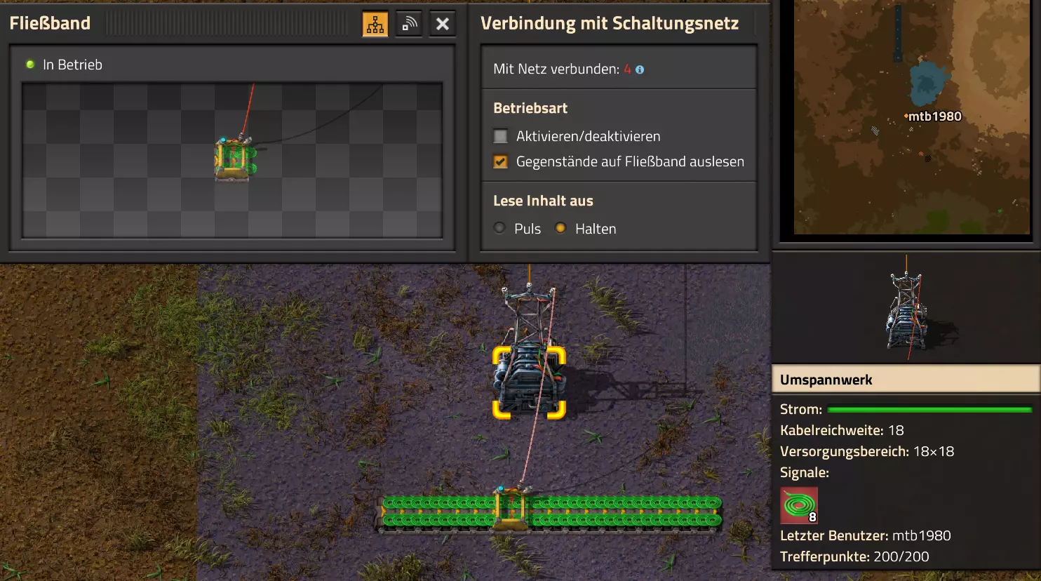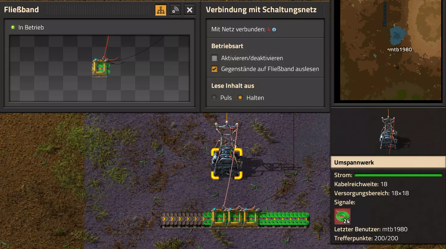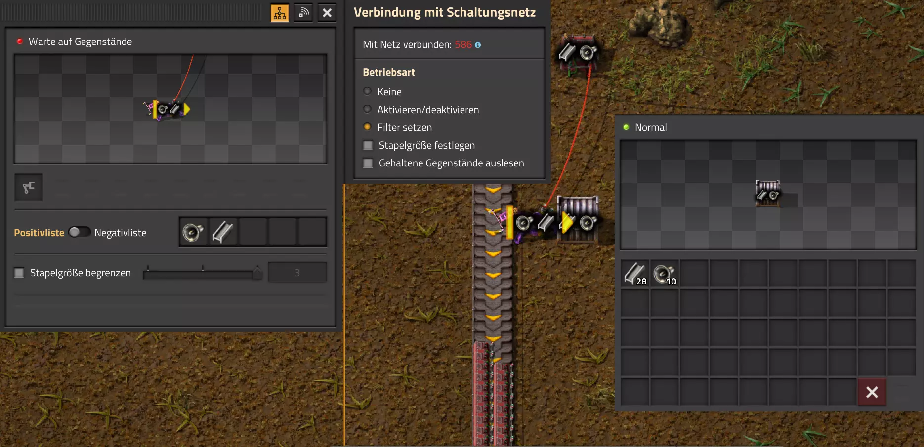 在我的情况中,我现在将所有四个组合器的结果分别连接到两条传送带的各一个传送带段上,并进行设置,以在整个传送带长度上生成一个持续的信号。
