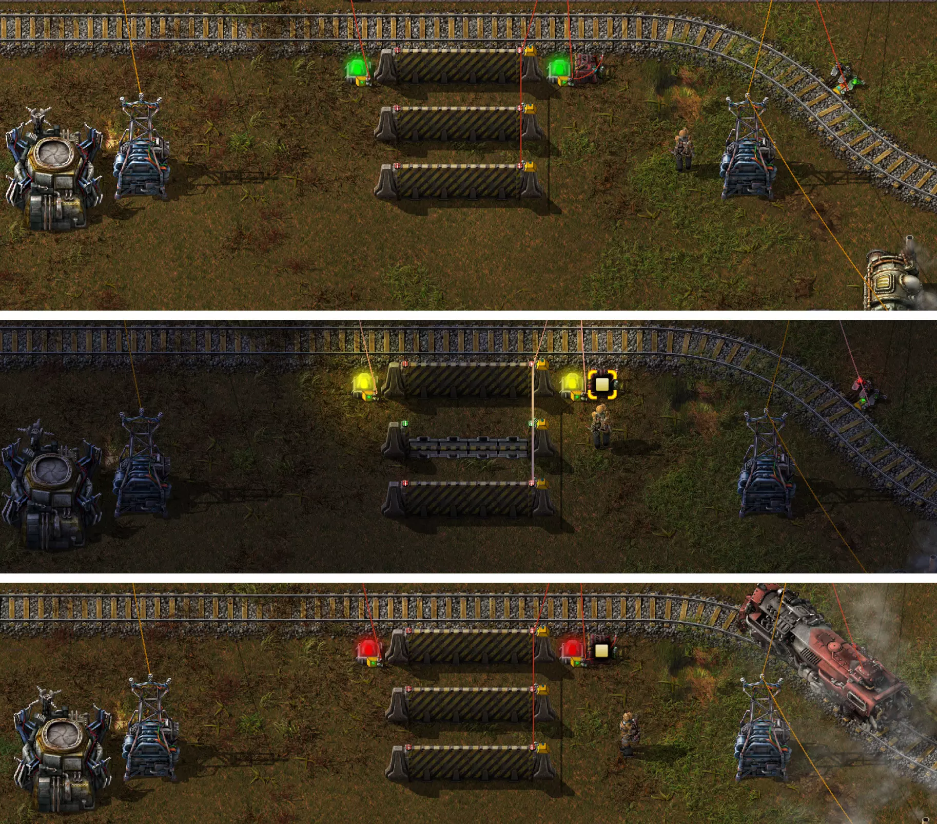 当手动打开一个信号灯且由此将一个(或多个)信号设为红色时,列车信号不再显示颜色。我通过在电路网络上连接一个常量组合器并发出黄色信号来解决此问题。 正如我们在关于信号灯的介绍部分所了解的,黄色会被所有其他颜色覆盖: