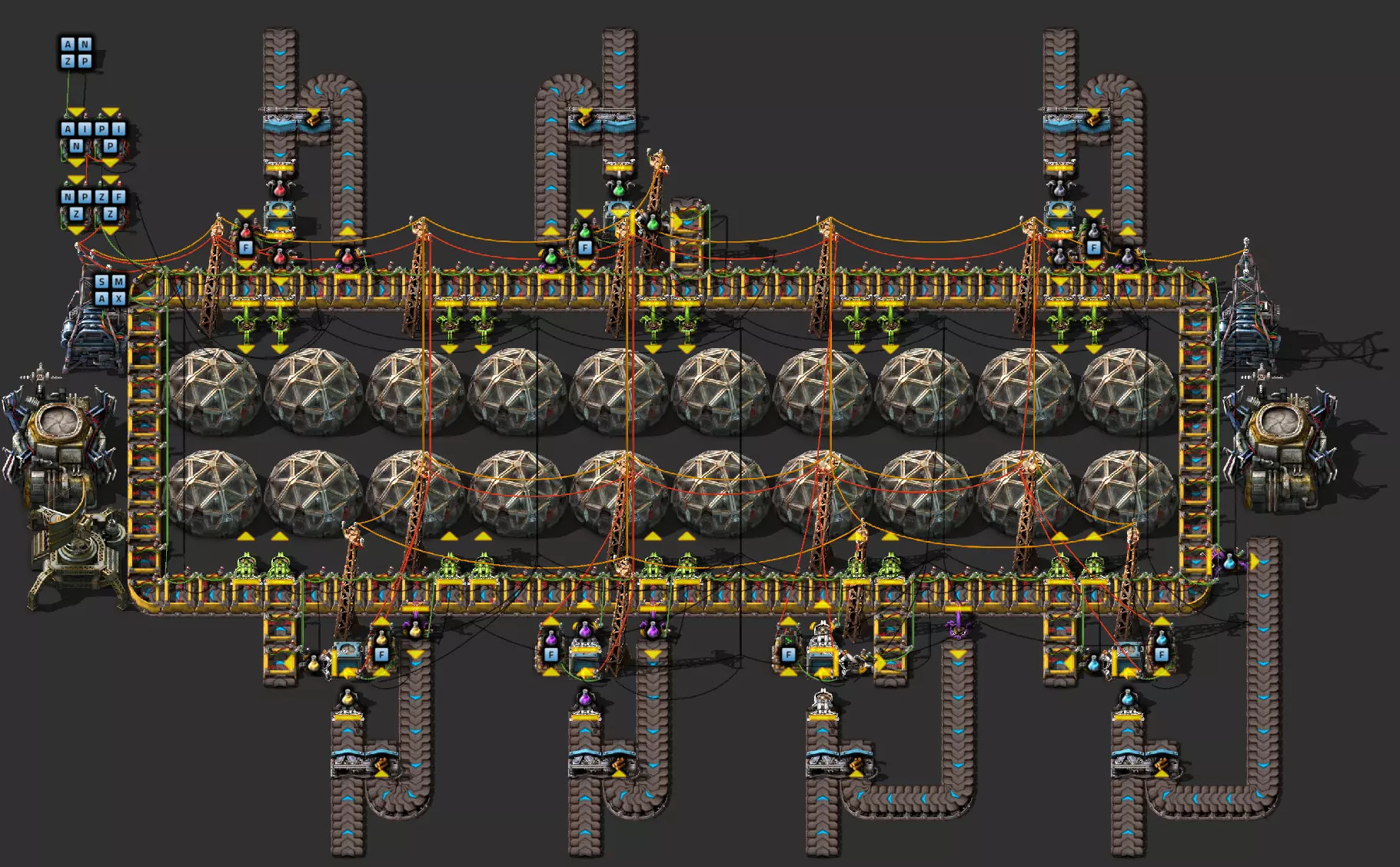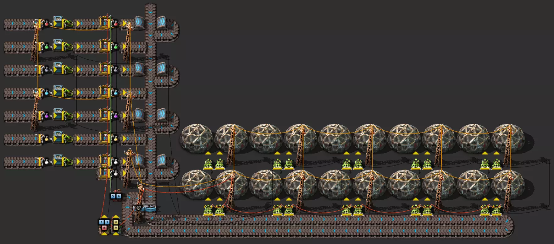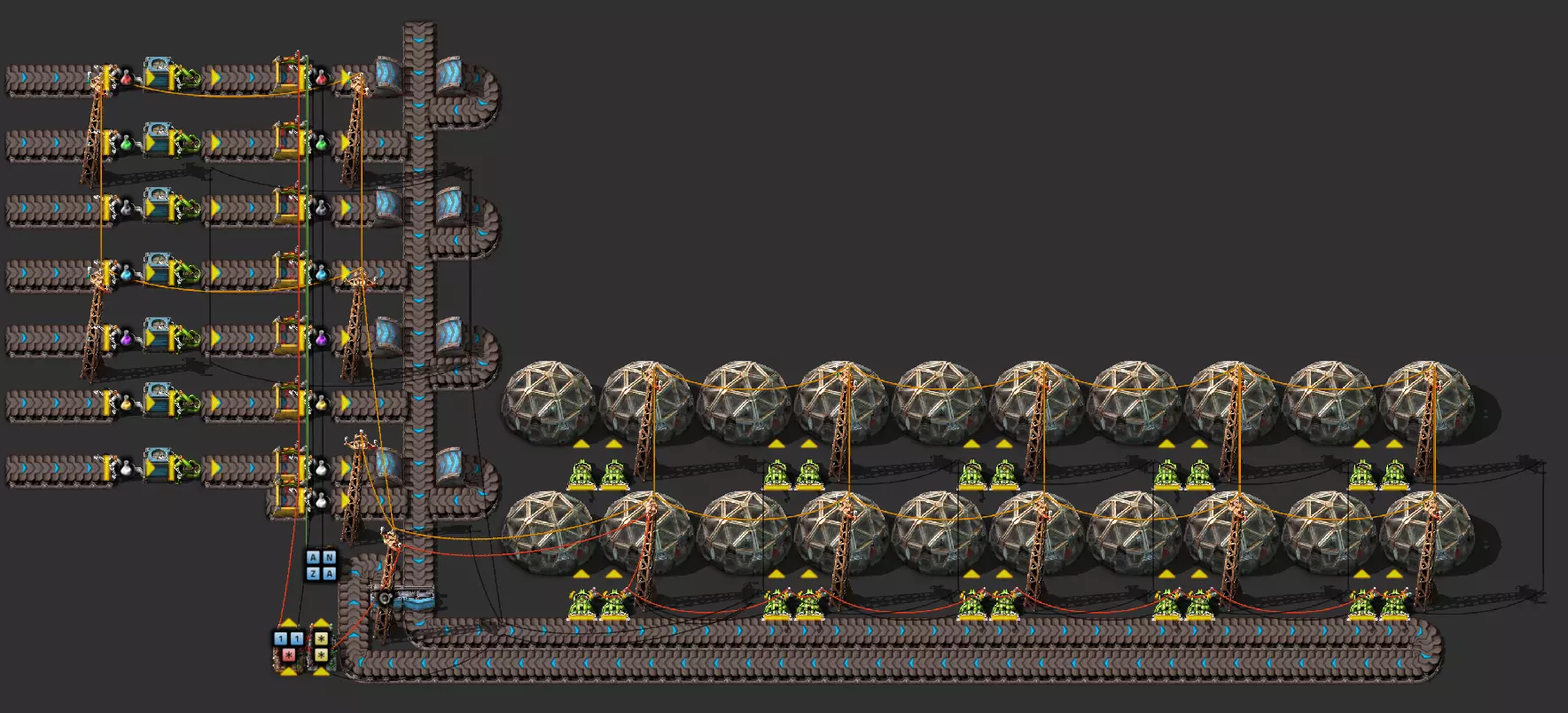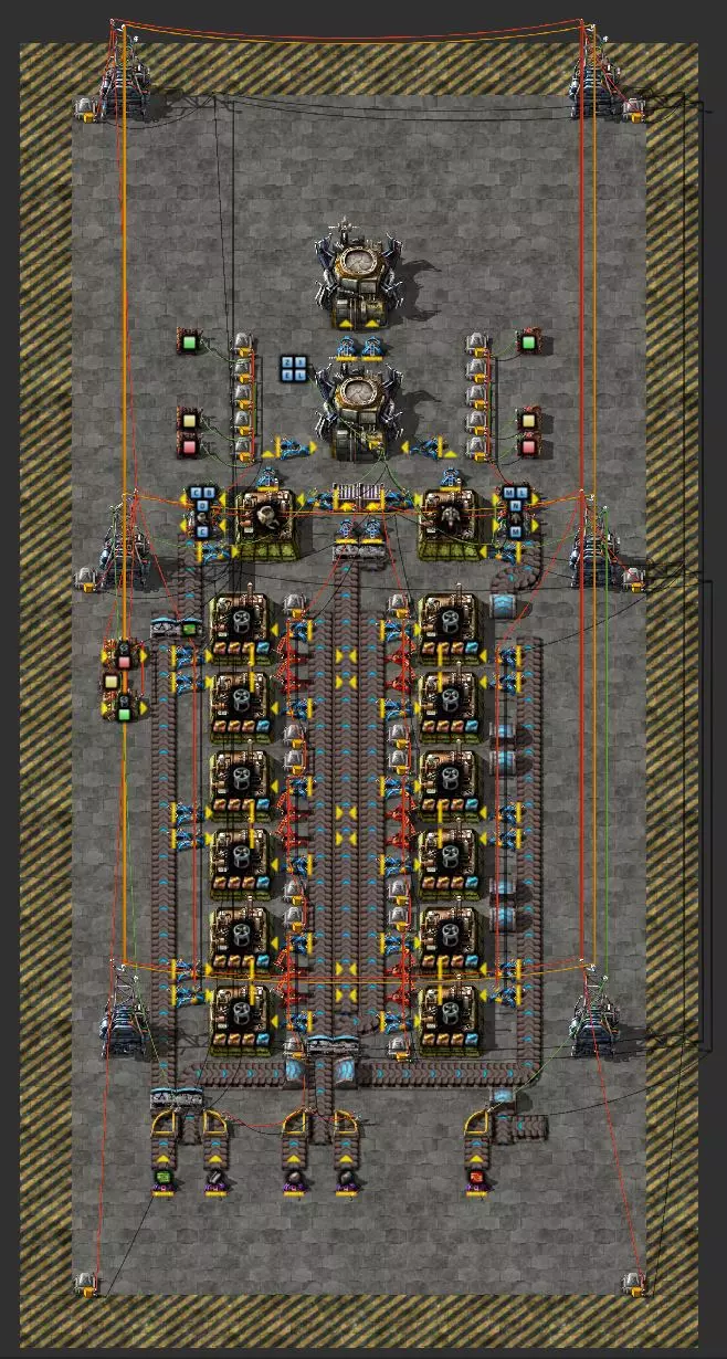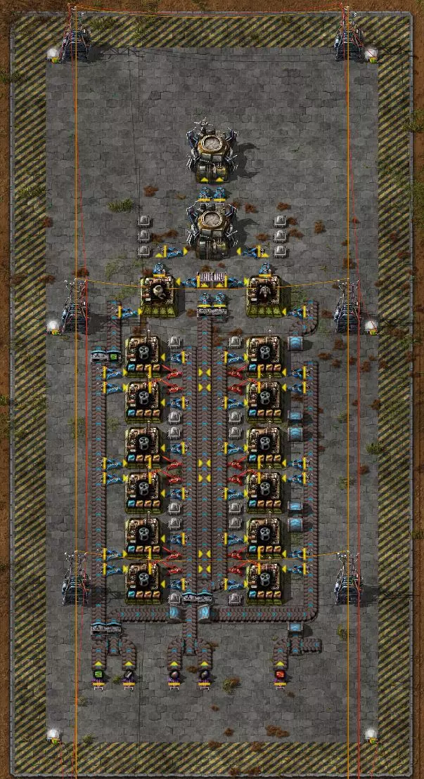 我的建造包含12个无人机框架生产设施,由两个储物箱进行缓冲。这些箱子分别为左侧的建筑机器人生产设施和右侧的物流机器人生产设施提供框架,同时从侧边传送带拾取绿色和红色电路板。成品机器人通过两个机械臂直接送入两个机器人停机坪。第二个停机坪作为缓冲,若第一个停机坪中的机器人过多,生产将会停滞。 问题与目标:该设施运行良好,但存在一个问题:机器人的产量会不断增加,最终数量过多时会导致性能下降。此外,该设备还需要相当多的资源。因此,我想在这里涵盖几个方面: 1. 一旦箱子里有10个飞行机器人框架,就不应再继续生产 2. 飞行机器人框架的当前库存状态应通过相应生产设备旁的指示灯以视觉方式显示,绿色表示运行中,黄色表示即将完成,红色表示生产停止 3. 当出现红色信号时,应停止钢铁、电动机和电池的输送皮带 4. 一旦我的网络中存在可定义数量的机器人,机器人生产设备就应关闭 5.当达到设定的机器人数量时,相应的绿色和/或红色电路板输送带应停止运行。 6. 当前各类型机器人的目标数量应在机器人停机坪的左侧或右侧以小进度条的形式显示。 因此:生产应持续进行,直到达到一定数量的机器人。如果数量减少(例如被“咬食者”吃掉),则会重新生产。 示例:机器人设施:入门步骤 步骤1:框架制造 这个任务相对容易解决:为此,用红色信号线连接两个缓冲箱,并将其连接到所有框架生产设备的进料抓取器(蓝色抓取器)以及这些设备旁边的指示灯上。