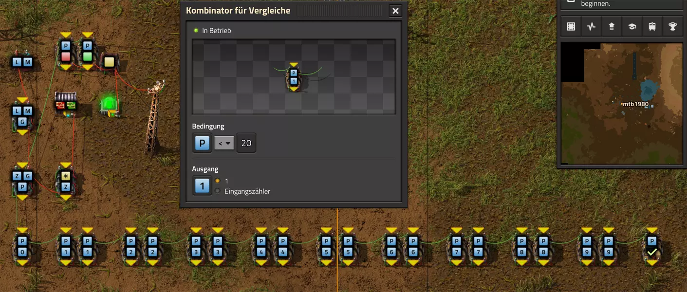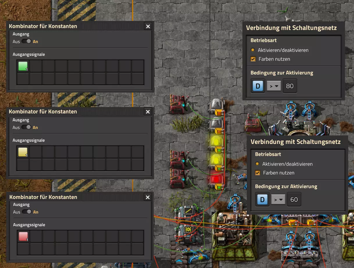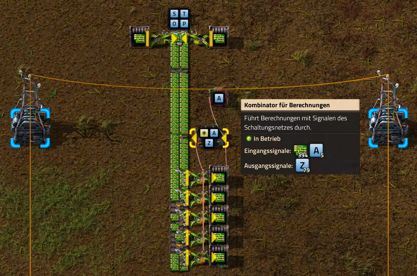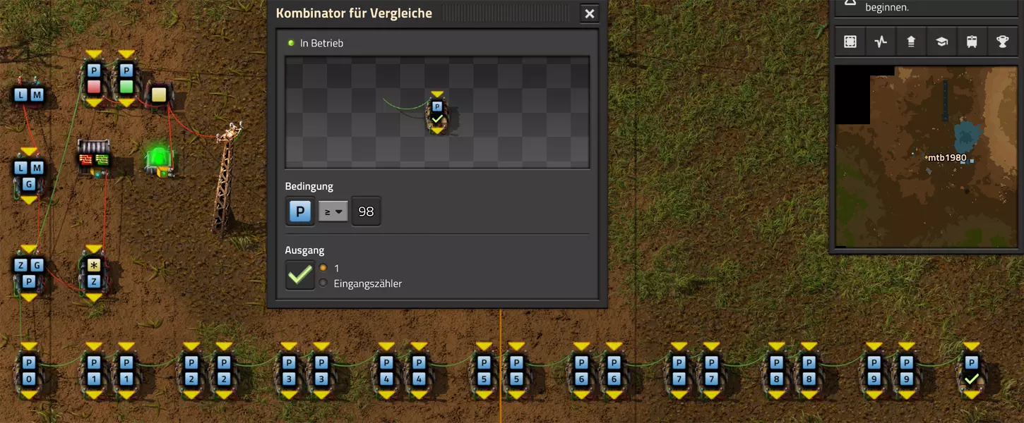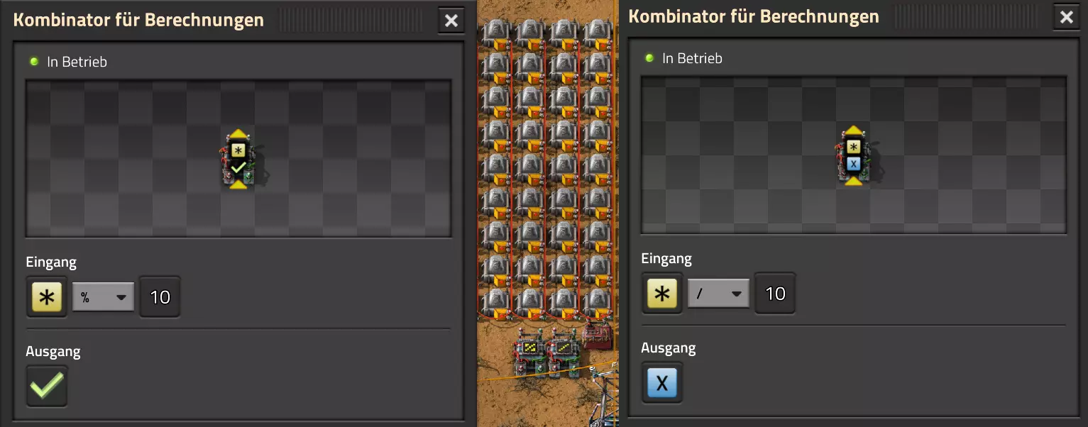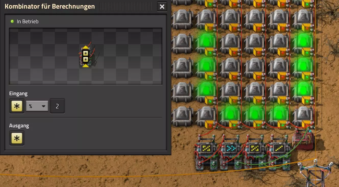 Ich habe hier zu Testzwecken mehrere verbundene Lagertanks aufgebaut. Da der rechte Tankblock nur passiv über ein Untergrundrohr aber nicht mit einer Pumpte versorgt wird, füllt sich der rechte Bereich langsamer. Zwischen den beiden Tanks habe ich 12 Lampen-Reihen hingestellt: Eine für Null und danach jeweils eine für 10-90%. Die zweite Reihe von oben verwendet eine Füllmenge von 98%, ganz oben 100%. Da es häufig wegen Rundungsfehlern nicht zu 100% kommt, habe ich mich für die 98% entschieden, 99% sollten aber ebenfalls funktionieren. Sollte es dennoch einmal auf 100% gehen, leuchtet die oberste Reihe weiß :) Wie habe ich das Ganze aufgebaut: 1. Alle Tanks mit einem Kabel, beispielsweise Grün, verbinden 2. Einen Dreisatz aufziehen und den Prozentsatz der Lagermenge errechnen (siehe Lampen-Einführung weiter oben): Konstanter Kombinator: A entspricht der Anzahl der Tanks (in meinem Fall 25), E der Lagermenge pro Tank (25.000). Berechnender Kombinator 1: Rechne A (Anzahl) mal E (Einzellagermenge), das Ergebnis ist G (Gesamtmenge) Berechnender Kombinator 2: Rechne den Tankinhalt (gelber Stern) mal 100, Ergebnis ist Z (Zwischenergebnis) Berechnender Kombinator 3: Rechne das Z (Zwischenergebnis) dividiert durch G (Gesamtmenge). Das Ergebnis ist P (Prozent) Nun habe ich mit dem grünen Kabel alle Lampen verbunden. Ausnahme ist hier nur die unterste Reihe, die immer rot leuchten soll. Die Einstellung pro Zeile entspricht von oben nach unten: Wenn Z = 100 Wenn Z >= 98 Wenn Z >= 90 Wenn Z >= 80 Wenn Z >= 70 Wenn Z >= 60 Wenn Z >= 50 Wenn Z >= 40 Wenn Z >= 30 Wenn Z >= 20 Wenn Z >= 10 Die unterste Reihe leuchtet immer und sagt Null Prozent aus. Um die Lampen einzufärben habe ich mich rechts der Lampen für einige konstante Kombinatoren entschieden. Diese senden die entsprechende Farbe an die mit der anderen Kabelfarbe verbundenen Lampen. In meinem Fall hatte ich die Prozentmenge mit dem grünen Kabel verbunden, daher habe ich für die Farben das rote Kabel verwendet, da Rot jede andere Farbe überschreiben würde, wenn diese im gleichen Schaltungsnetz liegen würde. Hier noch der Import-Code zu diesem Beispiel: 0eNrlXN1uo1YQfhcuK7zl/B8s9aIX1d7udapVRBw2QbXBwpA2WvkB+iB9sT5JATexc5jZnAGMSvcmku1hGL4zP9/MOeRrcLet032Z5VWw/hpkmyI/BOtfvwaH7CFPtu131fM+DdZBVqW7IAzyZNd+OlRFmTykqyrJfwuOYZDl9+kfwZodP4dBmldZlaUnPd2H59u83t2lZSPwqmGf7ZvLi9VDWdT5faN5Xxyay4q8vWerSnxQYfAcrFeMf1DHY9jTxf11xe/pEt66uHxPlzyjVN8dqqS7uG8TP2mxDXp5mj083hV12WKmQ24/A2rVq9p2kRrgq9Wm2N1ledKsBaDfvNhpGzPD4D4r083p98bARkVVFtvbu/Qxecqa65uLvmTbKi2R5X/Kyqpuvjk/Wyex+rld/U0DVdUt7tkPuq/z/HTPQ6uJtX/K9P7SL7LmE2ulISC1F5A8PgMJ3fGhTNPcvae5uF1ng2ltcFZChiZUEloL42WZVAMs045lHLJMh8ZAdtkB4aV77gEojgfEmpdiFg2IPD/NF7mm3u2/BYFffGyyclNn1W3z2/2rni9ZeahuqeFyit9gHbUfdvuk7GJ4HfwUHP3jRrk+zJE4Yvw9JOJlI9FkEAcKgUEh3oHi7GQLhQJ1AgkX774zvCLAuzDzzlxMYbdWvrc2b299AT+nGCJdd9CYZdrTMh4NBwWqNJAtxtcWMQ1KbqVxPwvUlfzLDFcvtgrXVg1pPteZwy7ZblfbBApSwXqrcZXAvHkbmCzyD00Qcs5diLE8xf3L4hmMHsQc0sz8IBaLhRhBlPs9N1/mc7PY5Y0Yq+b+vc4ZDK/o5b4lRg7NpryXo2LsKZX/U1paAPnWDDlNnuYS7Aggy3wriNQD8XfbJo4VVm4pTXDU77zgvovHVBITjYFeRM7zSszdRESlOBHR8934Flh8C0blNNNihNIGwakEh4gRM94YCSLPYFctBp/eFoPYOrXg7z//aiXqQ9rcZlu0IVKVderfFQjbDub8CkcrC4MmiaBFs4IWTQ6aS92lQFEEZWEUFZGHLB1Ft3wJjaMIycIoaiKL/b/5ojD+vigwwiAMEcWlp0EN5DoMRe2dFy0xopeOogG6WAxF4e2LMbV5iCZl1TJCDJMRle8TaYtwK7DEaItkVII/CiPpUjstMcM4jRrMGgFm8mwsFerw0k2+CithkshBZ61g9vo8QEp/HiBRx5O03LtwEKWbTiVOA0BZGEQiJV169LpTWIkzUlAWBpHISJefAp3aEPnnRNwTiYR06eHcy3M4H+3Lop5oaSdFhMLIwpQHRU4PNfqwCO465NGgGDmBUxhjVORhoBhF03qGYfxRkUeDRIyUyxgVNgxU5GHgKIyUe0JAY92cErTo4S9Um891zKrd2ngNnZCg5Jc3SqJ2y+lfPZwSgrqJtJf02k0QMSQl5fyWgM7BIceclKJRZzFnmVCTlwnljiKUdb4wHK0boCy8XpqGKp8TVT09qr1OzfjTQIWVIWVoXHrpIGp/GgjKwiASJ2pLj++eJ8Y4iJAsDGJM49JLB9HNc5r550TUE3VEA3Hp4Wz8W+OeLOqJmg1sSMQ1KdVzut0Wv4/vSPDH5tSJNpFta2yPUQvqyHoUudbcd06sJXWATYRE9ng+ipGi9ot6FEZYt641tVnURC/pTWow7qINtT0cC4lnT6YttVkkYqR4HyOHNVu/pkefq25SZtXjLq2yjV8D6ZfrzlrPpeQw9ND5IW113NI6yGKflqdebh380IgUdbWvCXf+GBwpbzmILhlz5OdusumxLiYir8vLsUA967rcDFmXj+66/DhgXT6R1sWdAvB3AoaflxE+WoiVUcNobamak4KJySmYwbfFjDsCthhtNcT9WDknZvL6DZQR/g2UwRiCEbQudOEgml4E49wflIVBJG7QLj16Xf5p8KMCoCwMoqJ1octPgU6eI+RE3BOJG7RLD2c8BRrh7XikF521O8JHX5+2g0mynZWMpcnm8YKPOe/rjCXCNzjhghsmOw0VJr5kZ+YMBDZ5IFh3T9LimyUuhBy4FMTURjRM9ZyY8umTi7vlbJl/mbOYY1pG4woLB7HvmHiZA2VhEInvOS48uvue+I26B8nCIAoaV1h6iuzlOZy19mVRT5Q0EJcezgTq35PFPVEN3Dsx19w7aR9/9MYJ/szEgwj2qo7Dhgzk2Amet+9zj/IubDZuiUcmvxOwnPDChouWeNLgu0DP3fuwWEtt44HJyf73k9Npk6xJ4N0/vltf/J+8MHhqbDptd1kmTcyNiA0zTByP/wDYo/WC Video-Guide: Füllstandsanzeige Spezial In diesem Video zeige ich eine Füllstandsanzeige mit einem kleinen aber feinen Zusatz: https://www.youtube.com/watch?v=HEPwed1yq_w Beispiel: Kisten gleichmäßig befüllen Schauen wir uns ein praktisches Beispiel an, wie wir Kisten gleichmäßig befüllen können. Unsere Ausgangssituation sieht so aus: