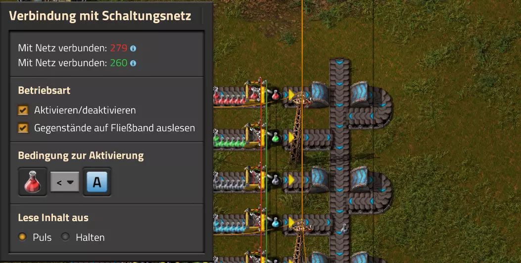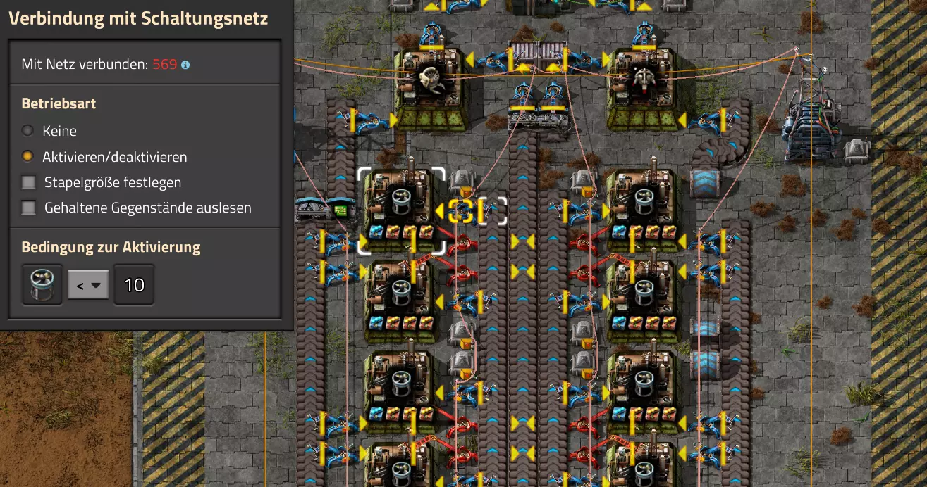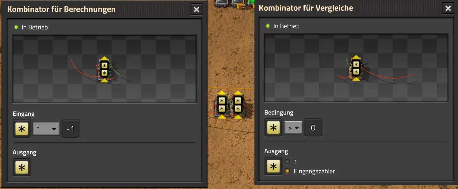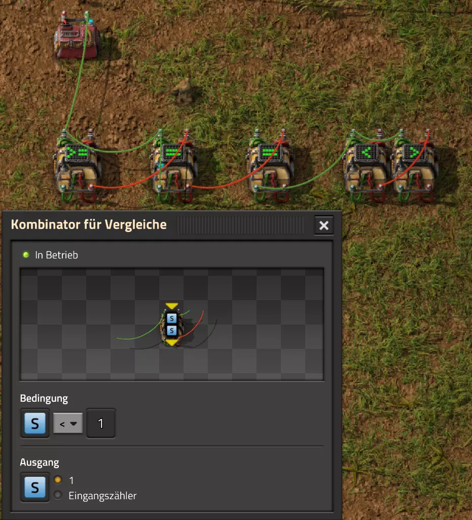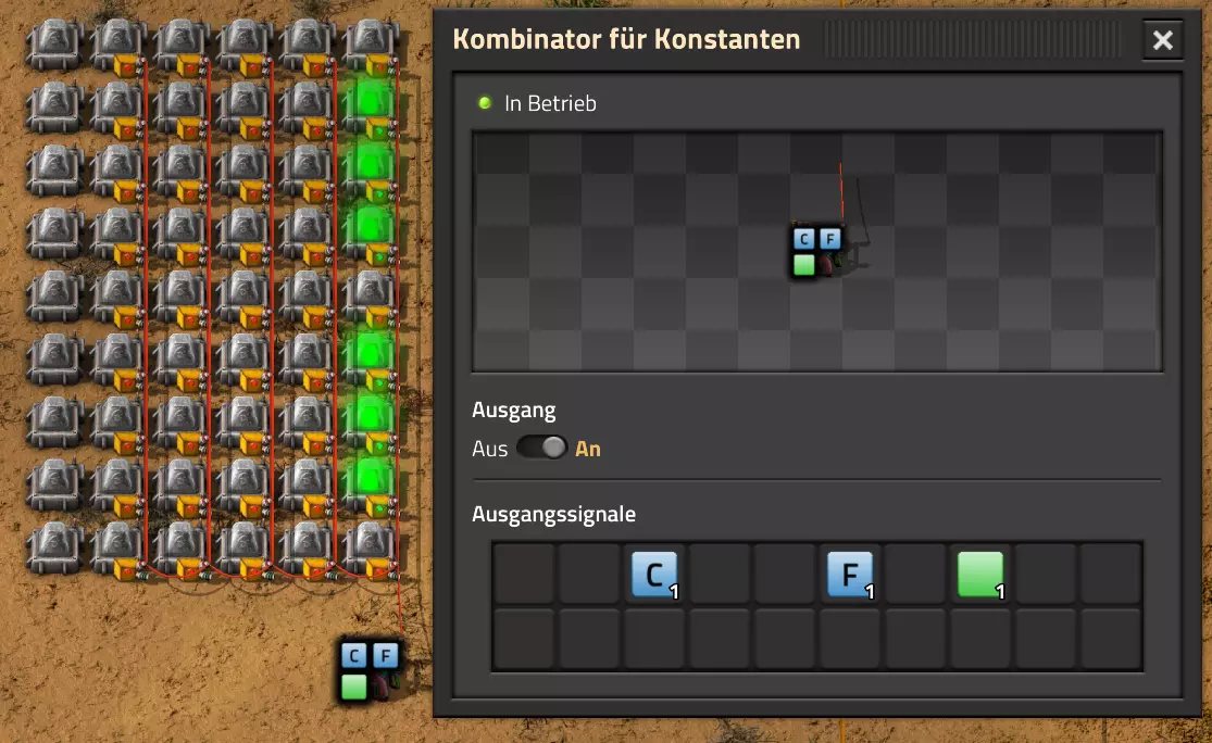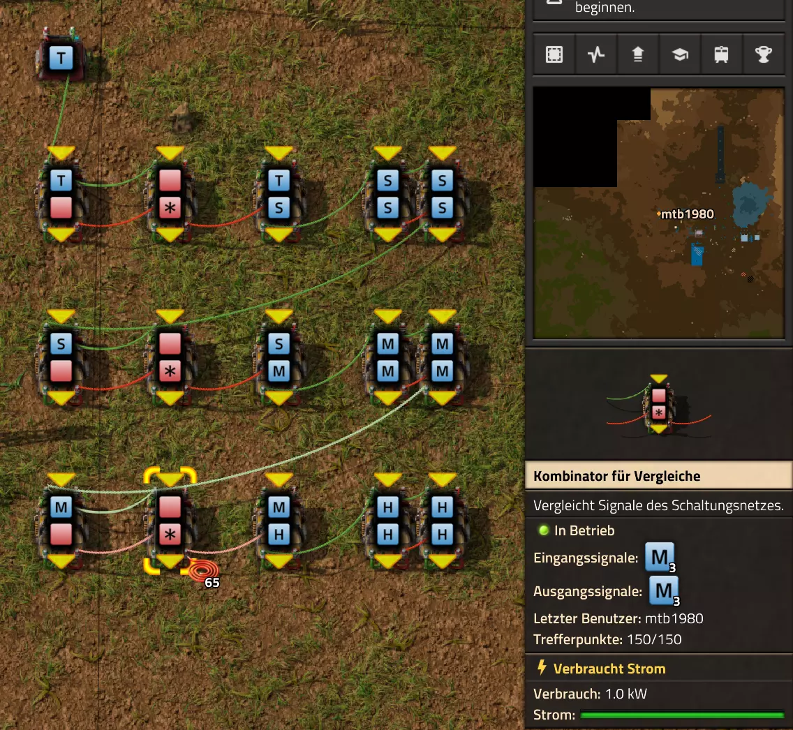 Ich habe hier zu Testzwecken mehrere verbundene Lagertanks aufgebaut. Da der rechte Tankblock nur passiv über ein Untergrundrohr aber nicht mit einer Pumpte versorgt wird, füllt sich der rechte Bereich langsamer. Zwischen den beiden Tanks habe ich 12 Lampen-Reihen hingestellt: Eine für Null und danach jeweils eine für 10-90%. Die zweite Reihe von oben verwendet eine Füllmenge von 98%, ganz oben 100%. Da es häufig wegen Rundungsfehlern nicht zu 100% kommt, habe ich mich für die 98% entschieden, 99% sollten aber ebenfalls funktionieren. Sollte es dennoch einmal auf 100% gehen, leuchtet die oberste Reihe weiß :) Wie habe ich das Ganze aufgebaut: 1. Alle Tanks mit einem Kabel, beispielsweise Grün, verbinden 2. Einen Dreisatz aufziehen und den Prozentsatz der Lagermenge errechnen (siehe Lampen-Einführung weiter oben): Konstanter Kombinator: A entspricht der Anzahl der Tanks (in meinem Fall 25), E der Lagermenge pro Tank (25.000). Berechnender Kombinator 1: Rechne A (Anzahl) mal E (Einzellagermenge), das Ergebnis ist G (Gesamtmenge) Berechnender Kombinator 2: Rechne den Tankinhalt (gelber Stern) mal 100, Ergebnis ist Z (Zwischenergebnis) Berechnender Kombinator 3: Rechne das Z (Zwischenergebnis) dividiert durch G (Gesamtmenge). Das Ergebnis ist P (Prozent) Nun habe ich mit dem grünen Kabel alle Lampen verbunden. Ausnahme ist hier nur die unterste Reihe, die immer rot leuchten soll. Die Einstellung pro Zeile entspricht von oben nach unten: Wenn Z = 100 Wenn Z >= 98 Wenn Z >= 90 Wenn Z >= 80 Wenn Z >= 70 Wenn Z >= 60 Wenn Z >= 50 Wenn Z >= 40 Wenn Z >= 30 Wenn Z >= 20 Wenn Z >= 10 Die unterste Reihe leuchtet immer und sagt Null Prozent aus. Um die Lampen einzufärben habe ich mich rechts der Lampen für einige konstante Kombinatoren entschieden. Diese senden die entsprechende Farbe an die mit der anderen Kabelfarbe verbundenen Lampen. In meinem Fall hatte ich die Prozentmenge mit dem grünen Kabel verbunden, daher habe ich für die Farben das rote Kabel verwendet, da Rot jede andere Farbe überschreiben würde, wenn diese im gleichen Schaltungsnetz liegen würde. Hier noch der Import-Code zu diesem Beispiel: 0eNrlXN1uo1YQfhcuK7zl/B8s9aIX1d7udapVRBw2QbXBwpA2WvkB+iB9sT5JATexc5jZnAGMSvcmku1hGL4zP9/MOeRrcLet032Z5VWw/hpkmyI/BOtfvwaH7CFPtu131fM+DdZBVqW7IAzyZNd+OlRFmTykqyrJfwuOYZDl9+kfwZodP4dBmldZlaUnPd2H59u83t2lZSPwqmGf7ZvLi9VDWdT5faN5Xxyay4q8vWerSnxQYfAcrFeMf1DHY9jTxf11xe/pEt66uHxPlzyjVN8dqqS7uG8TP2mxDXp5mj083hV12WKmQ24/A2rVq9p2kRrgq9Wm2N1ledKsBaDfvNhpGzPD4D4r083p98bARkVVFtvbu/Qxecqa65uLvmTbKi2R5X/Kyqpuvjk/Wyex+rld/U0DVdUt7tkPuq/z/HTPQ6uJtX/K9P7SL7LmE2ulISC1F5A8PgMJ3fGhTNPcvae5uF1ng2ltcFZChiZUEloL42WZVAMs045lHLJMh8ZAdtkB4aV77gEojgfEmpdiFg2IPD/NF7mm3u2/BYFffGyyclNn1W3z2/2rni9ZeahuqeFyit9gHbUfdvuk7GJ4HfwUHP3jRrk+zJE4Yvw9JOJlI9FkEAcKgUEh3oHi7GQLhQJ1AgkX774zvCLAuzDzzlxMYbdWvrc2b299AT+nGCJdd9CYZdrTMh4NBwWqNJAtxtcWMQ1KbqVxPwvUlfzLDFcvtgrXVg1pPteZwy7ZblfbBApSwXqrcZXAvHkbmCzyD00Qcs5diLE8xf3L4hmMHsQc0sz8IBaLhRhBlPs9N1/mc7PY5Y0Yq+b+vc4ZDK/o5b4lRg7NpryXo2LsKZX/U1paAPnWDDlNnuYS7Aggy3wriNQD8XfbJo4VVm4pTXDU77zgvovHVBITjYFeRM7zSszdRESlOBHR8934Flh8C0blNNNihNIGwakEh4gRM94YCSLPYFctBp/eFoPYOrXg7z//aiXqQ9rcZlu0IVKVderfFQjbDub8CkcrC4MmiaBFs4IWTQ6aS92lQFEEZWEUFZGHLB1Ft3wJjaMIycIoaiKL/b/5ojD+vigwwiAMEcWlp0EN5DoMRe2dFy0xopeOogG6WAxF4e2LMbV5iCZl1TJCDJMRle8TaYtwK7DEaItkVII/CiPpUjstMcM4jRrMGgFm8mwsFerw0k2+CithkshBZ61g9vo8QEp/HiBRx5O03LtwEKWbTiVOA0BZGEQiJV169LpTWIkzUlAWBpHISJefAp3aEPnnRNwTiYR06eHcy3M4H+3Lop5oaSdFhMLIwpQHRU4PNfqwCO465NGgGDmBUxhjVORhoBhF03qGYfxRkUeDRIyUyxgVNgxU5GHgKIyUe0JAY92cErTo4S9Um891zKrd2ngNnZCg5Jc3SqJ2y+lfPZwSgrqJtJf02k0QMSQl5fyWgM7BIceclKJRZzFnmVCTlwnljiKUdb4wHK0boCy8XpqGKp8TVT09qr1OzfjTQIWVIWVoXHrpIGp/GgjKwiASJ2pLj++eJ8Y4iJAsDGJM49JLB9HNc5r550TUE3VEA3Hp4Wz8W+OeLOqJmg1sSMQ1KdVzut0Wv4/vSPDH5tSJNpFta2yPUQvqyHoUudbcd06sJXWATYRE9ng+ipGi9ot6FEZYt641tVnURC/pTWow7qINtT0cC4lnT6YttVkkYqR4HyOHNVu/pkefq25SZtXjLq2yjV8D6ZfrzlrPpeQw9ND5IW113NI6yGKflqdebh380IgUdbWvCXf+GBwpbzmILhlz5OdusumxLiYir8vLsUA967rcDFmXj+66/DhgXT6R1sWdAvB3AoaflxE+WoiVUcNobamak4KJySmYwbfFjDsCthhtNcT9WDknZvL6DZQR/g2UwRiCEbQudOEgml4E49wflIVBJG7QLj16Xf5p8KMCoCwMoqJ1octPgU6eI+RE3BOJG7RLD2c8BRrh7XikF521O8JHX5+2g0mynZWMpcnm8YKPOe/rjCXCNzjhghsmOw0VJr5kZ+YMBDZ5IFh3T9LimyUuhBy4FMTURjRM9ZyY8umTi7vlbJl/mbOYY1pG4woLB7HvmHiZA2VhEInvOS48uvue+I26B8nCIAoaV1h6iuzlOZy19mVRT5Q0EJcezgTq35PFPVEN3Dsx19w7aR9/9MYJ/szEgwj2qo7Dhgzk2Amet+9zj/IubDZuiUcmvxOwnPDChouWeNLgu0DP3fuwWEtt44HJyf73k9Npk6xJ4N0/vltf/J+8MHhqbDptd1kmTcyNiA0zTByP/wDYo/WC Video-Guide: Füllstandsanzeige Spezial In diesem Video zeige ich eine Füllstandsanzeige mit einem kleinen aber feinen Zusatz: https://www.youtube.com/watch?v=HEPwed1yq_w Beispiel: Kisten gleichmäßig befüllen Schauen wir uns ein praktisches Beispiel an, wie wir Kisten gleichmäßig befüllen können. Unsere Ausgangssituation sieht so aus:
