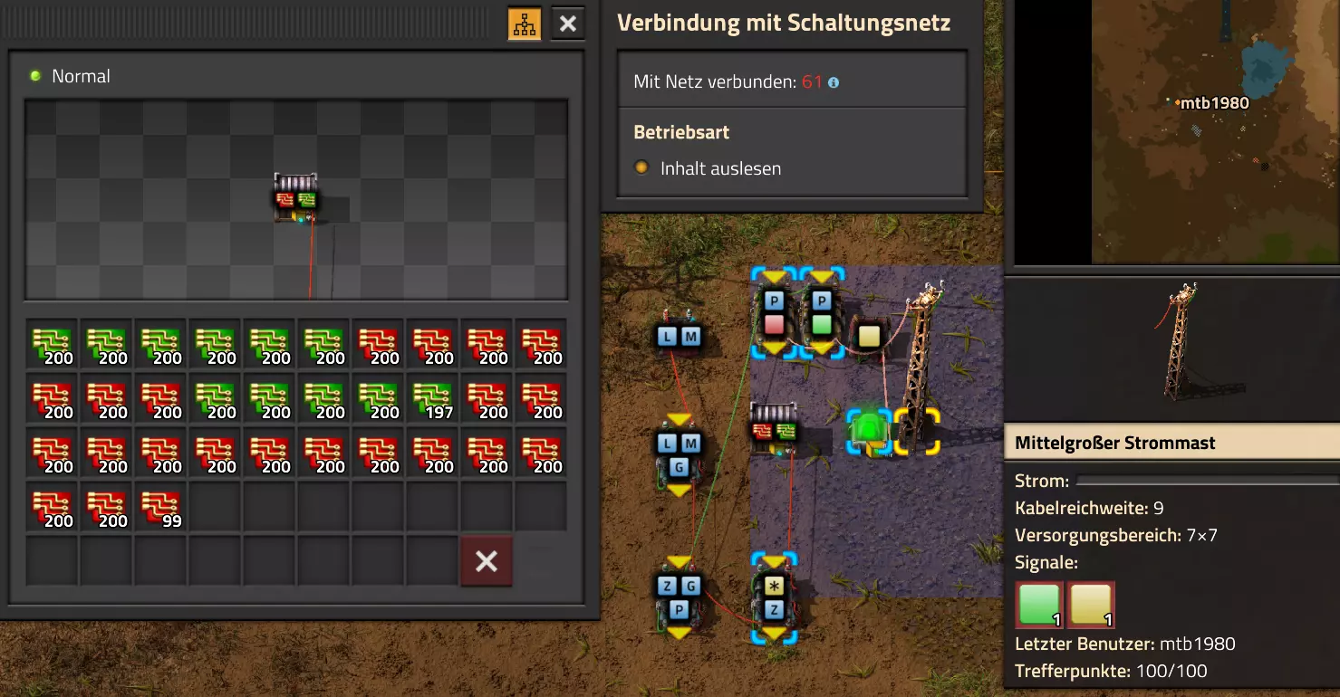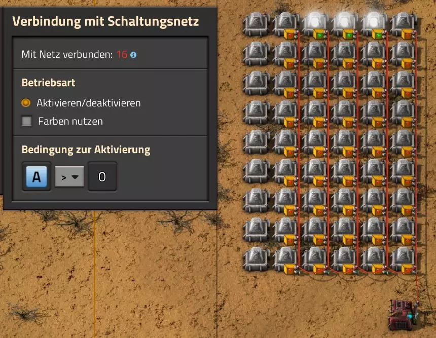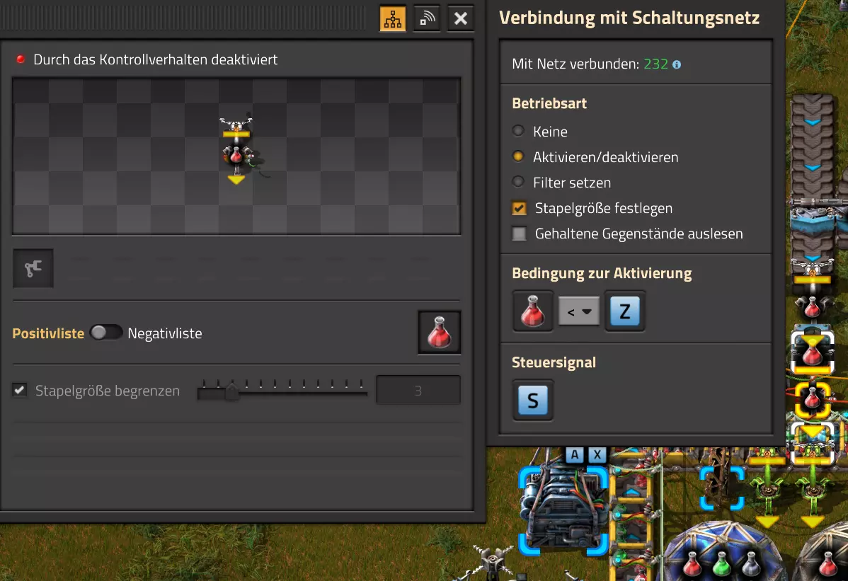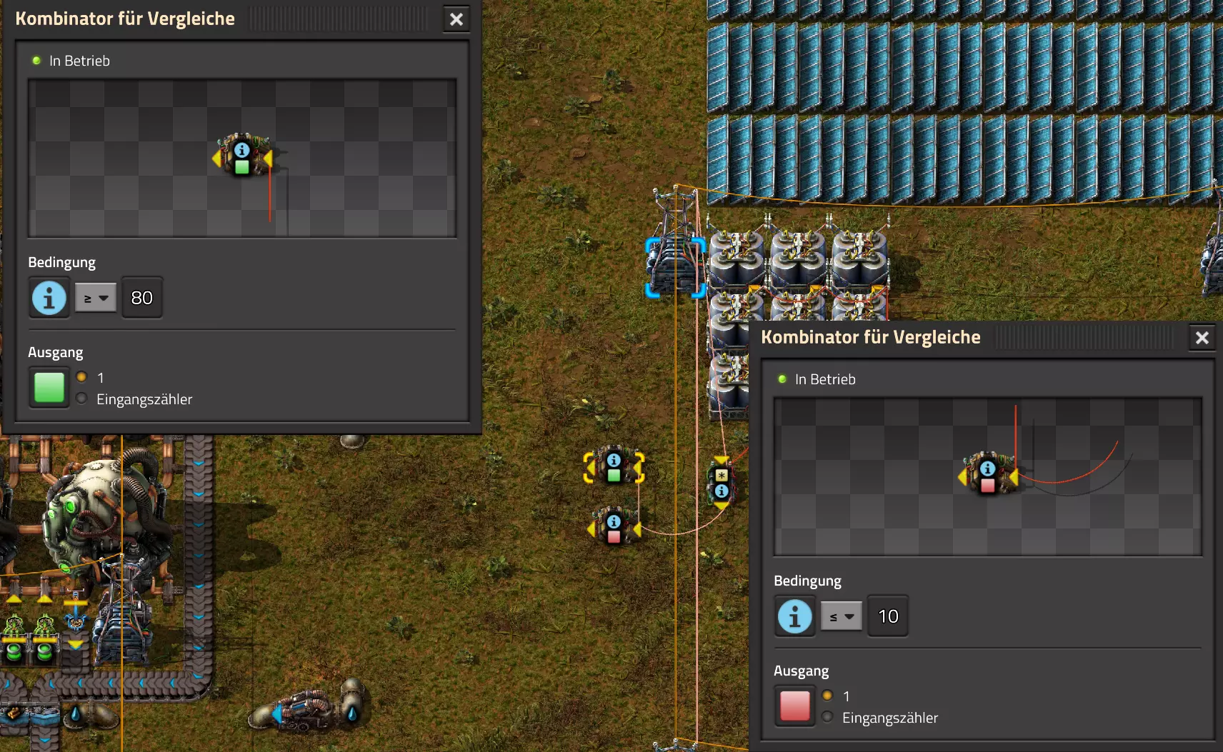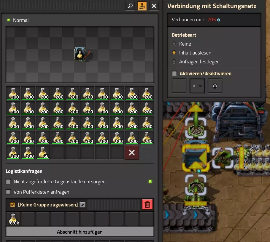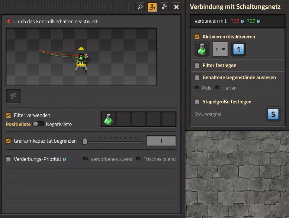 Ich habe hier zu Testzwecken mehrere verbundene Lagertanks aufgebaut. Da der rechte Tankblock nur passiv über ein Untergrundrohr aber nicht mit einer Pumpte versorgt wird, füllt sich der rechte Bereich langsamer. Zwischen den beiden Tanks habe ich 12 Lampen-Reihen hingestellt: Eine für Null und danach jeweils eine für 10-90%. Die zweite Reihe von oben verwendet eine Füllmenge von 98%, ganz oben 100%. Da es häufig wegen Rundungsfehlern nicht zu 100% kommt, habe ich mich für die 98% entschieden, 99% sollten aber ebenfalls funktionieren. Sollte es dennoch einmal auf 100% gehen, leuchtet die oberste Reihe weiß :) Wie habe ich das Ganze aufgebaut: 1. Alle Tanks mit einem Kabel, beispielsweise Grün, verbinden 2. Einen Dreisatz aufziehen und den Prozentsatz der Lagermenge errechnen (siehe Lampen-Einführung weiter oben): Konstanter Kombinator: A entspricht der Anzahl der Tanks (in meinem Fall 25), E der Lagermenge pro Tank (25.000). Berechnender Kombinator 1: Rechne A (Anzahl) mal E (Einzellagermenge), das Ergebnis ist G (Gesamtmenge) Berechnender Kombinator 2: Rechne den Tankinhalt (gelber Stern) mal 100, Ergebnis ist Z (Zwischenergebnis) Berechnender Kombinator 3: Rechne das Z (Zwischenergebnis) dividiert durch G (Gesamtmenge). Das Ergebnis ist P (Prozent) Nun habe ich mit dem grünen Kabel alle Lampen verbunden. Ausnahme ist hier nur die unterste Reihe, die immer rot leuchten soll. Die Einstellung pro Zeile entspricht von oben nach unten: Wenn Z = 100 Wenn Z >= 98 Wenn Z >= 90 Wenn Z >= 80 Wenn Z >= 70 Wenn Z >= 60 Wenn Z >= 50 Wenn Z >= 40 Wenn Z >= 30 Wenn Z >= 20 Wenn Z >= 10 Die unterste Reihe leuchtet immer und sagt Null Prozent aus. Um die Lampen einzufärben habe ich mich rechts der Lampen für einige konstante Kombinatoren entschieden. Diese senden die entsprechende Farbe an die mit der anderen Kabelfarbe verbundenen Lampen. In meinem Fall hatte ich die Prozentmenge mit dem grünen Kabel verbunden, daher habe ich für die Farben das rote Kabel verwendet, da Rot jede andere Farbe überschreiben würde, wenn diese im gleichen Schaltungsnetz liegen würde. Hier noch der Import-Code zu diesem Beispiel: 0eNrlXN1uo1YQfhcuK7zl/B8s9aIX1d7udapVRBw2QbXBwpA2WvkB+iB9sT5JATexc5jZnAGMSvcmku1hGL4zP9/MOeRrcLet032Z5VWw/hpkmyI/BOtfvwaH7CFPtu131fM+DdZBVqW7IAzyZNd+OlRFmTykqyrJfwuOYZDl9+kfwZodP4dBmldZlaUnPd2H59u83t2lZSPwqmGf7ZvLi9VDWdT5faN5Xxyay4q8vWerSnxQYfAcrFeMf1DHY9jTxf11xe/pEt66uHxPlzyjVN8dqqS7uG8TP2mxDXp5mj083hV12WKmQ24/A2rVq9p2kRrgq9Wm2N1ledKsBaDfvNhpGzPD4D4r083p98bARkVVFtvbu/Qxecqa65uLvmTbKi2R5X/Kyqpuvjk/Wyex+rld/U0DVdUt7tkPuq/z/HTPQ6uJtX/K9P7SL7LmE2ulISC1F5A8PgMJ3fGhTNPcvae5uF1ng2ltcFZChiZUEloL42WZVAMs045lHLJMh8ZAdtkB4aV77gEojgfEmpdiFg2IPD/NF7mm3u2/BYFffGyyclNn1W3z2/2rni9ZeahuqeFyit9gHbUfdvuk7GJ4HfwUHP3jRrk+zJE4Yvw9JOJlI9FkEAcKgUEh3oHi7GQLhQJ1AgkX774zvCLAuzDzzlxMYbdWvrc2b299AT+nGCJdd9CYZdrTMh4NBwWqNJAtxtcWMQ1KbqVxPwvUlfzLDFcvtgrXVg1pPteZwy7ZblfbBApSwXqrcZXAvHkbmCzyD00Qcs5diLE8xf3L4hmMHsQc0sz8IBaLhRhBlPs9N1/mc7PY5Y0Yq+b+vc4ZDK/o5b4lRg7NpryXo2LsKZX/U1paAPnWDDlNnuYS7Aggy3wriNQD8XfbJo4VVm4pTXDU77zgvovHVBITjYFeRM7zSszdRESlOBHR8934Flh8C0blNNNihNIGwakEh4gRM94YCSLPYFctBp/eFoPYOrXg7z//aiXqQ9rcZlu0IVKVderfFQjbDub8CkcrC4MmiaBFs4IWTQ6aS92lQFEEZWEUFZGHLB1Ft3wJjaMIycIoaiKL/b/5ojD+vigwwiAMEcWlp0EN5DoMRe2dFy0xopeOogG6WAxF4e2LMbV5iCZl1TJCDJMRle8TaYtwK7DEaItkVII/CiPpUjstMcM4jRrMGgFm8mwsFerw0k2+CithkshBZ61g9vo8QEp/HiBRx5O03LtwEKWbTiVOA0BZGEQiJV169LpTWIkzUlAWBpHISJefAp3aEPnnRNwTiYR06eHcy3M4H+3Lop5oaSdFhMLIwpQHRU4PNfqwCO465NGgGDmBUxhjVORhoBhF03qGYfxRkUeDRIyUyxgVNgxU5GHgKIyUe0JAY92cErTo4S9Um891zKrd2ngNnZCg5Jc3SqJ2y+lfPZwSgrqJtJf02k0QMSQl5fyWgM7BIceclKJRZzFnmVCTlwnljiKUdb4wHK0boCy8XpqGKp8TVT09qr1OzfjTQIWVIWVoXHrpIGp/GgjKwiASJ2pLj++eJ8Y4iJAsDGJM49JLB9HNc5r550TUE3VEA3Hp4Wz8W+OeLOqJmg1sSMQ1KdVzut0Wv4/vSPDH5tSJNpFta2yPUQvqyHoUudbcd06sJXWATYRE9ng+ipGi9ot6FEZYt641tVnURC/pTWow7qINtT0cC4lnT6YttVkkYqR4HyOHNVu/pkefq25SZtXjLq2yjV8D6ZfrzlrPpeQw9ND5IW113NI6yGKflqdebh380IgUdbWvCXf+GBwpbzmILhlz5OdusumxLiYir8vLsUA967rcDFmXj+66/DhgXT6R1sWdAvB3AoaflxE+WoiVUcNobamak4KJySmYwbfFjDsCthhtNcT9WDknZvL6DZQR/g2UwRiCEbQudOEgml4E49wflIVBJG7QLj16Xf5p8KMCoCwMoqJ1octPgU6eI+RE3BOJG7RLD2c8BRrh7XikF521O8JHX5+2g0mynZWMpcnm8YKPOe/rjCXCNzjhghsmOw0VJr5kZ+YMBDZ5IFh3T9LimyUuhBy4FMTURjRM9ZyY8umTi7vlbJl/mbOYY1pG4woLB7HvmHiZA2VhEInvOS48uvue+I26B8nCIAoaV1h6iuzlOZy19mVRT5Q0EJcezgTq35PFPVEN3Dsx19w7aR9/9MYJ/szEgwj2qo7Dhgzk2Amet+9zj/IubDZuiUcmvxOwnPDChouWeNLgu0DP3fuwWEtt44HJyf73k9Npk6xJ4N0/vltf/J+8MHhqbDptd1kmTcyNiA0zTByP/wDYo/WC Video-Guide: Füllstandsanzeige Spezial In diesem Video zeige ich eine Füllstandsanzeige mit einem kleinen aber feinen Zusatz: https://www.youtube.com/watch?v=HEPwed1yq_w Beispiel: Kisten gleichmäßig befüllen Schauen wir uns ein praktisches Beispiel an, wie wir Kisten gleichmäßig befüllen können. Unsere Ausgangssituation sieht so aus: