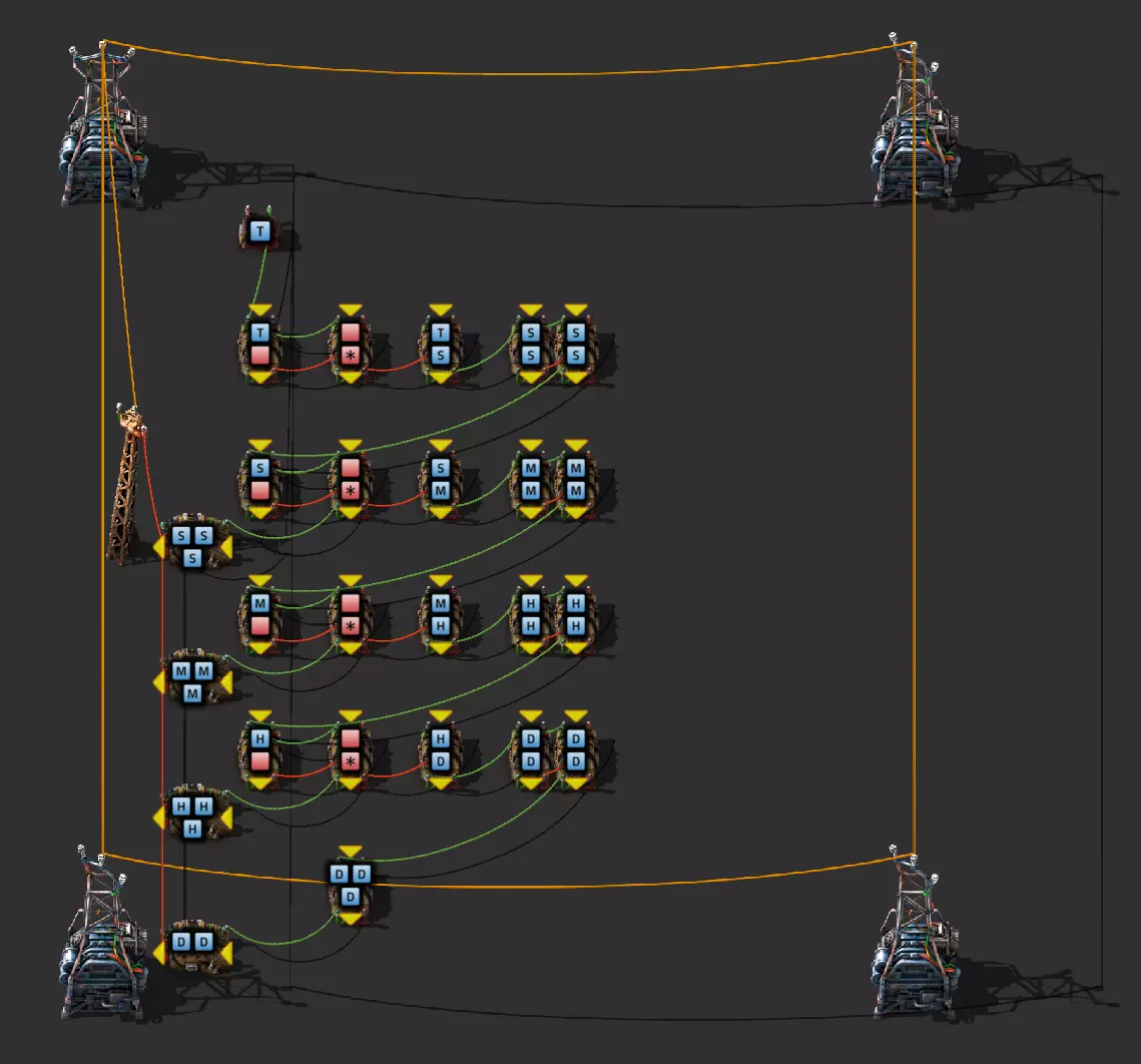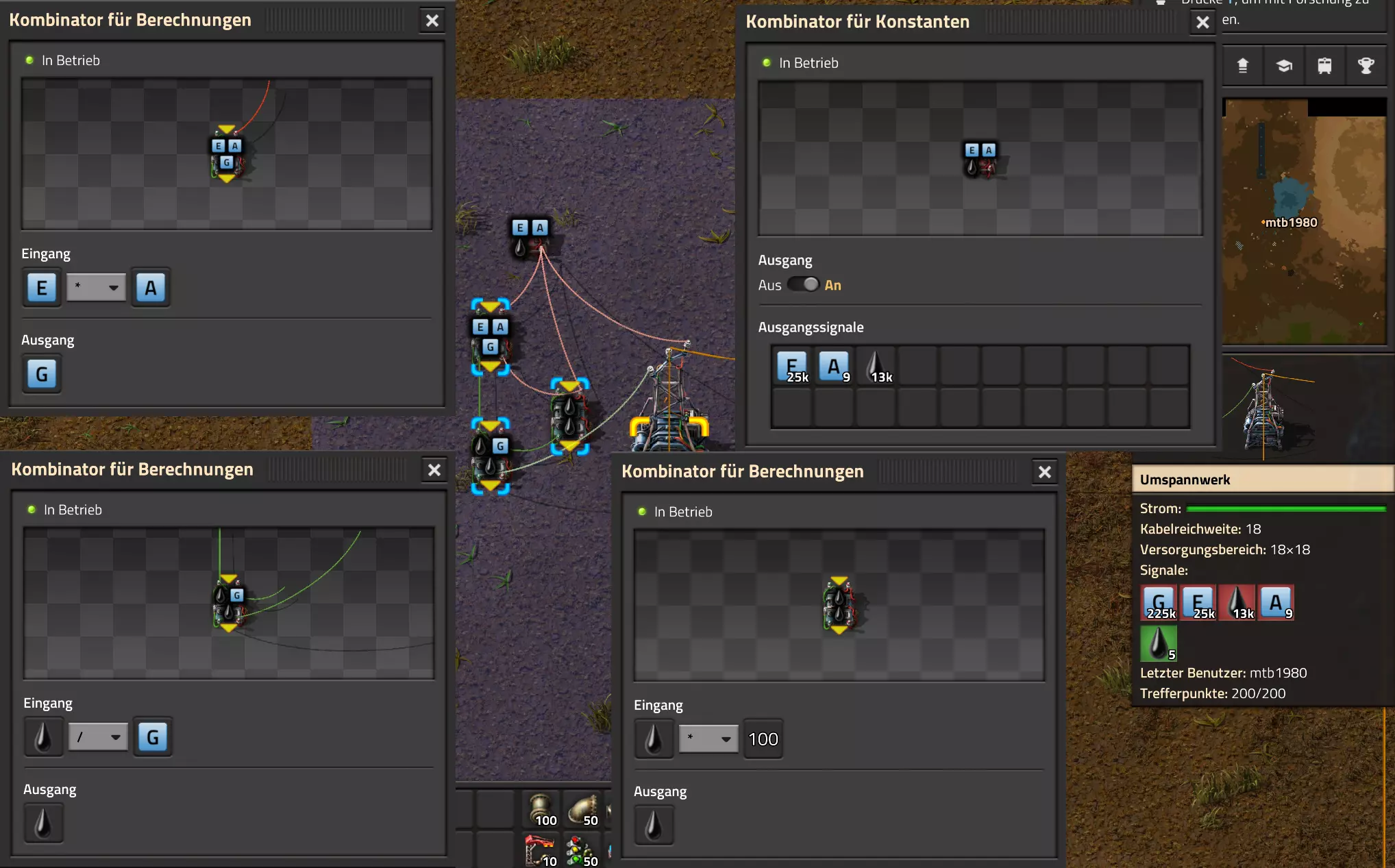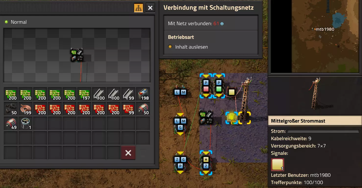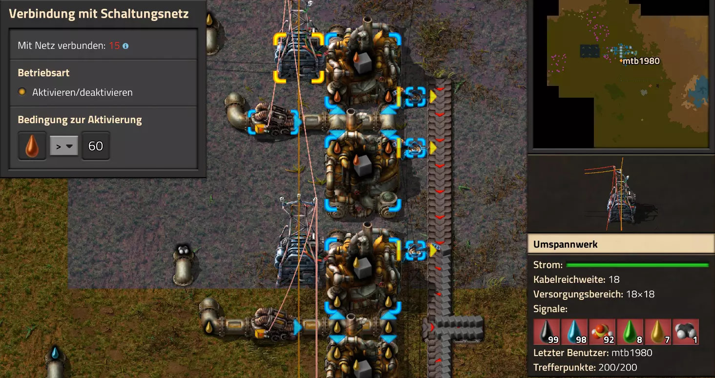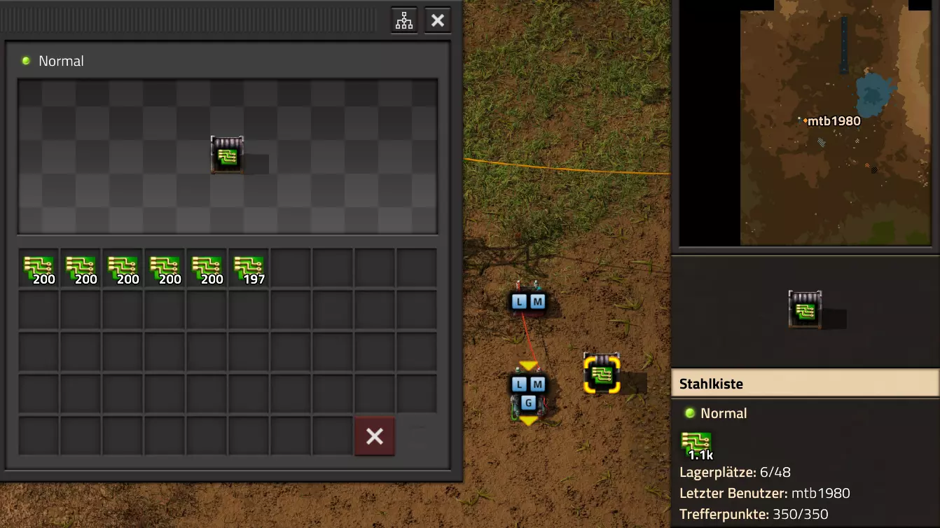 Ich habe hier zu Testzwecken mehrere verbundene Lagertanks aufgebaut. Da der rechte Tankblock nur passiv über ein Untergrundrohr aber nicht mit einer Pumpte versorgt wird, füllt sich der rechte Bereich langsamer. Zwischen den beiden Tanks habe ich 12 Lampen-Reihen hingestellt: Eine für Null und danach jeweils eine für 10-90%. Die zweite Reihe von oben verwendet eine Füllmenge von 98%, ganz oben 100%. Da es häufig wegen Rundungsfehlern nicht zu 100% kommt, habe ich mich für die 98% entschieden, 99% sollten aber ebenfalls funktionieren. Sollte es dennoch einmal auf 100% gehen, leuchtet die oberste Reihe weiß :) Wie habe ich das Ganze aufgebaut: 1. Alle Tanks mit einem Kabel, beispielsweise Grün, verbinden 2. Einen Dreisatz aufziehen und den Prozentsatz der Lagermenge errechnen (siehe Lampen-Einführung weiter oben): Konstanter Kombinator: A entspricht der Anzahl der Tanks (in meinem Fall 25), E der Lagermenge pro Tank (25.000). Berechnender Kombinator 1: Rechne A (Anzahl) mal E (Einzellagermenge), das Ergebnis ist G (Gesamtmenge) Berechnender Kombinator 2: Rechne den Tankinhalt (gelber Stern) mal 100, Ergebnis ist Z (Zwischenergebnis) Berechnender Kombinator 3: Rechne das Z (Zwischenergebnis) dividiert durch G (Gesamtmenge). Das Ergebnis ist P (Prozent) Nun habe ich mit dem grünen Kabel alle Lampen verbunden. Ausnahme ist hier nur die unterste Reihe, die immer rot leuchten soll. Die Einstellung pro Zeile entspricht von oben nach unten: Wenn Z = 100 Wenn Z >= 98 Wenn Z >= 90 Wenn Z >= 80 Wenn Z >= 70 Wenn Z >= 60 Wenn Z >= 50 Wenn Z >= 40 Wenn Z >= 30 Wenn Z >= 20 Wenn Z >= 10 Die unterste Reihe leuchtet immer und sagt Null Prozent aus. Um die Lampen einzufärben habe ich mich rechts der Lampen für einige konstante Kombinatoren entschieden. Diese senden die entsprechende Farbe an die mit der anderen Kabelfarbe verbundenen Lampen. In meinem Fall hatte ich die Prozentmenge mit dem grünen Kabel verbunden, daher habe ich für die Farben das rote Kabel verwendet, da Rot jede andere Farbe überschreiben würde, wenn diese im gleichen Schaltungsnetz liegen würde. Hier noch der Import-Code zu diesem Beispiel: 0eNrlXN1uo1YQfhcuK7zl/B8s9aIX1d7udapVRBw2QbXBwpA2WvkB+iB9sT5JATexc5jZnAGMSvcmku1hGL4zP9/MOeRrcLet032Z5VWw/hpkmyI/BOtfvwaH7CFPtu131fM+DdZBVqW7IAzyZNd+OlRFmTykqyrJfwuOYZDl9+kfwZodP4dBmldZlaUnPd2H59u83t2lZSPwqmGf7ZvLi9VDWdT5faN5Xxyay4q8vWerSnxQYfAcrFeMf1DHY9jTxf11xe/pEt66uHxPlzyjVN8dqqS7uG8TP2mxDXp5mj083hV12WKmQ24/A2rVq9p2kRrgq9Wm2N1ledKsBaDfvNhpGzPD4D4r083p98bARkVVFtvbu/Qxecqa65uLvmTbKi2R5X/Kyqpuvjk/Wyex+rld/U0DVdUt7tkPuq/z/HTPQ6uJtX/K9P7SL7LmE2ulISC1F5A8PgMJ3fGhTNPcvae5uF1ng2ltcFZChiZUEloL42WZVAMs045lHLJMh8ZAdtkB4aV77gEojgfEmpdiFg2IPD/NF7mm3u2/BYFffGyyclNn1W3z2/2rni9ZeahuqeFyit9gHbUfdvuk7GJ4HfwUHP3jRrk+zJE4Yvw9JOJlI9FkEAcKgUEh3oHi7GQLhQJ1AgkX774zvCLAuzDzzlxMYbdWvrc2b299AT+nGCJdd9CYZdrTMh4NBwWqNJAtxtcWMQ1KbqVxPwvUlfzLDFcvtgrXVg1pPteZwy7ZblfbBApSwXqrcZXAvHkbmCzyD00Qcs5diLE8xf3L4hmMHsQc0sz8IBaLhRhBlPs9N1/mc7PY5Y0Yq+b+vc4ZDK/o5b4lRg7NpryXo2LsKZX/U1paAPnWDDlNnuYS7Aggy3wriNQD8XfbJo4VVm4pTXDU77zgvovHVBITjYFeRM7zSszdRESlOBHR8934Flh8C0blNNNihNIGwakEh4gRM94YCSLPYFctBp/eFoPYOrXg7z//aiXqQ9rcZlu0IVKVderfFQjbDub8CkcrC4MmiaBFs4IWTQ6aS92lQFEEZWEUFZGHLB1Ft3wJjaMIycIoaiKL/b/5ojD+vigwwiAMEcWlp0EN5DoMRe2dFy0xopeOogG6WAxF4e2LMbV5iCZl1TJCDJMRle8TaYtwK7DEaItkVII/CiPpUjstMcM4jRrMGgFm8mwsFerw0k2+CithkshBZ61g9vo8QEp/HiBRx5O03LtwEKWbTiVOA0BZGEQiJV169LpTWIkzUlAWBpHISJefAp3aEPnnRNwTiYR06eHcy3M4H+3Lop5oaSdFhMLIwpQHRU4PNfqwCO465NGgGDmBUxhjVORhoBhF03qGYfxRkUeDRIyUyxgVNgxU5GHgKIyUe0JAY92cErTo4S9Um891zKrd2ngNnZCg5Jc3SqJ2y+lfPZwSgrqJtJf02k0QMSQl5fyWgM7BIceclKJRZzFnmVCTlwnljiKUdb4wHK0boCy8XpqGKp8TVT09qr1OzfjTQIWVIWVoXHrpIGp/GgjKwiASJ2pLj++eJ8Y4iJAsDGJM49JLB9HNc5r550TUE3VEA3Hp4Wz8W+OeLOqJmg1sSMQ1KdVzut0Wv4/vSPDH5tSJNpFta2yPUQvqyHoUudbcd06sJXWATYRE9ng+ipGi9ot6FEZYt641tVnURC/pTWow7qINtT0cC4lnT6YttVkkYqR4HyOHNVu/pkefq25SZtXjLq2yjV8D6ZfrzlrPpeQw9ND5IW113NI6yGKflqdebh380IgUdbWvCXf+GBwpbzmILhlz5OdusumxLiYir8vLsUA967rcDFmXj+66/DhgXT6R1sWdAvB3AoaflxE+WoiVUcNobamak4KJySmYwbfFjDsCthhtNcT9WDknZvL6DZQR/g2UwRiCEbQudOEgml4E49wflIVBJG7QLj16Xf5p8KMCoCwMoqJ1octPgU6eI+RE3BOJG7RLD2c8BRrh7XikF521O8JHX5+2g0mynZWMpcnm8YKPOe/rjCXCNzjhghsmOw0VJr5kZ+YMBDZ5IFh3T9LimyUuhBy4FMTURjRM9ZyY8umTi7vlbJl/mbOYY1pG4woLB7HvmHiZA2VhEInvOS48uvue+I26B8nCIAoaV1h6iuzlOZy19mVRT5Q0EJcezgTq35PFPVEN3Dsx19w7aR9/9MYJ/szEgwj2qo7Dhgzk2Amet+9zj/IubDZuiUcmvxOwnPDChouWeNLgu0DP3fuwWEtt44HJyf73k9Npk6xJ4N0/vltf/J+8MHhqbDptd1kmTcyNiA0zTByP/wDYo/WC Video-Guide: Füllstandsanzeige Spezial In diesem Video zeige ich eine Füllstandsanzeige mit einem kleinen aber feinen Zusatz: https://www.youtube.com/watch?v=HEPwed1yq_w Beispiel: Kisten gleichmäßig befüllen Schauen wir uns ein praktisches Beispiel an, wie wir Kisten gleichmäßig befüllen können. Unsere Ausgangssituation sieht so aus: