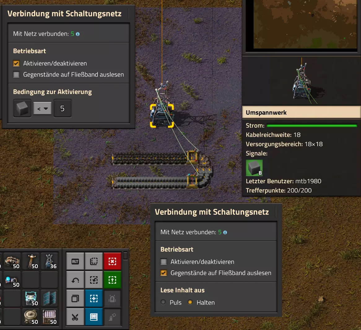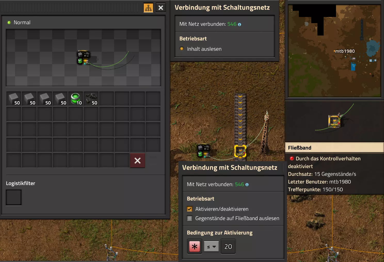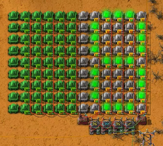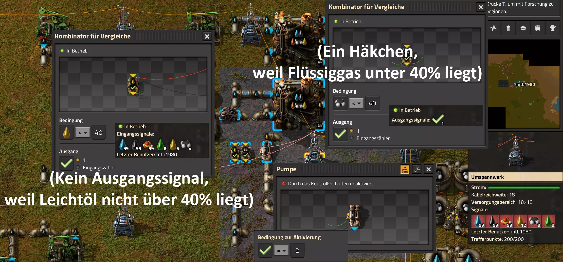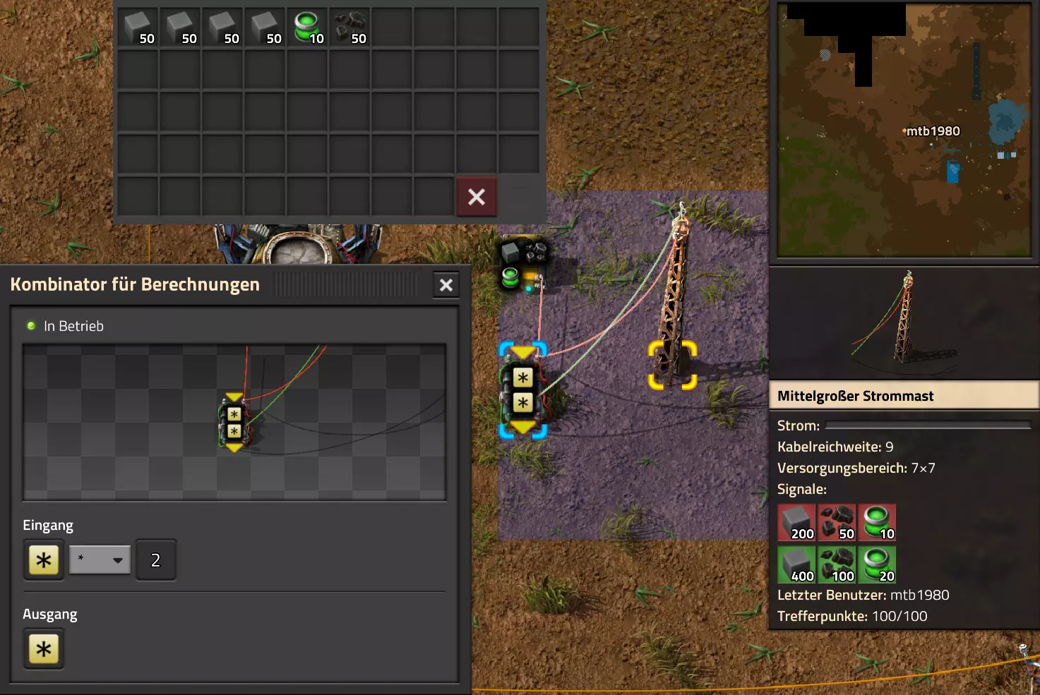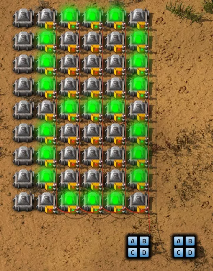 Ich habe hier zu Testzwecken mehrere verbundene Lagertanks aufgebaut. Da der rechte Tankblock nur passiv über ein Untergrundrohr aber nicht mit einer Pumpte versorgt wird, füllt sich der rechte Bereich langsamer. Zwischen den beiden Tanks habe ich 12 Lampen-Reihen hingestellt: Eine für Null und danach jeweils eine für 10-90%. Die zweite Reihe von oben verwendet eine Füllmenge von 98%, ganz oben 100%. Da es häufig wegen Rundungsfehlern nicht zu 100% kommt, habe ich mich für die 98% entschieden, 99% sollten aber ebenfalls funktionieren. Sollte es dennoch einmal auf 100% gehen, leuchtet die oberste Reihe weiß :) Wie habe ich das Ganze aufgebaut: 1. Alle Tanks mit einem Kabel, beispielsweise Grün, verbinden 2. Einen Dreisatz aufziehen und den Prozentsatz der Lagermenge errechnen (siehe Lampen-Einführung weiter oben): Konstanter Kombinator: A entspricht der Anzahl der Tanks (in meinem Fall 25), E der Lagermenge pro Tank (25.000). Berechnender Kombinator 1: Rechne A (Anzahl) mal E (Einzellagermenge), das Ergebnis ist G (Gesamtmenge) Berechnender Kombinator 2: Rechne den Tankinhalt (gelber Stern) mal 100, Ergebnis ist Z (Zwischenergebnis) Berechnender Kombinator 3: Rechne das Z (Zwischenergebnis) dividiert durch G (Gesamtmenge). Das Ergebnis ist P (Prozent) Nun habe ich mit dem grünen Kabel alle Lampen verbunden. Ausnahme ist hier nur die unterste Reihe, die immer rot leuchten soll. Die Einstellung pro Zeile entspricht von oben nach unten: Wenn Z = 100 Wenn Z >= 98 Wenn Z >= 90 Wenn Z >= 80 Wenn Z >= 70 Wenn Z >= 60 Wenn Z >= 50 Wenn Z >= 40 Wenn Z >= 30 Wenn Z >= 20 Wenn Z >= 10 Die unterste Reihe leuchtet immer und sagt Null Prozent aus. Um die Lampen einzufärben habe ich mich rechts der Lampen für einige konstante Kombinatoren entschieden. Diese senden die entsprechende Farbe an die mit der anderen Kabelfarbe verbundenen Lampen. In meinem Fall hatte ich die Prozentmenge mit dem grünen Kabel verbunden, daher habe ich für die Farben das rote Kabel verwendet, da Rot jede andere Farbe überschreiben würde, wenn diese im gleichen Schaltungsnetz liegen würde. Hier noch der Import-Code zu diesem Beispiel: 0eNrlXN1uo1YQfhcuK7zl/B8s9aIX1d7udapVRBw2QbXBwpA2WvkB+iB9sT5JATexc5jZnAGMSvcmku1hGL4zP9/MOeRrcLet032Z5VWw/hpkmyI/BOtfvwaH7CFPtu131fM+DdZBVqW7IAzyZNd+OlRFmTykqyrJfwuOYZDl9+kfwZodP4dBmldZlaUnPd2H59u83t2lZSPwqmGf7ZvLi9VDWdT5faN5Xxyay4q8vWerSnxQYfAcrFeMf1DHY9jTxf11xe/pEt66uHxPlzyjVN8dqqS7uG8TP2mxDXp5mj083hV12WKmQ24/A2rVq9p2kRrgq9Wm2N1ledKsBaDfvNhpGzPD4D4r083p98bARkVVFtvbu/Qxecqa65uLvmTbKi2R5X/Kyqpuvjk/Wyex+rld/U0DVdUt7tkPuq/z/HTPQ6uJtX/K9P7SL7LmE2ulISC1F5A8PgMJ3fGhTNPcvae5uF1ng2ltcFZChiZUEloL42WZVAMs045lHLJMh8ZAdtkB4aV77gEojgfEmpdiFg2IPD/NF7mm3u2/BYFffGyyclNn1W3z2/2rni9ZeahuqeFyit9gHbUfdvuk7GJ4HfwUHP3jRrk+zJE4Yvw9JOJlI9FkEAcKgUEh3oHi7GQLhQJ1AgkX774zvCLAuzDzzlxMYbdWvrc2b299AT+nGCJdd9CYZdrTMh4NBwWqNJAtxtcWMQ1KbqVxPwvUlfzLDFcvtgrXVg1pPteZwy7ZblfbBApSwXqrcZXAvHkbmCzyD00Qcs5diLE8xf3L4hmMHsQc0sz8IBaLhRhBlPs9N1/mc7PY5Y0Yq+b+vc4ZDK/o5b4lRg7NpryXo2LsKZX/U1paAPnWDDlNnuYS7Aggy3wriNQD8XfbJo4VVm4pTXDU77zgvovHVBITjYFeRM7zSszdRESlOBHR8934Flh8C0blNNNihNIGwakEh4gRM94YCSLPYFctBp/eFoPYOrXg7z//aiXqQ9rcZlu0IVKVderfFQjbDub8CkcrC4MmiaBFs4IWTQ6aS92lQFEEZWEUFZGHLB1Ft3wJjaMIycIoaiKL/b/5ojD+vigwwiAMEcWlp0EN5DoMRe2dFy0xopeOogG6WAxF4e2LMbV5iCZl1TJCDJMRle8TaYtwK7DEaItkVII/CiPpUjstMcM4jRrMGgFm8mwsFerw0k2+CithkshBZ61g9vo8QEp/HiBRx5O03LtwEKWbTiVOA0BZGEQiJV169LpTWIkzUlAWBpHISJefAp3aEPnnRNwTiYR06eHcy3M4H+3Lop5oaSdFhMLIwpQHRU4PNfqwCO465NGgGDmBUxhjVORhoBhF03qGYfxRkUeDRIyUyxgVNgxU5GHgKIyUe0JAY92cErTo4S9Um891zKrd2ngNnZCg5Jc3SqJ2y+lfPZwSgrqJtJf02k0QMSQl5fyWgM7BIceclKJRZzFnmVCTlwnljiKUdb4wHK0boCy8XpqGKp8TVT09qr1OzfjTQIWVIWVoXHrpIGp/GgjKwiASJ2pLj++eJ8Y4iJAsDGJM49JLB9HNc5r550TUE3VEA3Hp4Wz8W+OeLOqJmg1sSMQ1KdVzut0Wv4/vSPDH5tSJNpFta2yPUQvqyHoUudbcd06sJXWATYRE9ng+ipGi9ot6FEZYt641tVnURC/pTWow7qINtT0cC4lnT6YttVkkYqR4HyOHNVu/pkefq25SZtXjLq2yjV8D6ZfrzlrPpeQw9ND5IW113NI6yGKflqdebh380IgUdbWvCXf+GBwpbzmILhlz5OdusumxLiYir8vLsUA967rcDFmXj+66/DhgXT6R1sWdAvB3AoaflxE+WoiVUcNobamak4KJySmYwbfFjDsCthhtNcT9WDknZvL6DZQR/g2UwRiCEbQudOEgml4E49wflIVBJG7QLj16Xf5p8KMCoCwMoqJ1octPgU6eI+RE3BOJG7RLD2c8BRrh7XikF521O8JHX5+2g0mynZWMpcnm8YKPOe/rjCXCNzjhghsmOw0VJr5kZ+YMBDZ5IFh3T9LimyUuhBy4FMTURjRM9ZyY8umTi7vlbJl/mbOYY1pG4woLB7HvmHiZA2VhEInvOS48uvue+I26B8nCIAoaV1h6iuzlOZy19mVRT5Q0EJcezgTq35PFPVEN3Dsx19w7aR9/9MYJ/szEgwj2qo7Dhgzk2Amet+9zj/IubDZuiUcmvxOwnPDChouWeNLgu0DP3fuwWEtt44HJyf73k9Npk6xJ4N0/vltf/J+8MHhqbDptd1kmTcyNiA0zTByP/wDYo/WC Video-Guide: Füllstandsanzeige Spezial In diesem Video zeige ich eine Füllstandsanzeige mit einem kleinen aber feinen Zusatz: https://www.youtube.com/watch?v=HEPwed1yq_w Beispiel: Kisten gleichmäßig befüllen Schauen wir uns ein praktisches Beispiel an, wie wir Kisten gleichmäßig befüllen können. Unsere Ausgangssituation sieht so aus:
