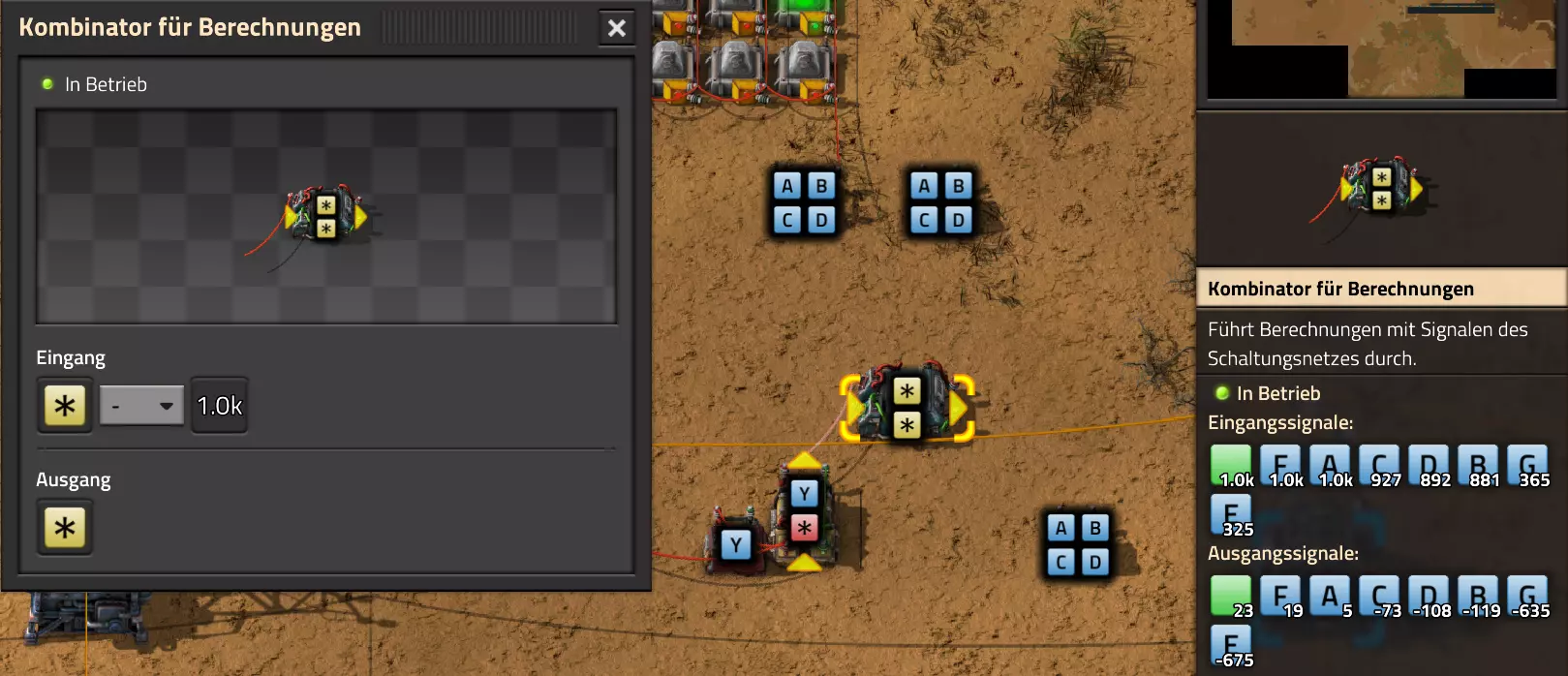 由于我们需要超过1000数值的精确数值,但例如1003只会显示为1K,所以我们需要另一个计算组合器。现在我让这个组合器从过高的数值A和E中减去1000单位。如果数值仍然过大,则需要相应调整减去的数值。