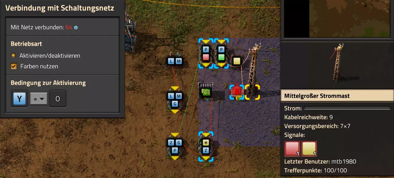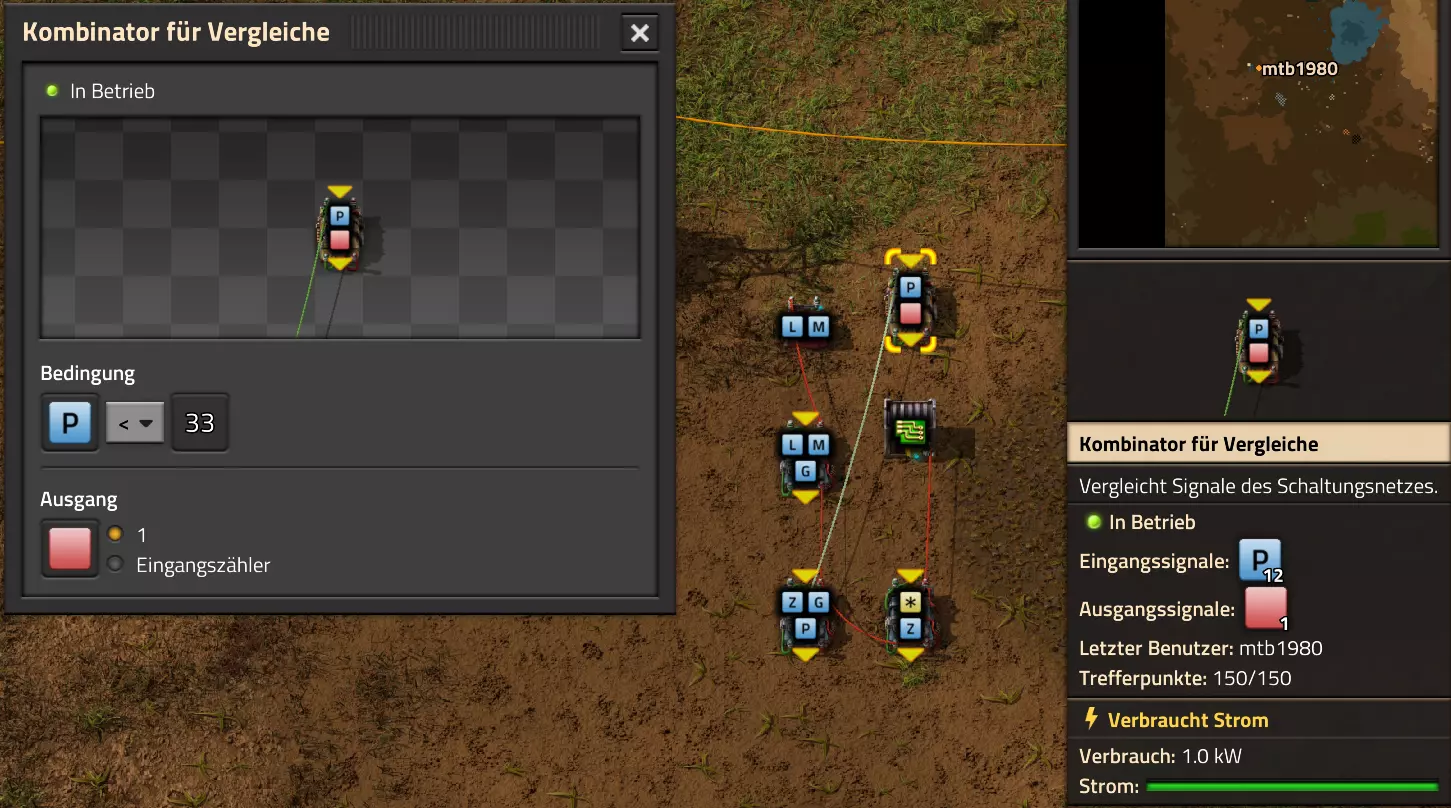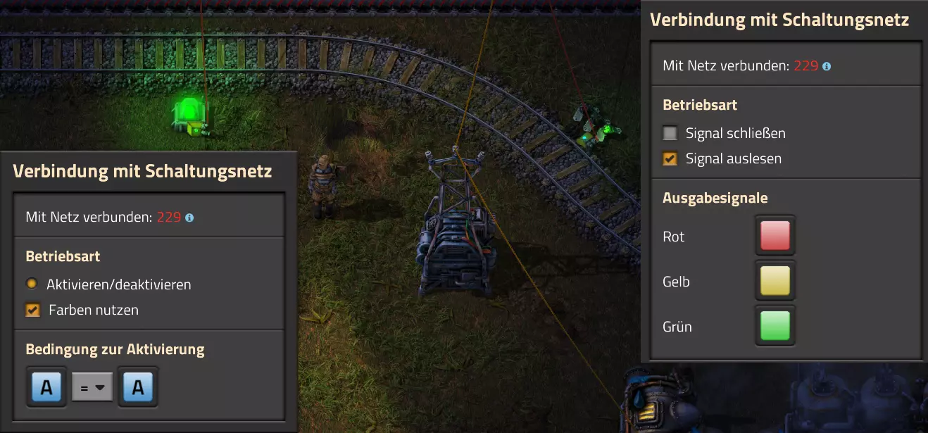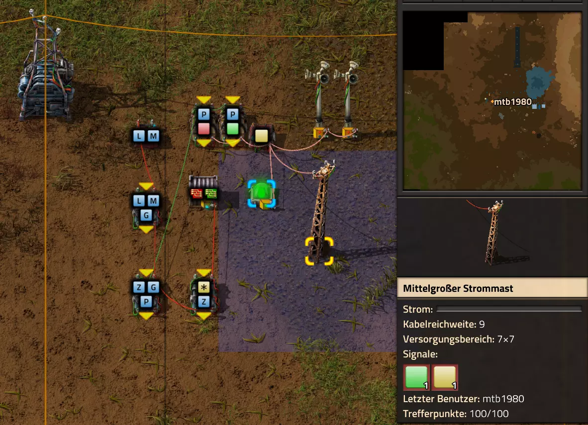 Hier noch der Code für die Schaltung: 0eNrdnN2OozYUx19li9SbKrT4AwNR29tV1Vbau6pbrRBJPIm1fImPaaNVHqAP0hfrk9TATJIhOOYwbgblZncC4WDO73+M/cfhi7WKa54XIq2s5RdLrLO0tJZ/fLFKsU2juNlW7XNuLS1R8cRaWGmUNJ82fC02vLDXWbISaVRlhXVYWCLd8L+sJTostAHKelVWUSWy9OxAfPi0sHhaiUrwrhnth32Y1smKFzLy0PELK89K0f4pzybD2IGzsPbyf+TL2CkX290qq4smIl5Q91PTvF5gPC6wh1WB0YIsKBsKTcaFdumVNntDgekxcEOtitLqHMflGXz2rft0DvmXPIs8rCqyOFzxXfQo5DHyiw8irnih0MCjKKpabjldUfsN+xerjVY3IqK+RgeqIL+eBcGOcy6Krq0pXzeXUzaxUPNPwTfnIhHykzz5WhTrWlTtRySPPQykzr0m5IHM0WPmPNmWjSi6prQMhrL4FDWU+zbi2OgHUZRVODohH7qEdGiljkjzKcmjom3l0vpeHpHVVV4DYjYpa6Pm+7DNdfhQZEkoUhnFWj5EcckPimxvC87Tfr69fr4XL3Yj/HJ/xxIr4HmXXx6Cx6C6xz3d6/lNqoI9j+PszzMVo7NKAGj4Ig29nDr9DSqVe0CVkxmonLGeyn+coPJOqiZ17l72K2odu9cBMgUu/3gZUSGqXcIrsR7do9NRxE6BXwet7fBL3sQIYR18lvOiuwUurW8moH1vHQ7jS4le5dTvnVR1FJwaUXEe2+sdL6vrtwn6fIMd00pExrUDOaeGJFEc23GU5Nc7PKq80T+f8KiDCTL4/WXtOr3S/aHZXZdcniPOmt60Kmo+Pi2qOkGnUWDCN6JObB7LcIWsljyL+VBCnGNCMASMsgX4NaWKblqqH6eU6vt+qX43oVQ/gErV19z1iHIkMa7D7oWjI0uOwEnTNyLNo/XuDPapLlEzmn5tx/sRRDMw0vEiChzBHIvMf7MBDHIMDNMdo4OXy1F4rxhAoxvkjhumo8mTrBnB+/fvfybgQ2bxUU1fxkD4qEYMbCReNnV28XZ4sYnaNAxXd6PyX1eb16Mp4UKnjs7bwyUm4GKzcH0N3AAEVzdECkbC9YFw0Qwrd1rHbBgv0+D1QHiZBu9IewwFMLyeP8PanYaXmMWrMTdbTY7Hq7H1+tFUeLEDxOu9PV5qoms2DDfQwEUguIEGLhoJFwHhujOEO612qVG8l7XZA4IheC9r83o0JV4MxDuDKZFronYNw0UauAQEF2ngkpFwCRAuniHcabXrmsWLNXgpCK/G/MB0JF6gF+XNYNTMTNSuYbhEAxfkRV3W5vVoSrhAr4oFM4Q7rXaZWbwarwqDvCqs8arwSK8KA70qNoMpkWeidg3D1XhVGDTfxRqvCo+c72KgV8XYDOFOq13PLF6NnYFBViTW2Bl4pBWJgW4Vm8GUyDdRu4bhaswMAjIzsMbMIGPNDKBXxWYwZg5MwPWNwiWa2S4BmRlEM9slI80MAnSqGJlh5U7rmM3ixZrHCBj0GAFrHiPgkY8RCNCrYs4Ma3ca3sAsXo0VSWBelcaKJCO9KgL0qtwZTIkC30DXbBYu0XhVBORVEY1XRUZ6VQToVbneDOFOq931jq8/m0UMqk+i8aMoVTE7GVB5kW2LKEmiVcztMufRZz744PY4FHb/12WgTm8RzdAy0OfzNJsT3i2uf15bHz5Gcc1DUYa5qNa7JwbN4vmyKupE5qHNTDOcyCre/Q1Yi0bcJqMyPS9OncfRfhWtP4ePWVw3VyPDH7dt42wVxfH+2JSoWdof5lm8z3dZ+rz90OzgxcVV7eR32x3dktdFtyVLwyTKnzc1P7V6SnHbStXvpM5WHB9Pl/CyjLbN7t94Krbvfkp3UVx9ZQ3KxgXLBt9GNqj3iH9usqH9zpXdr46QY6Pg62EBMaiAvOA2AsIzF5DbF5B3vwLCjo1VAvLAAmK3ERCZuYBYX0D+/QqIODZRCcgHC4jcRkB05gLy+gIK+qPNO76nUcemKkUFYEU5t1GUO3NF+X0BOfcrINexXYWAqAMVEPNuIyA2cwFd9EDofgXEHJupBITAAqK3EZA3bwHR/s/fKb5fAXmOnEwpBITBAkK3EZA/cwH1LVhK7ldAvmP7KgERqIBc/zYCCmYuoGHL9j4FFDh24CkEBDak3RvN6888/tma0pqVi/fcKf0s5BfeyUuIhy1r6oJe8+Vcvotr+E1clIHe8uWApkUtrYt3jale3eWBXgp2cYXdu8Y+Lbq8L89e4rawHiXQNgT2EfUC7JHAQx4ih8N/U9vhJQ== Video-Guide: Lautsprecher und Alarme Hier nun gleich das letzte Basis-Video. Es behandelt auch den Miditorio-Teil des Guides: https://www.youtube.com/watch?v=W2HmQfwEF-8 Projekt-Beispiele Im Anhang findest Du einige Beispiele inklusive Import-Codes, wie Du das eine oder andere Problem lösen kannst. Ich halte mich ab hier recht kompakt, da Du bereits die Grundlagen eines Aufbaus nach meinem Guide beherrschen solltest. Falls etwas unklar (oder gar falsch ausgeführt) ist, bitte einfach ein Kommentar hinterlassen! Video: Erzabbau ist leer Inspiration zu diesem Video gab @Sneak0r aus dem Kommentarbereich des Steam-Guides. Das Thema werde ich allerdings nicht in schriftlicher Form dem Guide hinzufügen, sondern als Video: Beispiel: Bahnübergänge sicher machen Einmal nicht auf die Karte geschaut und schon vom Zug überrollt. Wer hat diesen Erfolg nicht nicht abgeräumt? Dabei wäre es doch recht einfach, unnötige Todesfälle auf Gleisen recht zuverlässig zu verhindern. Du hast es erraten: Mit einer Schaltung! Dafür gibt es mehrere Optionen. Fangen wir bei den einfachen Optionen an. Manchmal könnte es schon reichen, einfach eine Lampe angehen zu lassen, wenn sich denn ein Zug in Anfahrt befindet. Dazu könntest Du neben den Schienen eine Lampe montieren: Dazu brauchen wir neben Lampen auch wenigstens ein Zugsignal, von dem wir den aktuellen Status abrufen können. Das Zugsignal verbinde ich mit einer beliebigen Kabelfarbe (in meinem Beispiel ist es das rote Kabel) über die Strommasten und gebe den aktuellen Status an die Lampen weiter: