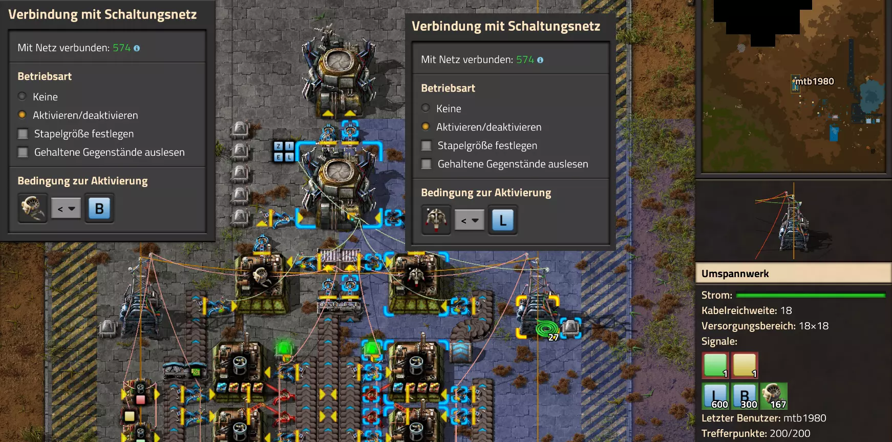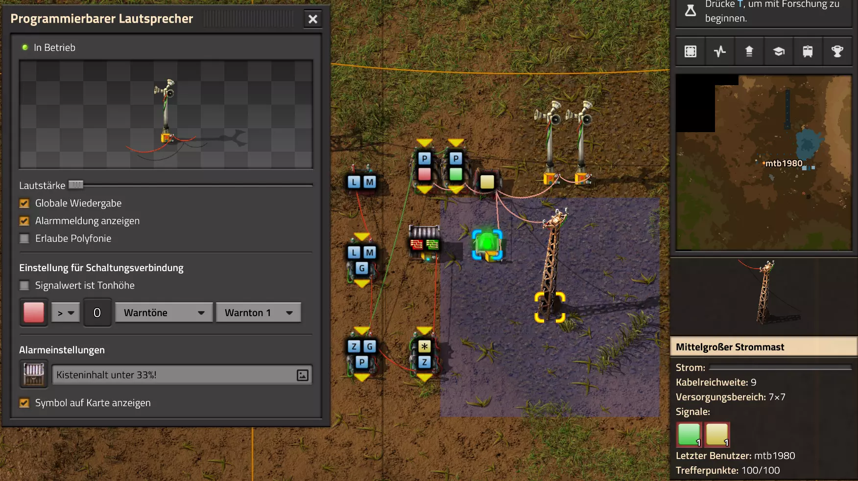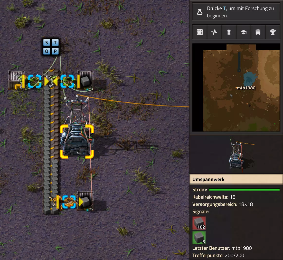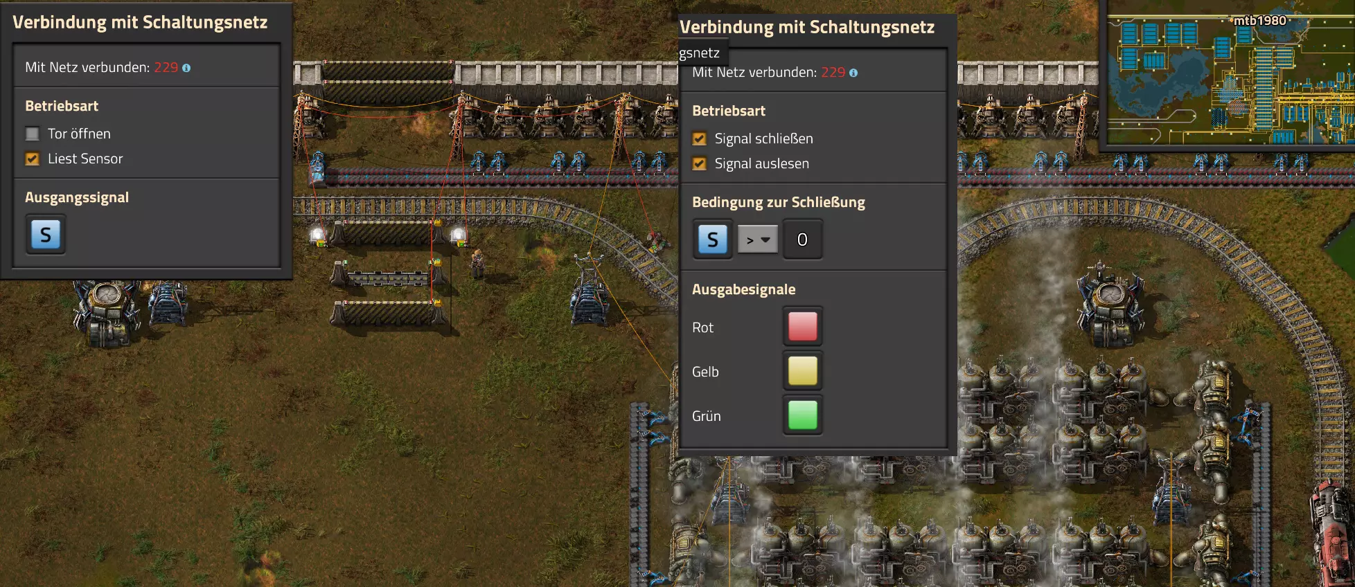 Hier noch der Code für die Schaltung: 0eNrdnN2OozYUx19li9SbKrT4AwNR29tV1Vbau6pbrRBJPIm1fImPaaNVHqAP0hfrk9TATJIhOOYwbgblZncC4WDO73+M/cfhi7WKa54XIq2s5RdLrLO0tJZ/fLFKsU2juNlW7XNuLS1R8cRaWGmUNJ82fC02vLDXWbISaVRlhXVYWCLd8L+sJTostAHKelVWUSWy9OxAfPi0sHhaiUrwrhnth32Y1smKFzLy0PELK89K0f4pzybD2IGzsPbyf+TL2CkX290qq4smIl5Q91PTvF5gPC6wh1WB0YIsKBsKTcaFdumVNntDgekxcEOtitLqHMflGXz2rft0DvmXPIs8rCqyOFzxXfQo5DHyiw8irnih0MCjKKpabjldUfsN+xerjVY3IqK+RgeqIL+eBcGOcy6Krq0pXzeXUzaxUPNPwTfnIhHykzz5WhTrWlTtRySPPQykzr0m5IHM0WPmPNmWjSi6prQMhrL4FDWU+zbi2OgHUZRVODohH7qEdGiljkjzKcmjom3l0vpeHpHVVV4DYjYpa6Pm+7DNdfhQZEkoUhnFWj5EcckPimxvC87Tfr69fr4XL3Yj/HJ/xxIr4HmXXx6Cx6C6xz3d6/lNqoI9j+PszzMVo7NKAGj4Ig29nDr9DSqVe0CVkxmonLGeyn+coPJOqiZ17l72K2odu9cBMgUu/3gZUSGqXcIrsR7do9NRxE6BXwet7fBL3sQIYR18lvOiuwUurW8moH1vHQ7jS4le5dTvnVR1FJwaUXEe2+sdL6vrtwn6fIMd00pExrUDOaeGJFEc23GU5Nc7PKq80T+f8KiDCTL4/WXtOr3S/aHZXZdcniPOmt60Kmo+Pi2qOkGnUWDCN6JObB7LcIWsljyL+VBCnGNCMASMsgX4NaWKblqqH6eU6vt+qX43oVQ/gErV19z1iHIkMa7D7oWjI0uOwEnTNyLNo/XuDPapLlEzmn5tx/sRRDMw0vEiChzBHIvMf7MBDHIMDNMdo4OXy1F4rxhAoxvkjhumo8mTrBnB+/fvfybgQ2bxUU1fxkD4qEYMbCReNnV28XZ4sYnaNAxXd6PyX1eb16Mp4UKnjs7bwyUm4GKzcH0N3AAEVzdECkbC9YFw0Qwrd1rHbBgv0+D1QHiZBu9IewwFMLyeP8PanYaXmMWrMTdbTY7Hq7H1+tFUeLEDxOu9PV5qoms2DDfQwEUguIEGLhoJFwHhujOEO612qVG8l7XZA4IheC9r83o0JV4MxDuDKZFronYNw0UauAQEF2ngkpFwCRAuniHcabXrmsWLNXgpCK/G/MB0JF6gF+XNYNTMTNSuYbhEAxfkRV3W5vVoSrhAr4oFM4Q7rXaZWbwarwqDvCqs8arwSK8KA70qNoMpkWeidg3D1XhVGDTfxRqvCo+c72KgV8XYDOFOq13PLF6NnYFBViTW2Bl4pBWJgW4Vm8GUyDdRu4bhaswMAjIzsMbMIGPNDKBXxWYwZg5MwPWNwiWa2S4BmRlEM9slI80MAnSqGJlh5U7rmM3ixZrHCBj0GAFrHiPgkY8RCNCrYs4Ma3ca3sAsXo0VSWBelcaKJCO9KgL0qtwZTIkC30DXbBYu0XhVBORVEY1XRUZ6VQToVbneDOFOq931jq8/m0UMqk+i8aMoVTE7GVB5kW2LKEmiVcztMufRZz744PY4FHb/12WgTm8RzdAy0OfzNJsT3i2uf15bHz5Gcc1DUYa5qNa7JwbN4vmyKupE5qHNTDOcyCre/Q1Yi0bcJqMyPS9OncfRfhWtP4ePWVw3VyPDH7dt42wVxfH+2JSoWdof5lm8z3dZ+rz90OzgxcVV7eR32x3dktdFtyVLwyTKnzc1P7V6SnHbStXvpM5WHB9Pl/CyjLbN7t94Krbvfkp3UVx9ZQ3KxgXLBt9GNqj3iH9usqH9zpXdr46QY6Pg62EBMaiAvOA2AsIzF5DbF5B3vwLCjo1VAvLAAmK3ERCZuYBYX0D+/QqIODZRCcgHC4jcRkB05gLy+gIK+qPNO76nUcemKkUFYEU5t1GUO3NF+X0BOfcrINexXYWAqAMVEPNuIyA2cwFd9EDofgXEHJupBITAAqK3EZA3bwHR/s/fKb5fAXmOnEwpBITBAkK3EZA/cwH1LVhK7ldAvmP7KgERqIBc/zYCCmYuoGHL9j4FFDh24CkEBDak3RvN6888/tma0pqVi/fcKf0s5BfeyUuIhy1r6oJe8+Vcvotr+E1clIHe8uWApkUtrYt3jale3eWBXgp2cYXdu8Y+Lbq8L89e4rawHiXQNgT2EfUC7JHAQx4ih8N/U9vhJQ== Video-Guide: Lautsprecher und Alarme Hier nun gleich das letzte Basis-Video. Es behandelt auch den Miditorio-Teil des Guides: https://www.youtube.com/watch?v=W2HmQfwEF-8 Projekt-Beispiele Im Anhang findest Du einige Beispiele inklusive Import-Codes, wie Du das eine oder andere Problem lösen kannst. Ich halte mich ab hier recht kompakt, da Du bereits die Grundlagen eines Aufbaus nach meinem Guide beherrschen solltest. Falls etwas unklar (oder gar falsch ausgeführt) ist, bitte einfach ein Kommentar hinterlassen! Video: Erzabbau ist leer Inspiration zu diesem Video gab @Sneak0r aus dem Kommentarbereich des Steam-Guides. Das Thema werde ich allerdings nicht in schriftlicher Form dem Guide hinzufügen, sondern als Video: Beispiel: Bahnübergänge sicher machen Einmal nicht auf die Karte geschaut und schon vom Zug überrollt. Wer hat diesen Erfolg nicht nicht abgeräumt? Dabei wäre es doch recht einfach, unnötige Todesfälle auf Gleisen recht zuverlässig zu verhindern. Du hast es erraten: Mit einer Schaltung! Dafür gibt es mehrere Optionen. Fangen wir bei den einfachen Optionen an. Manchmal könnte es schon reichen, einfach eine Lampe angehen zu lassen, wenn sich denn ein Zug in Anfahrt befindet. Dazu könntest Du neben den Schienen eine Lampe montieren: Dazu brauchen wir neben Lampen auch wenigstens ein Zugsignal, von dem wir den aktuellen Status abrufen können. Das Zugsignal verbinde ich mit einer beliebigen Kabelfarbe (in meinem Beispiel ist es das rote Kabel) über die Strommasten und gebe den aktuellen Status an die Lampen weiter: