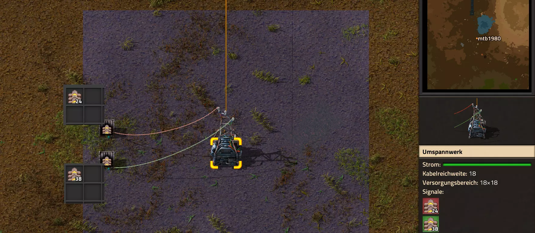 常量组合器(原词:Kombinator für Konstanten,曾用名:Konstanter Kombinator):用于固定输出状态。 电路有什么作用以及如何使用? 啊,利用电路可以实现很多功能。从读取传送带和箱子的数据,到控制单个机械臂,再到复杂的电路(例如:当达到一定数量或传送带满载时关闭设备A,然后才启动设备B……),一切皆有可能。电路可以触发各种不同的功能: 控制方式 根据条件开关可能的物品 几乎适用于所有电气设备 设置过滤器 适用于过滤机械臂、带查询功能的智能箱子 根据条件停止传送带 读取内容 箱子、传送带、储罐、列车停靠站、蓄电池/电池、机器人停机坪、油泵 剩余量显示 油泵、电动矿石输送机 灯光颜色 灯具 发送警报信号 可编程扬声器(可输出声音或图像) 此列表并不完整,但应该已经能让你对各种可能性有一个大致了解。 不过在这里我不想深入太多细节,让我们先来看一下基础知识。本指南下方将介绍多种使用方法。 读取内容 在当前网络中查看内容最简单的方法是在一个缓冲器(以我的示例中的箱子为例)和电线杆之间连接一根电缆。在小地图右下方可以看到数值。 在我的示例中,上面的箱子里有24卷胶带,下面的箱子里有38卷胶带。 作为第一个示例,我现在放置了两个装有相同物品的箱子。两个箱子都与一个