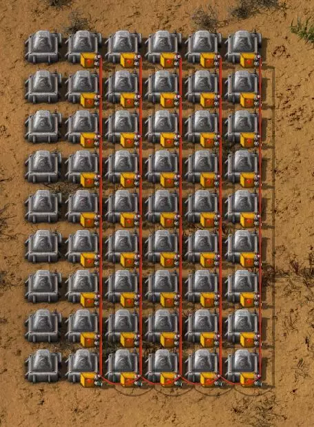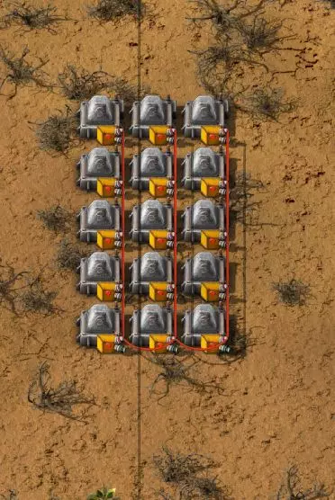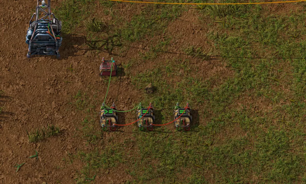 正如你在这里可以清楚看到的,硫酸和水的储存罐填充情况良好,原油也处于良好状态。显示的数值均为百分比,即100表示完全装满,1表示几乎为空。如果某种材料完全不显示,则说明储罐已完全空了。 为了控制各个设备部件,我采用了一种相当简单的方法:如果出现某种情况,我只需关闭位于各个加工区域前的进料泵。 固体燃料设备 让我们从固体燃料区域开始。这些设备只有一个条件:当相应的原料填充量超过60%时,设备才应启动——否则不启动。我从电线杆上拔下红色电缆,那里所有百分比数值已经汇总,然后用相同颜色的电缆连接靠近固体燃料道路的三个输送泵。作为激活条件,我将相应材料设置为大于60。
