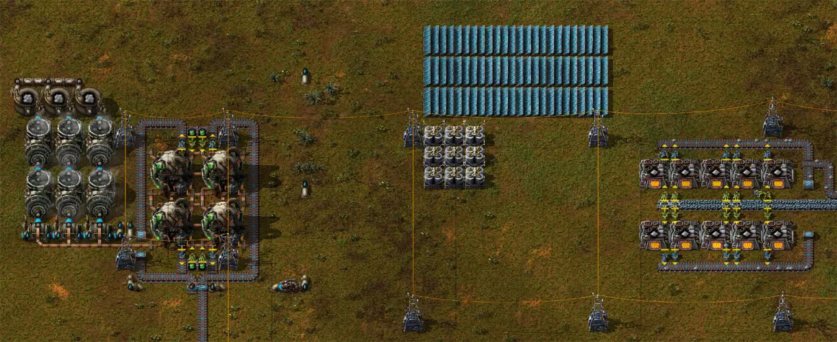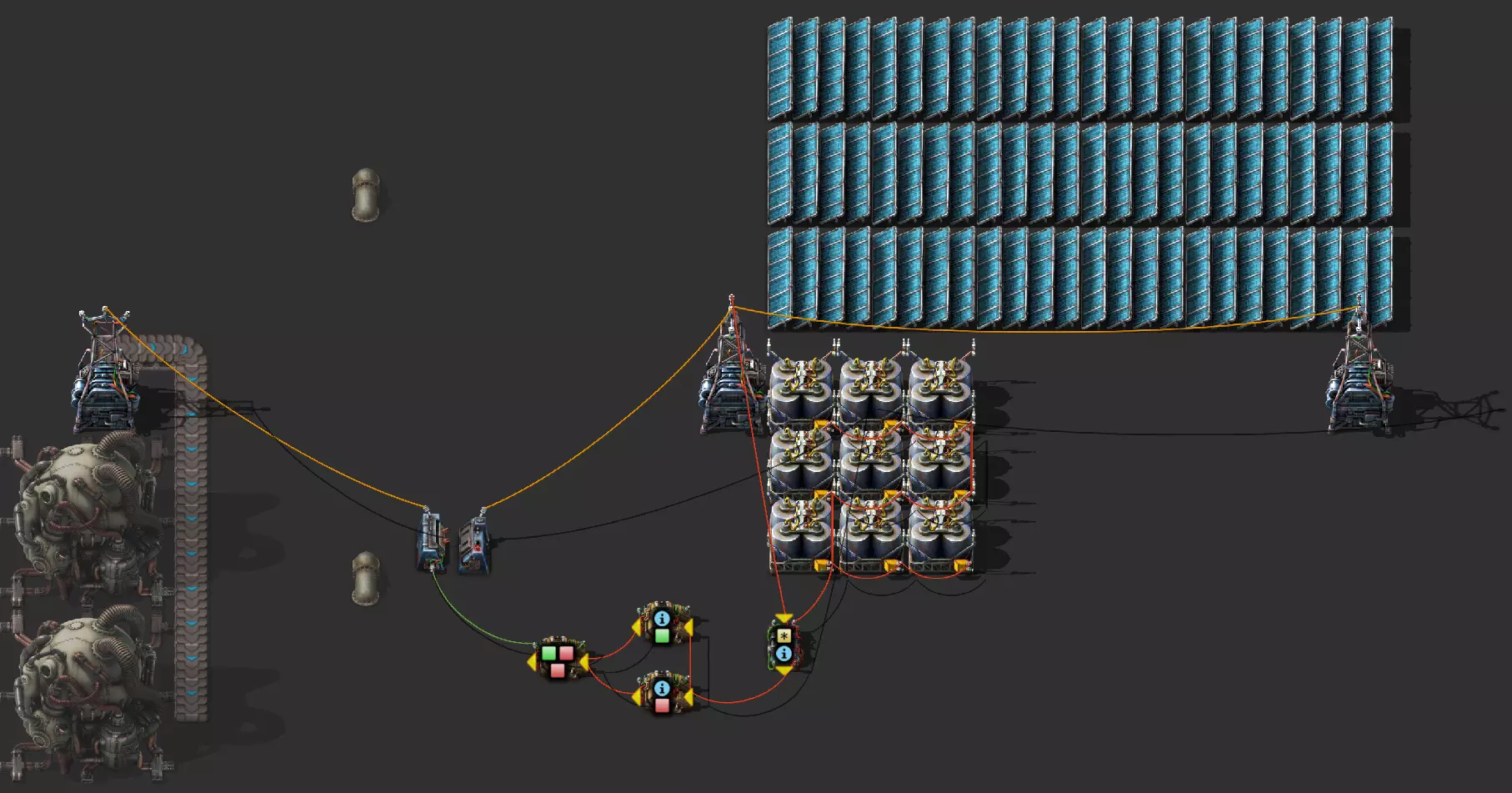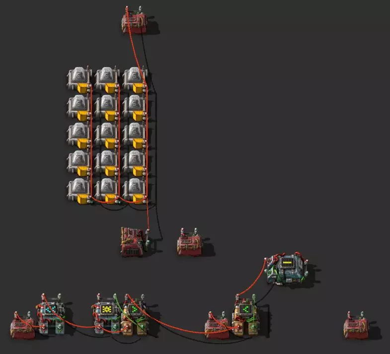 我已将设计蓝图重新放置到外部文档中,一个部分的文字实在太多了 :) 项目“机器人系统”相关视频 示例:自动关闭:简介 在这个示例中,我设置了两个发电区域,四个核反应堆用于为基地供电,还有一个稍远的铁板熔炼区域,该区域由太阳能供电,并配备了一些蓄电池作为保障。 我希望尽可能将铁板生产与内部电网分离,在白天完全依靠太阳能进行生产。 这里同样可以使用一个电路。在《异星工厂》中,所谓的触发器或SR(RS)电路可以将设备与主电网分离,并在蓄电池电量过低时重新连接。我的当前结构如下: