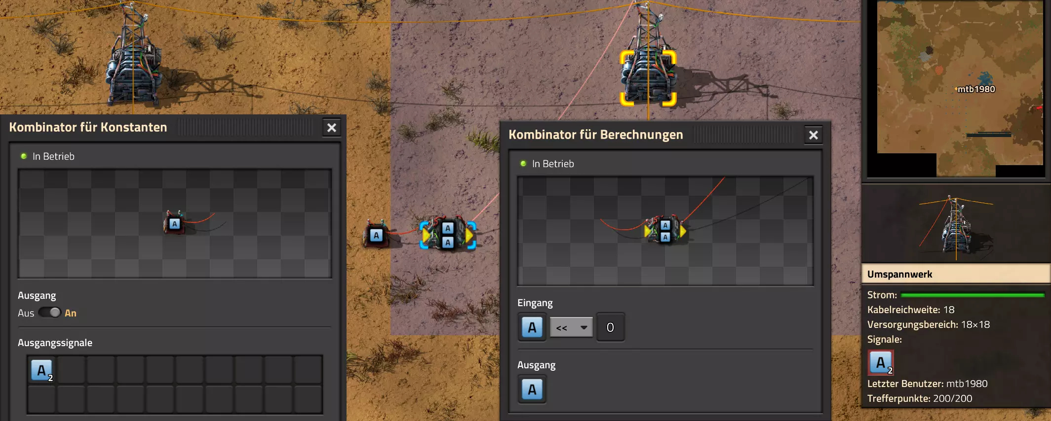 为了能收到显示,我现在将分钟计数器的输入端连接到设备下方的电线杆上。在电线杆后面,我临时放置了一个用于测试的恒定组合器,其值为S=40,并将其同样连接到电线杆上。