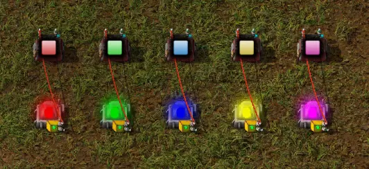 在这个示例中,我为每个常量组合器分配了一种颜色,用线缆将其连接到一盏灯,并将灯设置为根据现有的颜色变量进行着色。颜色变量是变量概览中的颜色区域。