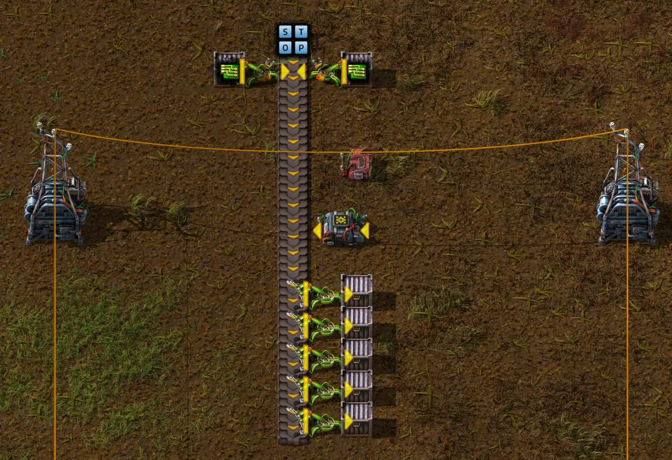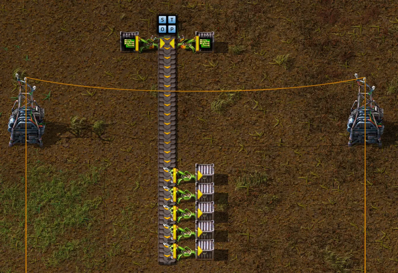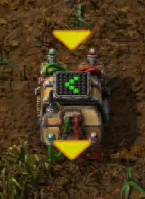 我们常用的电力杆再次位于中央,它的作用仍是显示当前数值。 最上方是一个常亮组合器,它会向网络发送绿色的STOP信号。 上方两个进料箱的抓取臂同样连接到绿色网络。在设置中,我选择了“启用/禁用”选项,并将条件设为S必须等于零,抓取臂才能工作。 因此,要激活抓取臂,我需要将常亮组合器的“输出”滑块从“开”拨到“关”。这样一来,信号S、T、O和P将不再输出,抓取臂就会被激活。 下方与红色网络相连的是黄色抓取臂,它直接与箱子相连。抓取器的设置为:仅当箱子内固体燃料数量小于或等于100个时激活。我也已将红色电缆与电线杆连接。我关闭了停止信号,然后观察一段时间后会发生什么。