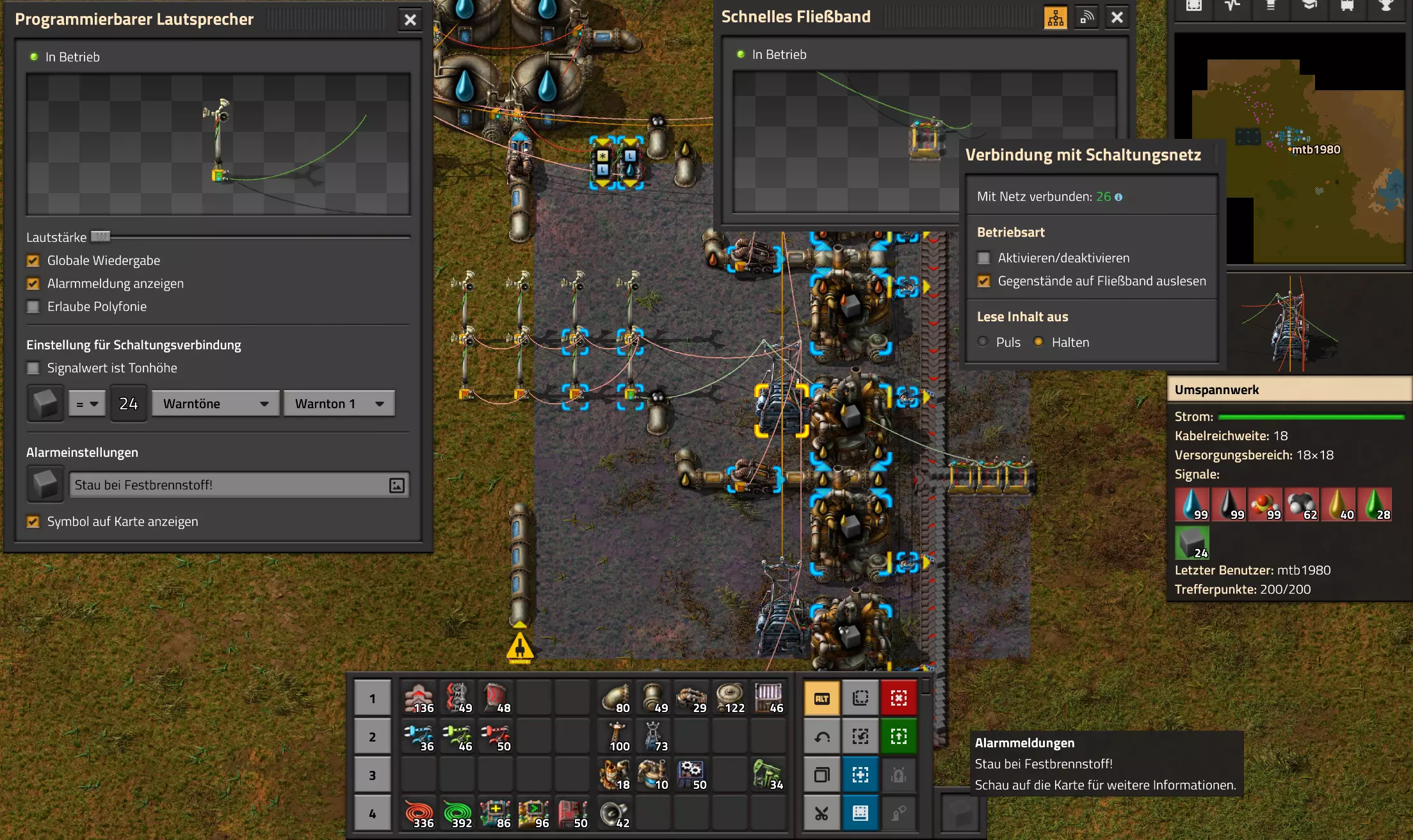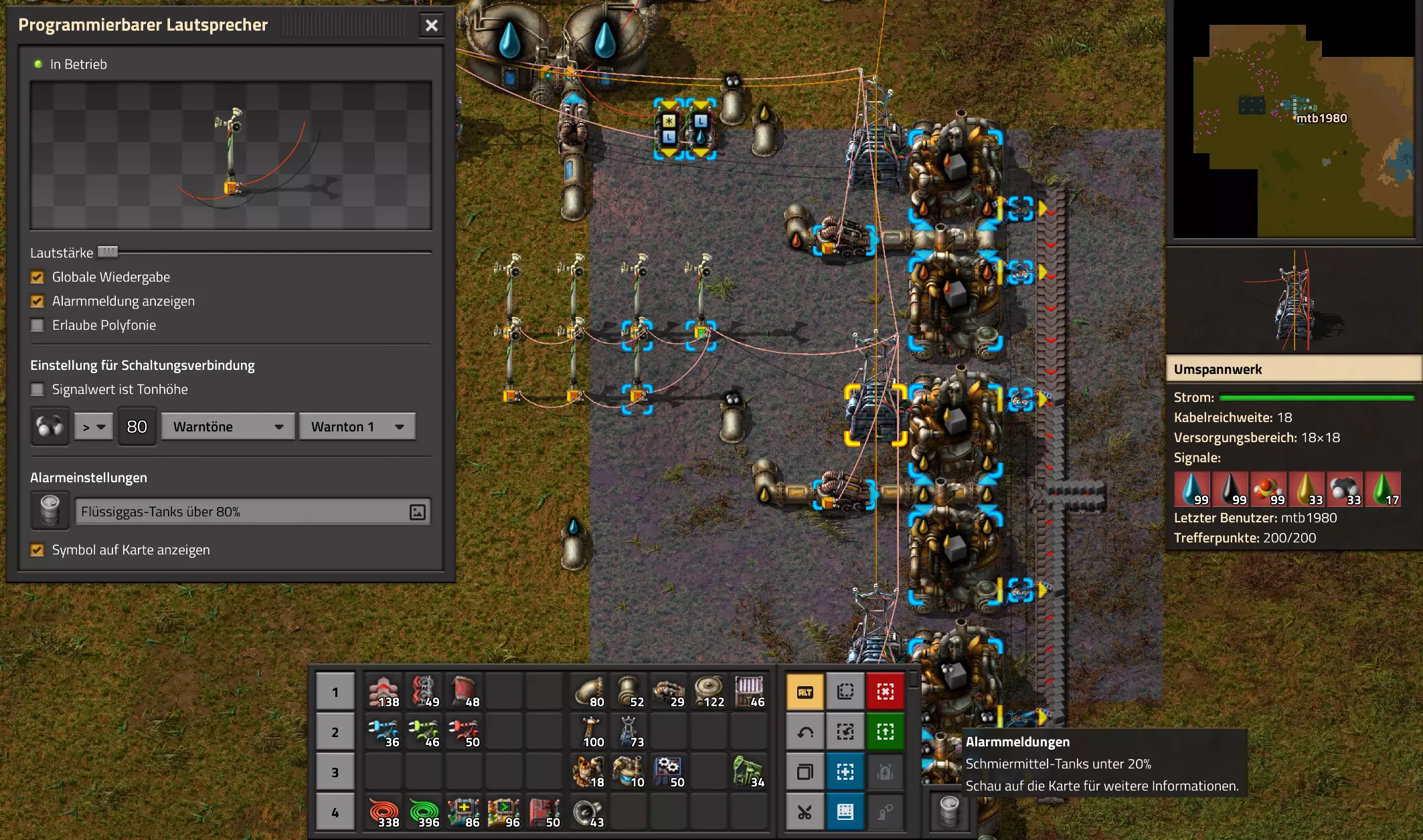 这里同样只满足一个条件,因此泵已停止运行。 示例:石油加工:警报 理论上这应该已经可以正常工作了。不过,我还是希望进行一些警报设置,以便在以下情况时收到通知: - 原油储罐的填充量低于20%, - 重油储罐的填充量超过80%, - 轻油储罐的填充量超过80%, - 液化气储罐的填充量超过80%, - 润滑油储罐的填充量低于20%, - 硫酸储罐的填充量低于20%,以及 - 固体燃料发生堵塞。 我们可以借助扬声器(参见上文部分)来实现这些提示。我会把扬声器放在固体燃料道路旁边,因为我还得进行乐队控制。 低液位警报设置 首先,我从低液位警报开始设置。为此,我安装了三个扬声器并将它们连接到红色网络。此外,我现在将第一个扬声器配置为当原油低于20%时发出警报。我把音量调到零,因为我不想一直听到警报声 :) 另外,我选择空油箱的图标,并输入我的提示文本,即“原油储罐低于20%”。 我使用油箱图标是因为所有自定义警报都会集中到一个图标上。这里可以使用一个独特的符号,但如果存在多个警报,在大多数情况下它会显示错误。