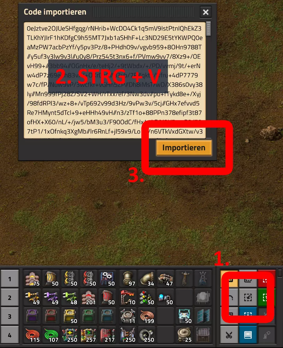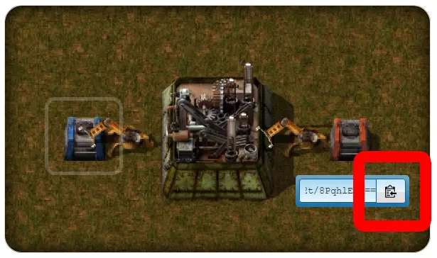现在我点击“获取蓝图”按钮,就能得到《异星工厂》的导入代码。该代码可在红色箱子下方找到。点击复制按钮即可获取该代码。