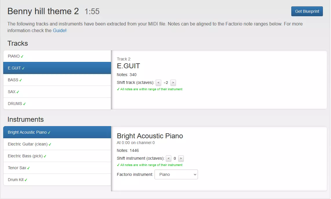 现在我将下载好的MIDI文件拖到网站上的蓝色方框中。很快,网站就会显示出文件中使用的乐器。由于《异星工厂》只能显示特定的频率范围,因此有时需要调整音高,也就是八度。 以我使用的MIDI文件为例,钢琴音轨中有114个音符低于可显示频率,电吉他音轨则有340个音符高于可显示频率。因此,我需要点击钢琴音轨,调整数值,使显示为红色的数字尽可能小。电吉他音轨也进行同样的操作。