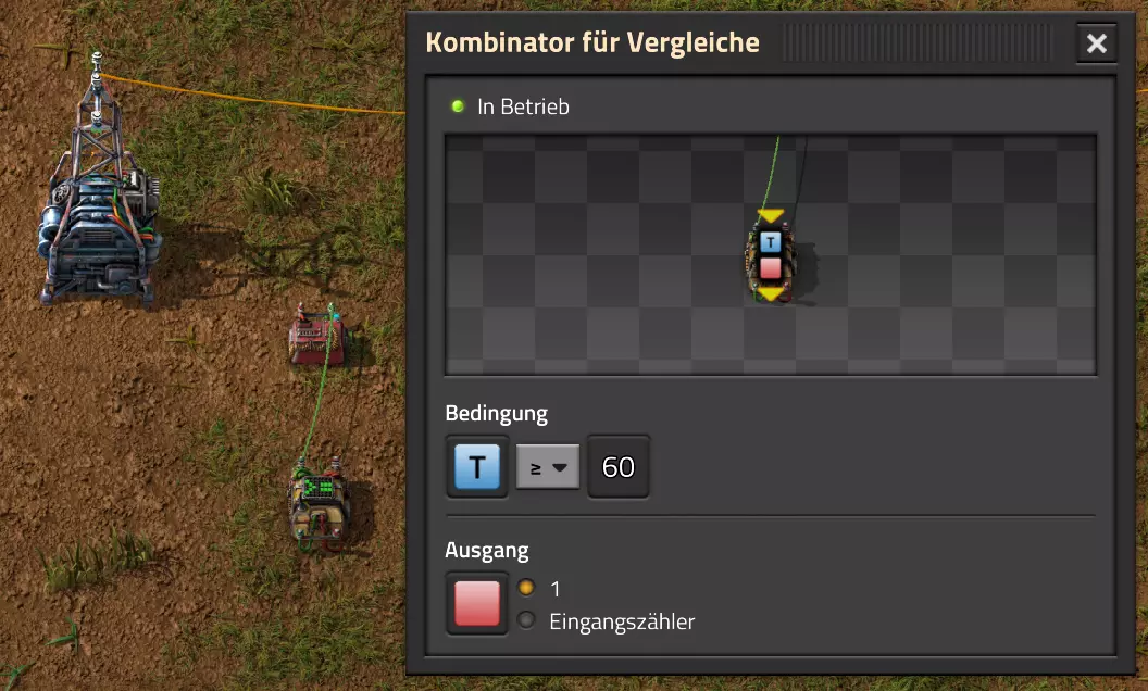 为了捕捉这些信号,我们需要使用多个比较 combinator(比较器)。我会放置一个这样的 combinator(比较器),并将常量 combinator(常量比较器)连接到比较 combinator(比较器)的输入端。我使用大于或等于60作为比较条件,当满足该条件时,应发送一个红色信号。