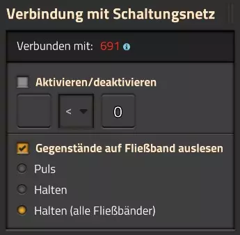 在这里我取消勾选“启用/禁用”,改为勾选“读取传送带上的物品”,并将“脉冲”选项设置为“保持”。这样传送带就不会再停止,但传送带上的当前内容会显示在红色线路网络上(因为我使用了红色线缆)。“脉冲”选项只会在物品到达该传送带段时发送一次短暂信号,而“保持”则会在物品停留在传送带上期间持续发送信号。