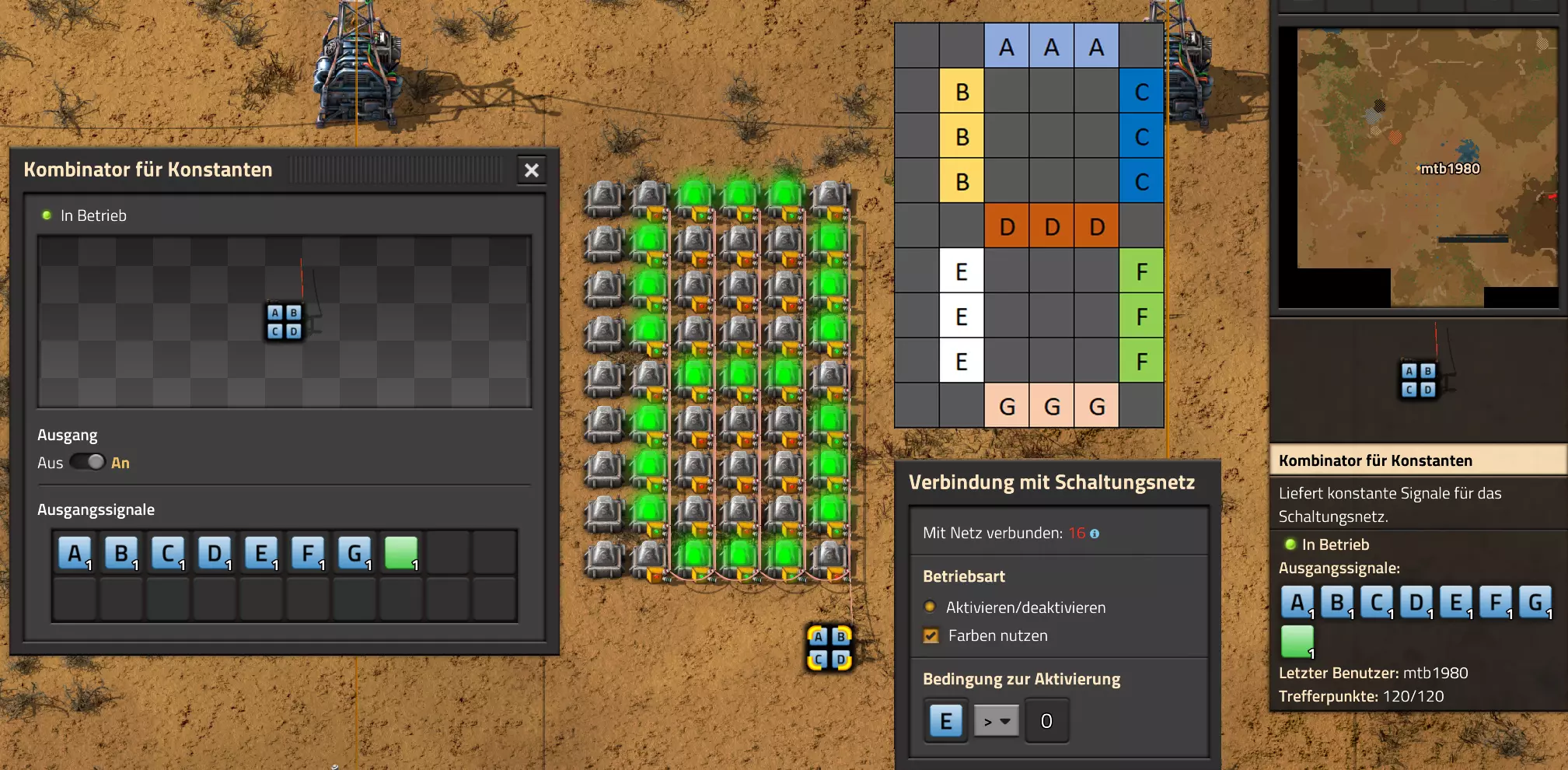 我将前期项目中的电子结构再次转移到此处进行计算。此外,为了设置颜色,我在显示屏上方添加了另一个常量组合器,并将其与红色网络相连。这次预设的颜色是青绿色。 我将显示屏下方的信号发生器与红色电缆相连,并预设所需的变量,即A到O均设为1。我将此设置转移到我的备份组合器上。