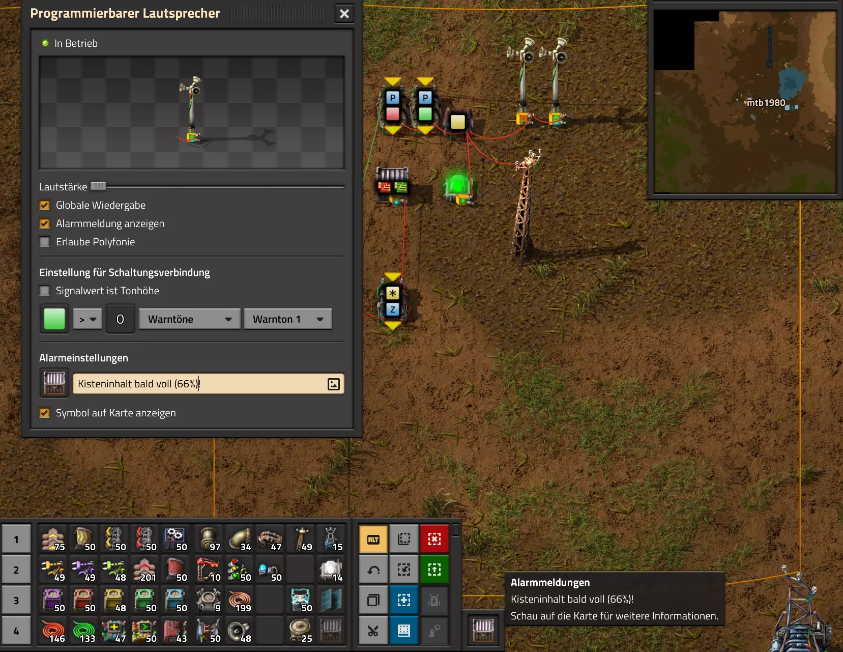 现在我们看到电线杆右侧没有显示零,因为只有当填充值低于10%时才会显示零。绿色对勾也是如此,只有当填充量达到98%及以上时才会激活。 其他所有组合器都由两个信号组成,这些信号通过这种布线方式相加。换句话说:如果值2上是中间值(即大于等于10或小于98),则满足此条件。 我现在按照上面所示重新设置警报消息。每个扬声器都有自己的检查,或者说有自己的文本: 0%:当信号“零”等于1时,显示文本:“内容不足!”10%:当信号一等于2时,显示文本:“10-19%” 20%:当信号二等于2时,显示文本:“20-29%” (……) 90%:当信号九等于2时,显示文本:“90-97%” 98%:当信号“绿色对勾”等于1时,显示文本:“箱子已满!” 我先设置第一个扬声器,然后将此设置复制到第二个扬声器。对第二个扬声器稍作调整后,再将设置复制到第三个扬声器,以此类推。所有扬声器设置完成后,会出现一个显示百分比的提示。