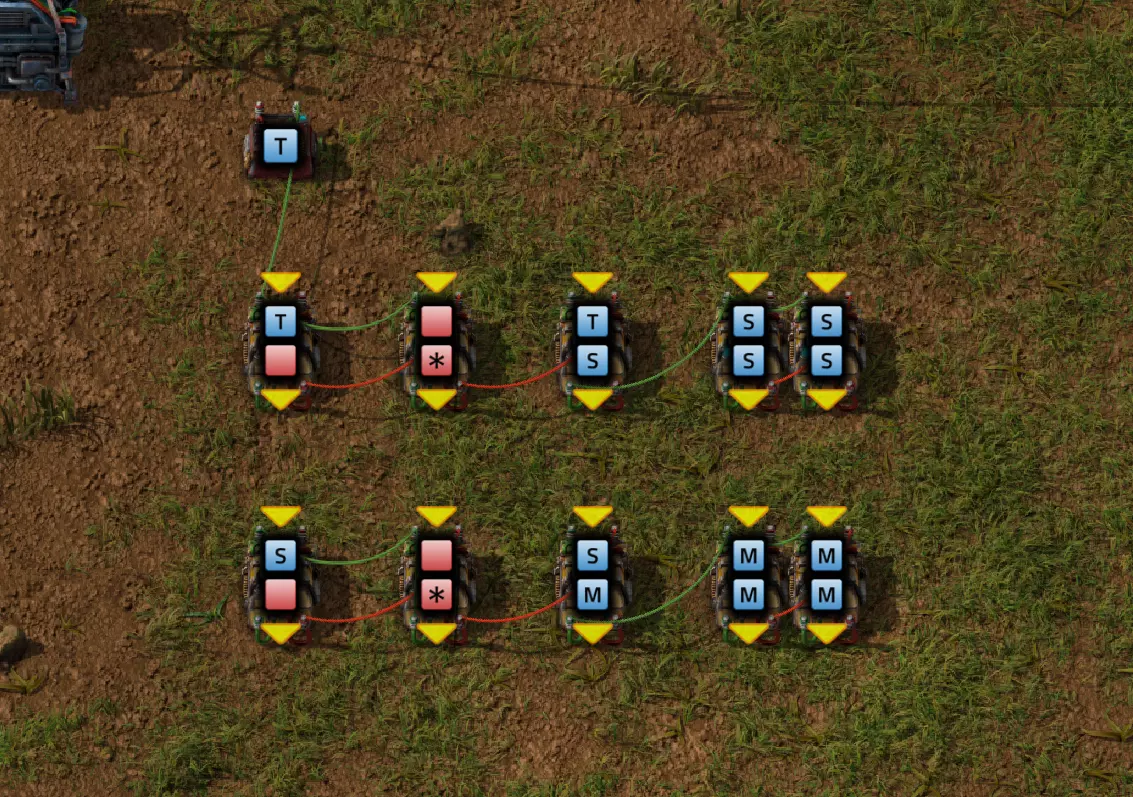 示例:生成计时器:读取数值 虽然到目前为止这相当实用,但我们还没有直接查看时间数据的方法。现在我们就来改变这一点: 在每一行中,第二个组合器的输出端提供当前数值,即滴答数、秒、分钟、小时和天数。 我们只关注秒、分钟、小时和天数,这里暂时忽略滴答数。不过,你完全可以通过上述方法轻松获取滴答数。 为此,我需要构建一个新的电路网络,以确保时间计算不受干扰。因为我们只能使用两种线缆颜色,如果直接连接,会将不同的数值混合在一起。因此,我在每一行的秒数之后再添加一个比较组合器,并按如下方式设置这些组合器: 组合器 秒:S = S,返回值:所有S的数值 组合器 分钟:M = M,返回值:所有M的数值 组合器 小时:H = H,返回值:所有H的数值 组合器 天:D = D,返回值:所有D的数值 我将各个组合器分别与对应行中的第二个组合器相连。重要的是,不要简单地将信号串联起来: