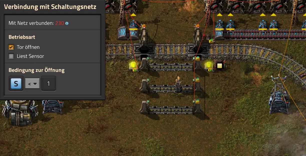 下一种方法是,当你打开大门时让火车自动收到停止信号。在这种情况下,我会将大门设置为不会自动关闭,但会向红色电缆网络发送信号。我使用的是S信号(代表停止)。 现在,我将玩家位置右侧的信号设置为,除了输出信号外,还要添加一个条件(信号关闭)。一旦S信号大于0,这段轨道应立即被封锁。 请注意,这里我只搭建了一个演示结构。根据你的火车速度和已研究的制动力,火车信号当然需要设置在离道口更远的位置!