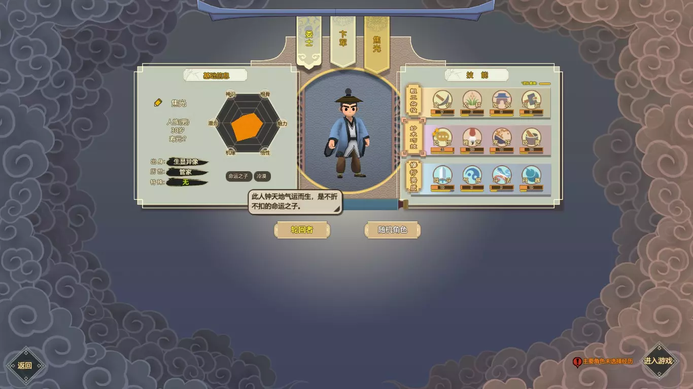 首先是人物选择,游戏中有轮回者系统,可通过输入特定人名来选择强大的轮回者,这些轮回者的属性能让游戏体验更轻松。除轮回者外,建议玩家挑选这样三个人:一个是带有【命运之子】特性的角色,一个是五维属性非常适合某非土系功法的角色(悟性至少为7),最后一个是痴迷巧匠能力的角色。