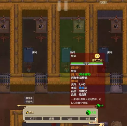 首先,所有风水建筑都需要位于相生的环境里,比如木属性的风水建筑需要位于水属性的环境之中,水属性的风水建筑需要位于金属性的环境之中。一般来讲,可以通过在风水建筑周围放置装饰物体的方法来保障其环境。比如说我放置了一张以铁为主材料的床(铁是金属性),并在床周围放置玉石八卦旗和玉石油灯(玉石是土属性),那么这张床的风水多半就是大吉了。 这里有两个额外值得注意的点,首先是有些建筑是自带环境属性的,比如水井,这种建筑就建议直接用水相生的木属性材料来建造。第二点是屋顶是风水建筑,在你不能保证屋顶的环境属性是否正确的情况下,请谨慎建造屋顶。在讲完建筑的风水后,房间的风水就很容易理解了。首先,房间的风水与其中所有风水建筑的风水相关,若房间内没有风水建筑,该房间则不涉及风水。其次,房间布局不当会严重影响风水,拥挤或空旷的房间都难以获得较高的风水评价。最后,房间的开门方向也会影响风水,新手建议房间只设计一个门,且卧室的门向下开,制造类房间的门向右开,厨房的门向左开。 另外需要注意的是,火属性的材料及产物会导致温度上升,水属性的材料及产物会导致温度下降。因此,建造卧室时,建议用金属性材料制作床,并搭配土属性装饰品,这样房间的温度会比较适宜。当必须使用水火属性装饰品时,可选用旗帜类装饰物体,其对温度的影响会稍小一些。 游戏机制说明-内门弟子 首先,从内门对外门的作用说起。最先也是最重要的一点是,内门需要保障外门的安全。在游戏中,会频繁出现敌对修行者的入侵,且修行者的战斗力还会不断上升。因此,在游戏前期,请时刻确保门派内有一名战斗力较强的内门弟子,以保卫门派安全。