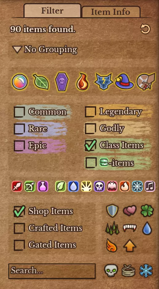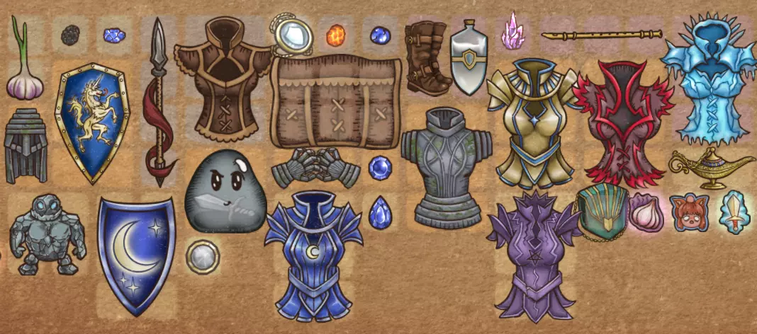 这里主要包含保障生存的物品,尤其是盾牌和护甲部件(手套、胸甲、靴子和头盔)。通常你至少需要几件护甲部件,因为它们能为角色争取叠加增益效果的时间。背包/行囊