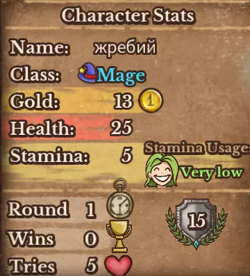左下角是角色参数,其中真正重要的有3项:金币数量、耐力和剩余次数。剩余次数即你进行决斗的机会数量,若次数耗尽,本局游戏结束;若在此之前你已赢得足够场次,你的等级仍会提升(在排位模式下)。关于金币有一个重要点:战斗开始时,你的金币会保留在你身上,这样一来,比如当你钱不够用的时候,就可以为下一轮存下一些金币。