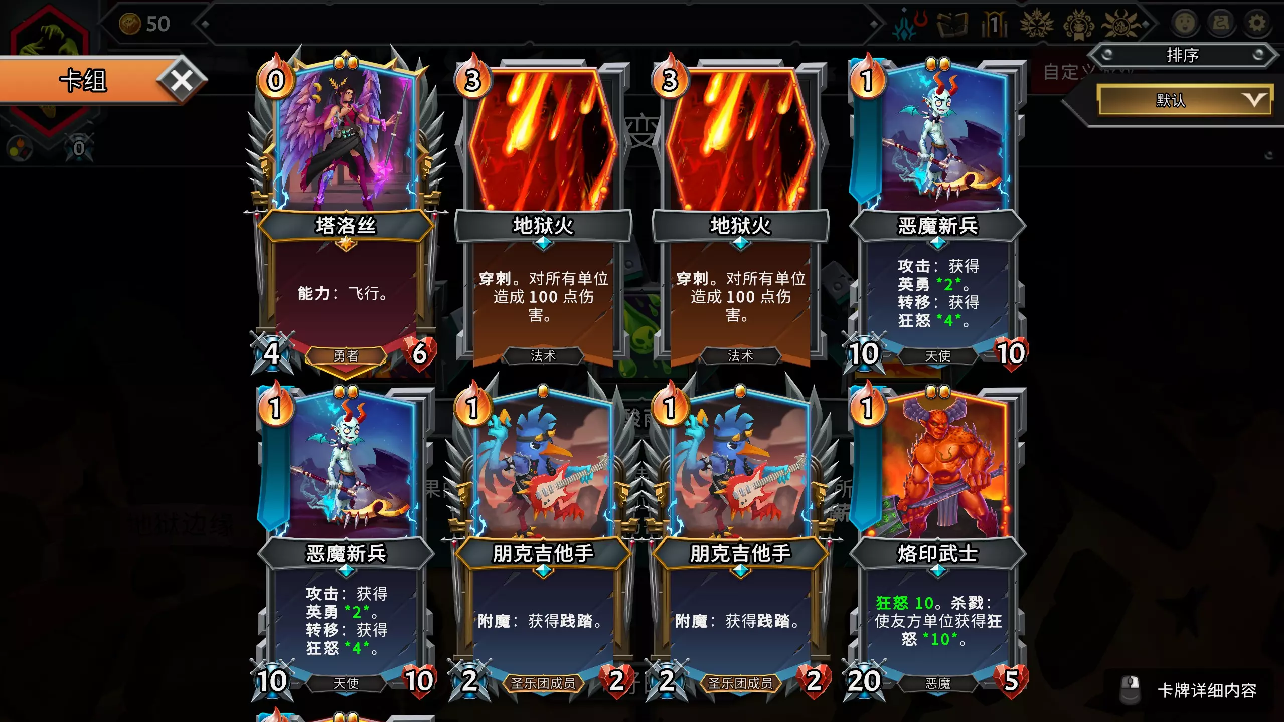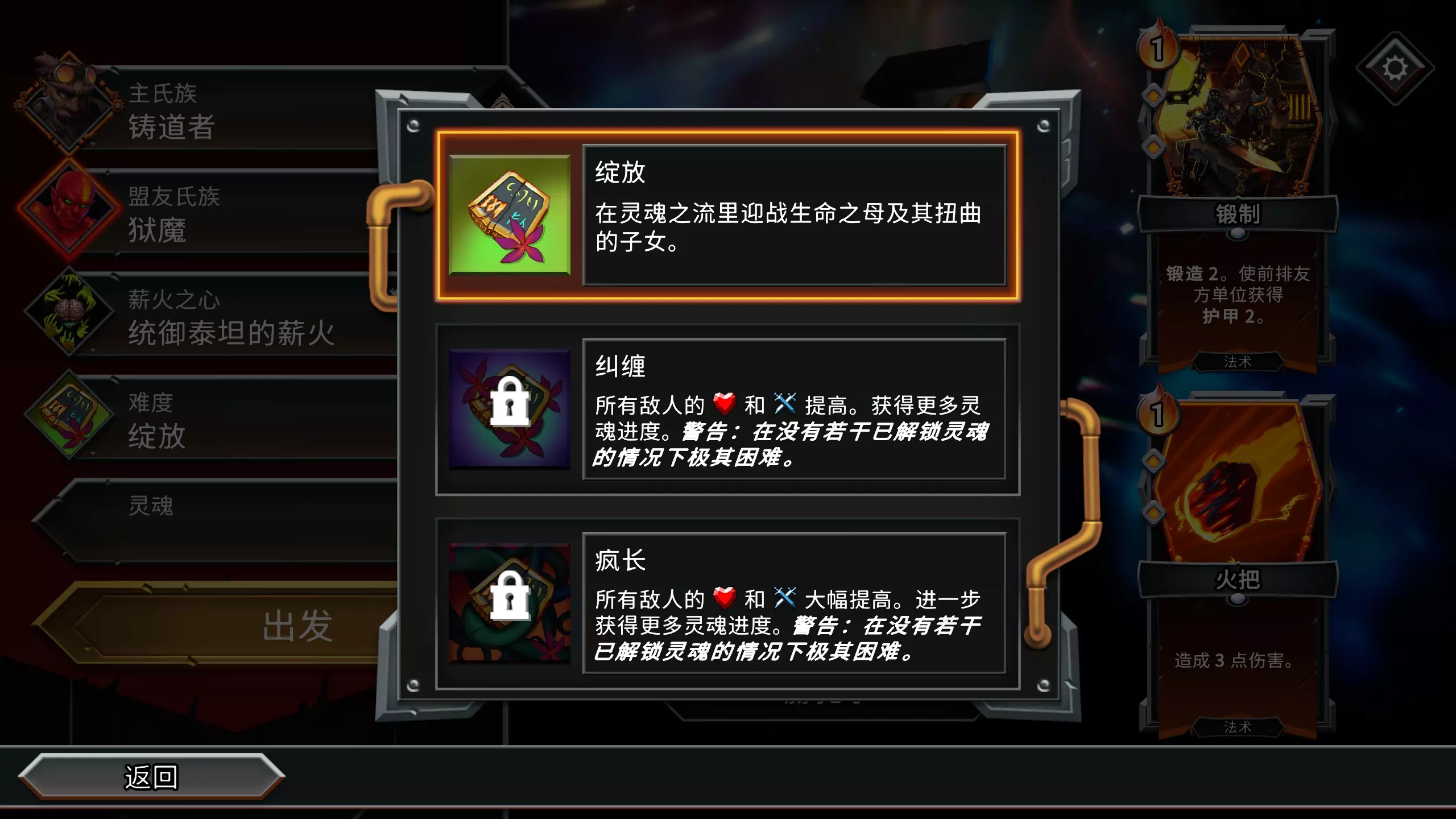 解锁狱魔后,选择无契约开局,然后挑选四张卡牌,刷出带有地狱火的开局。