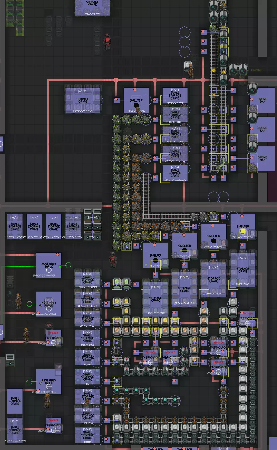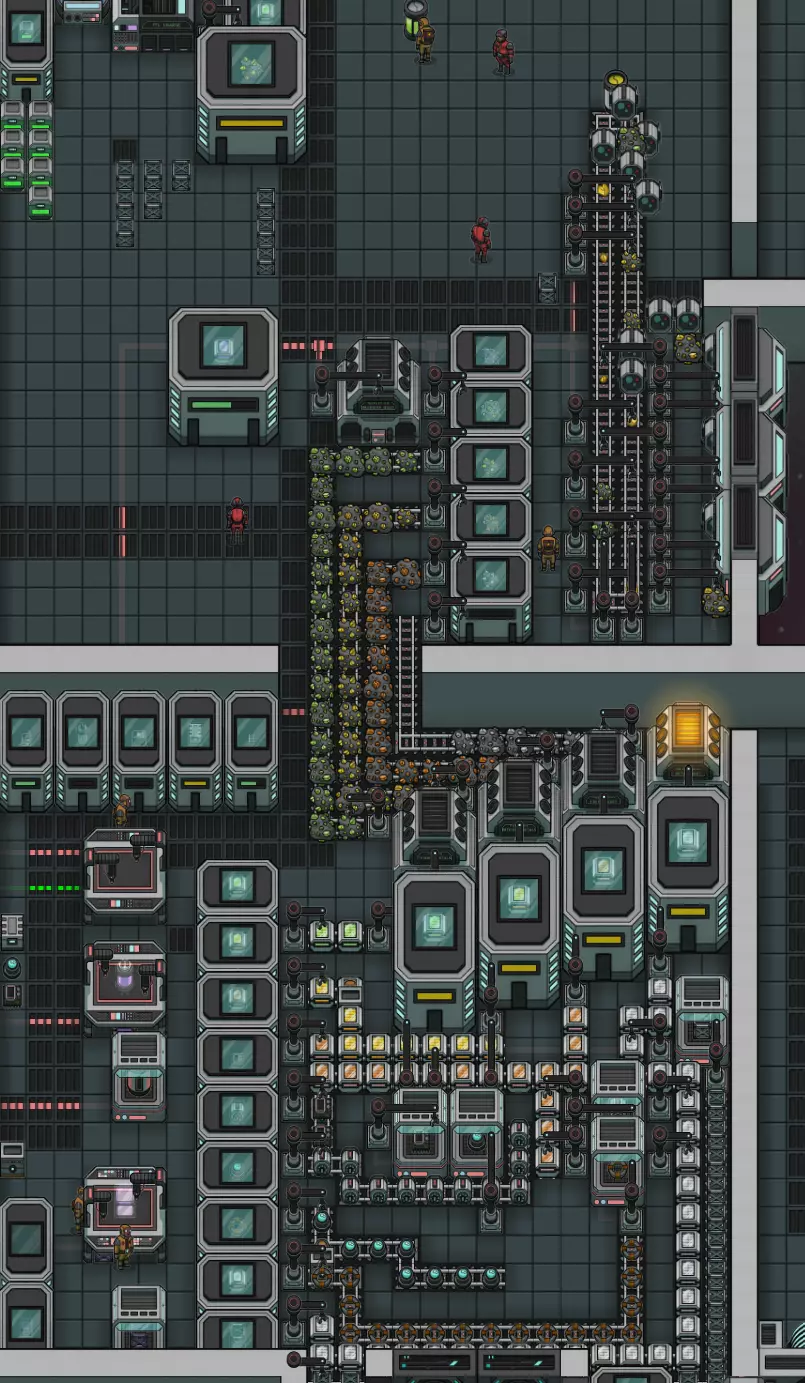 这是采矿和冶炼的升级版。 你可以将铌锭存储箱移至工厂楼层以便靠近。 制造机和装配台由船员手动装载。 你也可以将其自动化,但由于我会根据需求更改生产,且有些物品无法存入仓库,所以我选择保留手动操作。 “采矿和冶炼”的显著变化: 1) 移除了从无人机舱取货的中间机械臂。 2) 我延长了卸载传送带,以便将其他物品从传送带上运出,防止堵塞。 我使用智能机械臂,并根据需要更改任务。提示:你可以右键点击传送带上的物品,手动将其从传送带上取下 3) 采矿舰队管理 对于采矿,我使用我的工厂船,星际物流设置如下: 一些提示: 1) 将主基地保持在一个系统中,最好带有殖民地或造船厂,不要让它跳跃,将所有东西都存储在那里,其他船只将把物资带到那里并在那里补充自己。 如果你开始移动主基地,运输船将前往循环开始时列出的那个系统,但那里已经没有船了。它会在下次循环开始时更新并保存列表。 2) 不要设置成A船的列表将物品放入B船,而B船的列表又将物品放入A船。将其整理为一个进出货清单 我的>系统>矿石>船上数量(一个小型储物箱36个) 然后另起一行列出其他不同的矿石,以此类推。 目前,如果系统中的矿石耗尽,游戏会报错——即使你射击小行星获取了更多矿石(不知为何这不算数),所以我只能手动移动到目标位置射击小行星并进行开采。 我的燃料工厂物流 >每30分钟收集一次气体 >出售所有星门树脂 >前往主基地并转移物资:若接收飞船上的燃料少于50,则转移燃料 >若炸药少于70,则转移炸药 >若船上的超光速燃料少于10,则从超光速燃料储存处转移 >若船上的食物少于10,则从食物储存处转移 >将所有物资转移到堆肥 >出售除10个单位外的所有燃料