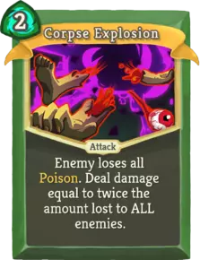 尸体爆炸(1级,已升级) 尸体爆炸是毒素构筑中唯一可靠的范围伤害法术(标本遗物除外),但有一个明显缺点:会清除所有已积累的毒素。将此卡牌留作终结技使用,尤其对付暗灵时效果显著。 在2018年2月1日的构筑版本中,若拥有标本遗物,使用尸体爆炸击杀敌人后,毒素伤害会转移到另一个敌人身上,而非消失。 升级效果:伤害变为三倍 不良卡牌 这些卡牌看似有用,实则效果不佳。它们会占用本应精简高效的卡组空间,提供的收益低于平均水平,还会延迟关键卡牌的抽牌。