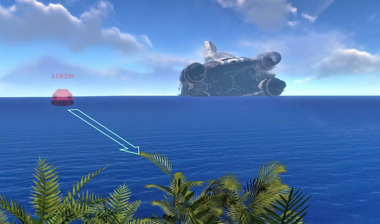 浮岛就在极光号的正后方,但距离相当远。你可以在白天或夜晚游到那里而不被攻击,只要遵循三个简单的规则: 1. 在水面上游 2. 不要靠近极光号的引擎——那里是死神利维坦的领地 3. 不要在海藻区域停留,尤其是在夜晚潜行者最具攻击性的时候 云层:有一片“云”或“雾团”会遮挡岛屿的视线,你可能会看到“朝着云的方向游”的建议。但它和其他云非常相似,你能否分辨出差异可能取决于你的图形设置。如果你能看到它,很好——朝着那个方向游。 白天有个简单的技巧可以识别正确的云层,那就是使用你的PDA(感谢Meowy15提供的提示!)。面向极光号引擎后方,如上图所示。然后只需打开你的PDA。通过PDA可以看到正确的云层会有明亮的轮廓。