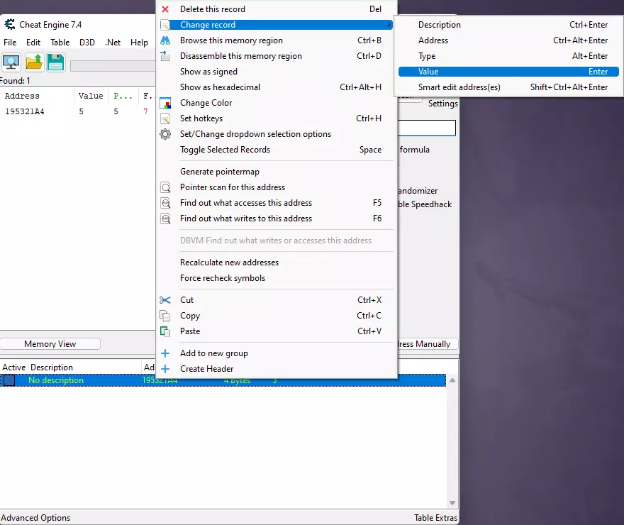 接下来右键点击我们下方的数值,会弹出这样的窗口:左键点击“Change record”,然后点击“Value”。将数值修改为任意值,但不要超过“99”。 完成后,最小化Cheat Engine,我们会看到现在有98次尝试机会,而且这些机会不会被消耗。至此,漏洞利用结束。