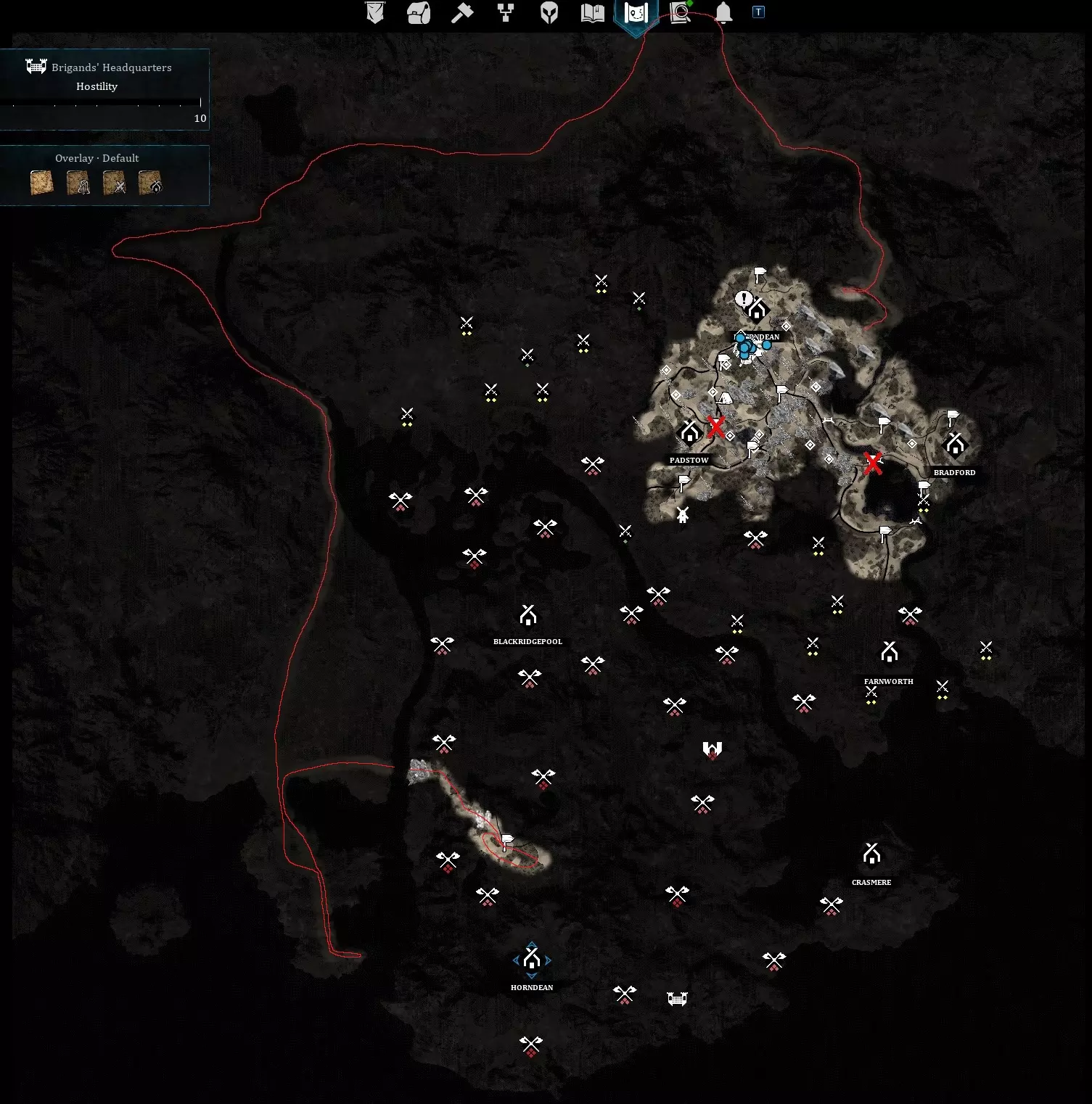 1. Speed up woodcutting by timing hits, counting swings and aiming so that they hit just after starting. Holding the button prevents excess swings but is slower. 2. Hunting is easier during winter due to visibility and meat will offset the lack of plant foods. A good early hunting spot is southeast of Haerndean on both sides of the river, which you can jump across using the underwater rocks. Place two signs at hunting spots so you can fast-travel to one, clear the area and exit at the other. 3. Roads reduce sprinting stamina costs. Player-built roads also provide a movement speed bonus. Build plenty in your settlements, including to distant gathering buildings. Built roads can also improve treks between signs and villages! 4. Coins are best spent on agility/strength books for yourself, then for your best followers, and food seeds to get your food farming started - they're cheap in Blackridgepool. The books' required level is Haerndean (1), Padstow (3), Bradford (5), Farnworth (7), then Horndean, Blackridgepool and Crasmere (9). 5. Put "!" before a building's name to list it first in the N menu. Especially useful for research while away from the settlement or easily finding your main crafting facilities. 6. Recruit the best settlers. Their renown cost goes up after each one so any savings are small, plus they'll need time to train their skills. You can dismiss bad settlers to regain their cost, but take their equipment first. 7. While hiring and faced with a bad recruit, hire him/her anyway and use this trick: Take bad recruits' clothes to mark them as "don't check", then dismiss them to refund 100% of their hiring cost. Then check another clothed recruit. Repeat until you find one that you want and keep him/her. The next time you recruit here, repeat the process. You'll never have to check a bad recruit again, because the bad ones you've checked are already stripped. 8. Recruits from quests are cheap and highly skilled so always recruit them. Examples are the harvester northwest of Padstow, two warriors around Blackridgepool and a knight on the beach southwest of Farnworth. If you don't have enough renown to hire them, exit the dialogue using TAB and leave the quest open, else the option may not appear again (bug). 9. The Nomad trait adds a speed bonus, which is amazing for all settlers. Neurotic is for dedicated workers. Keep them unarmed so they don't fight. Stalwart is for dedicated warriors and has a wrong description: It improves combat skills, not strength/agility. Porter may appear great for haulers but the speed debuff makes it decent at best, especially since you'll later get backpacks and because of small hauling demands. 10. Use the map to give your companions a distant move order, like running back to base after a skirmish (if dismissed they'll walk instead). 11. Morale is important because it grants significant stat boosts, both for workers and warriors. "Productivity" works as a modifier to job skill bonuses. Better housing provides morale boosts at the cost of construction effort. 12. You need an apprentice Carpenter as soon as possible for the River Dock, making Padstow a great first liberation target. More on liberation below. 13. The N menu building list shows which building uses which job. Jobs correspond to work attributes: Crafting also applies to smelting, harvesting also applies to woodcutting, construction uses labourer and delivery uses nothing. The others are self-explanatory. 14. Easily set job priorities based on the attribute maximum (it'll level up over time): The best attribute to 2, medium to 5 and worst to 8. Fine-tune using adjacent priorities (1/3, 4/6 and 7/9). With enough workers, jobs that have gain differences (farming, hunting, harvesting) should be disabled for less skilled workers, though hunting can also be used to train settlers' agility. 15. Always have a settler with max research priority. The job is temporary and you'll want it done fast. For research requiring an apprentice, have one of each type with max research priority even if they're bad researchers. 16. Use settler nicknames as notes. Ugly but it works as I almost never look at my settlers' stats. Here's what my nickname-code looks like: "!Far/Cra 1N" or ">War STe". Legend: "!" for specialist, later "!!" for endgame-worthy. ">" for guard Role: "War" for warrior, or the first three letters of their best job skills "1" onehander+shield/"2" twohander/"S" swordsman/"B" bow "N" for neurotic "T" for temporary (looking for a replacement) Before unlocking gear presets, "e" for needs to be equipped 2. Combat and equipment