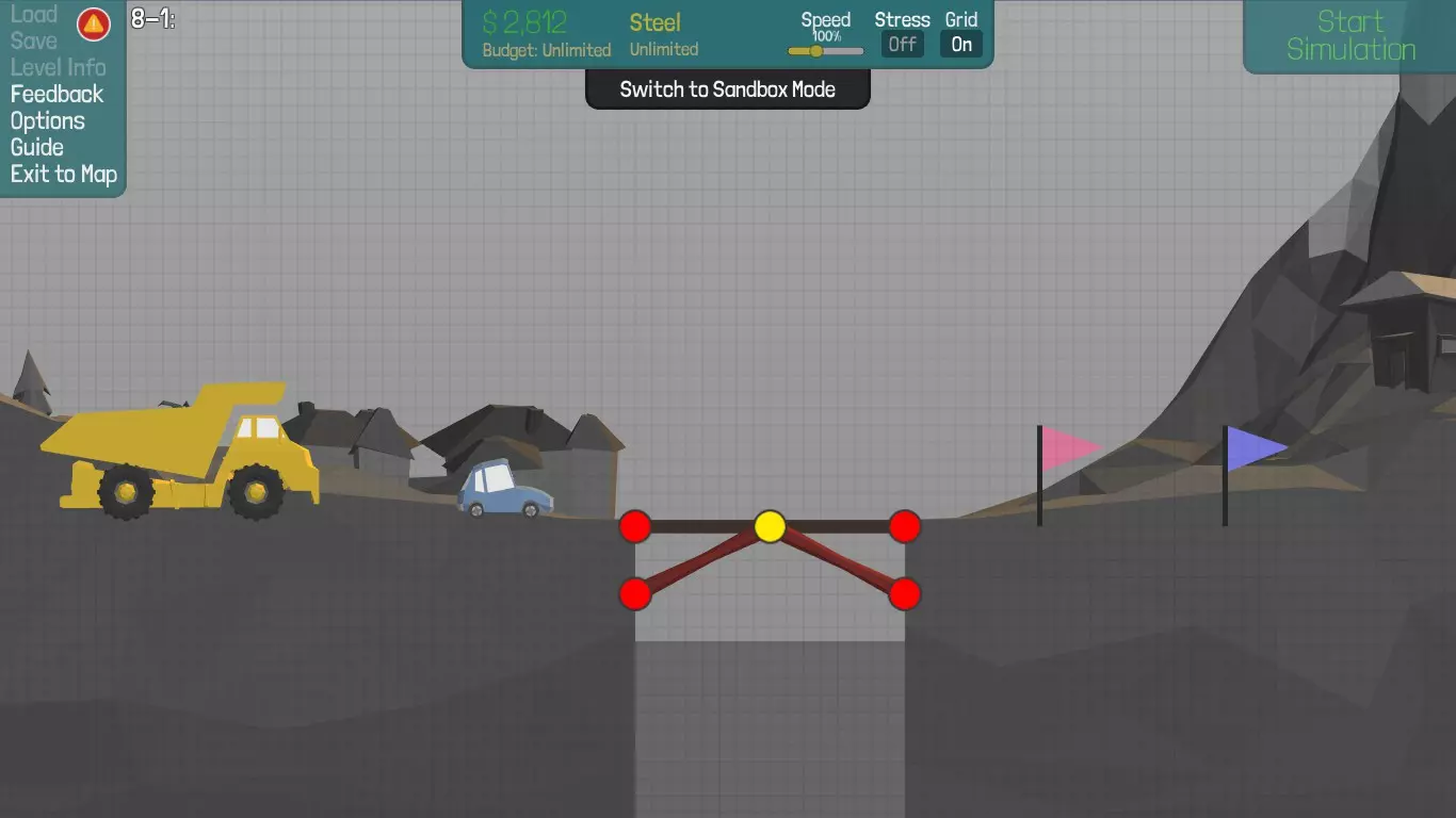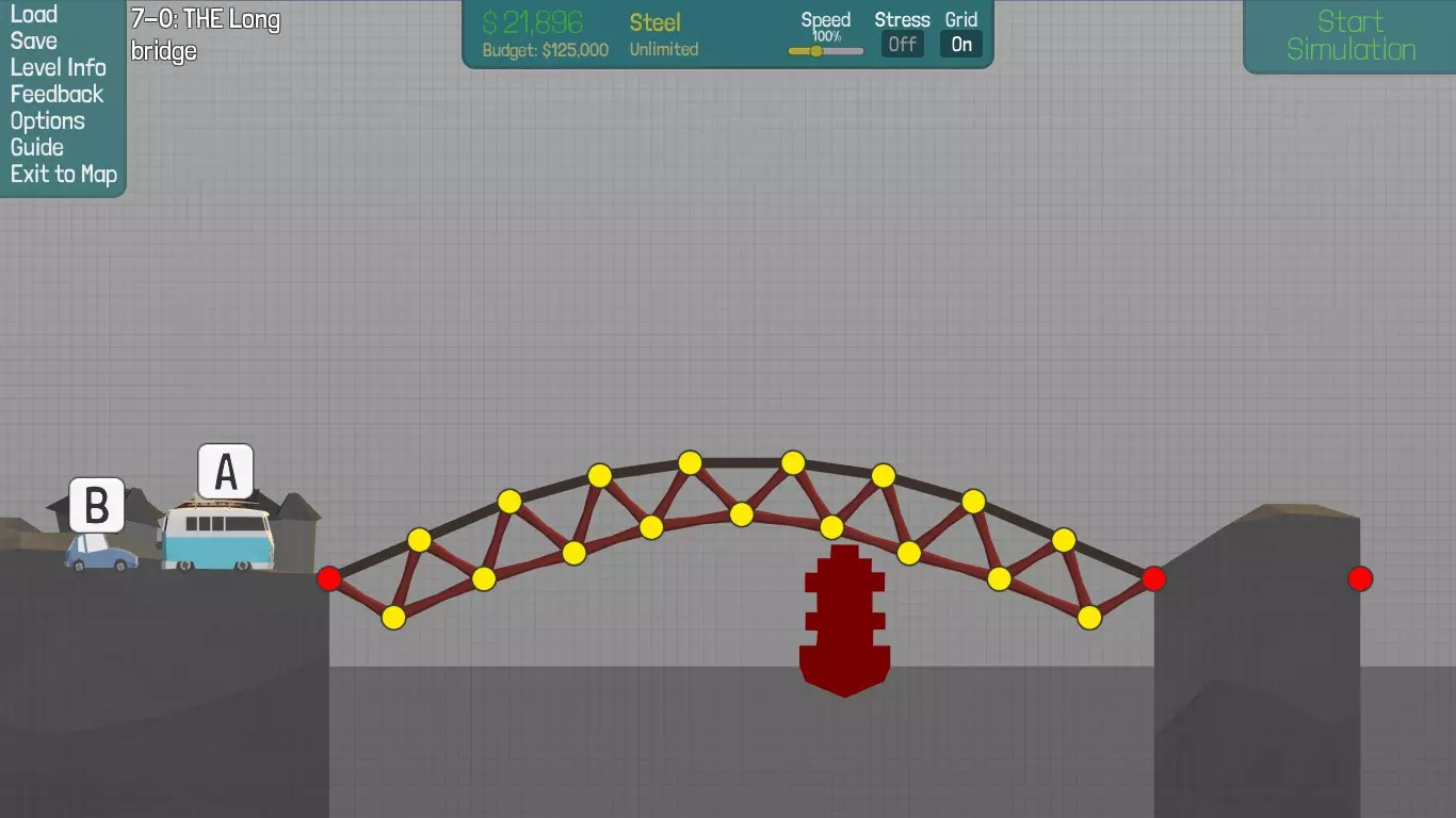 因此,在【桥梁建筑师】中,只有当两岸间距小于或等于两段最长路面板长度的时候,才能造出带柱纯拱桥。 综上所述,【桥梁建筑师】里并非完全没有纯拱桥,而是这种类型的桥对锚固点(即红点)位置、两岸间距等关卡预设因素要求太严苛(比如游戏所有的自带关卡都不满足这种条件),即使在游戏中也非常不实用(现实中更没有只含铰结点不含刚结点的、直杆构成的纯拱桥)——要造还是造桁架拱桥为好。