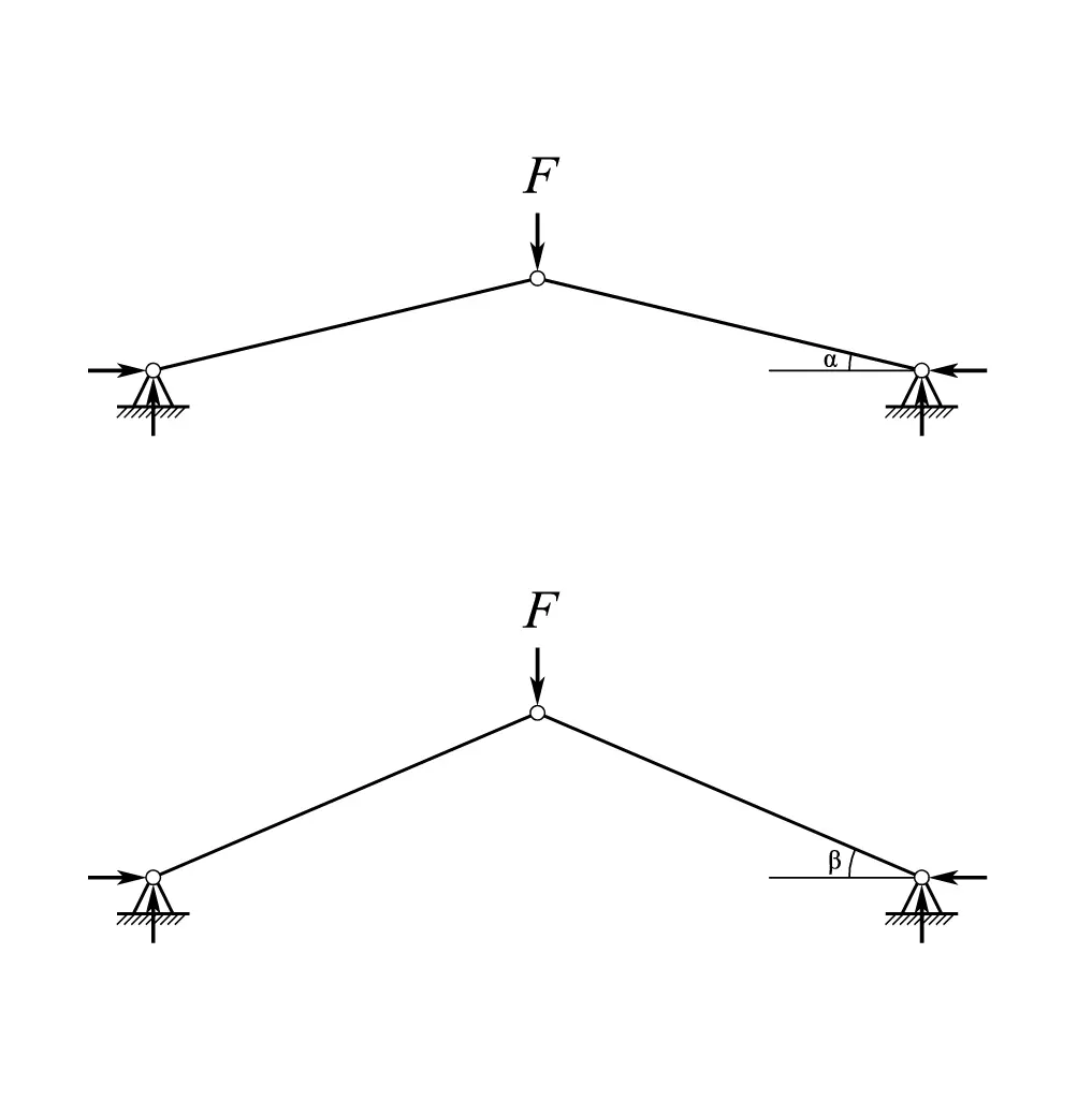 上图单根直杆轴向压应力=F/sin α 下图单根直杆轴向压应力=F/sin β 因为α<β,所以上图单根直杆轴向压应力>下图单根直杆轴向压应力 因此,在【桥梁建筑师】中,只有当两岸间距小于两段最长路面板长度的时候,才能造出实体纯拱桥,且特别容易损坏。 在“纯拱桥”的定义放宽,即允许梁、柱出现的情况下,依然只可能是两段直杆组成的三铰拱: