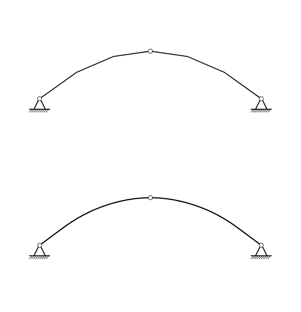 这三种简图里的拱都是由曲杆构成的,我们也可以把曲杆换成折杆。