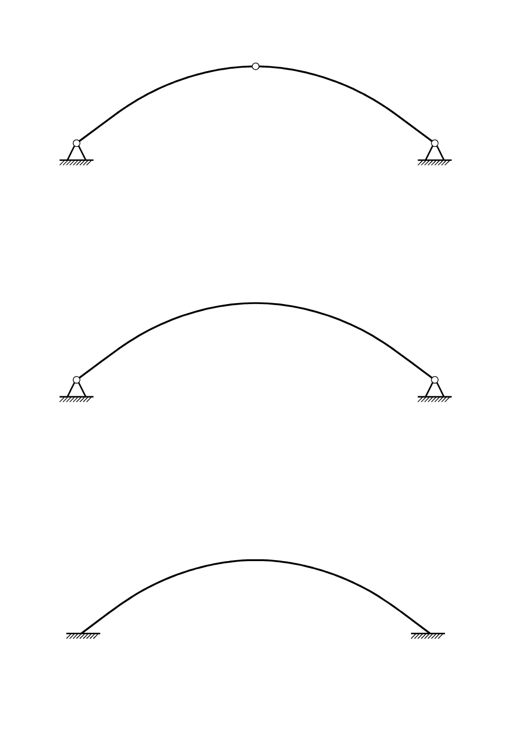 “路面不一定水平也不一定平整”举例用的是中承式拱桥,不过上承式也类似。 上承式拱桥既有单跨拱桥(一个拱券承载整个桥面)也有多跨拱桥(多个拱券承载整个桥面)。【存在单跨“纯拱桥”】是【存在多跨“纯拱桥”】的必要不充分条件,所以我们这里只需要探究单跨拱桥。 单跨拱有三种——三铰拱、二铰拱与无铰拱,其结构计算简图如下所示: