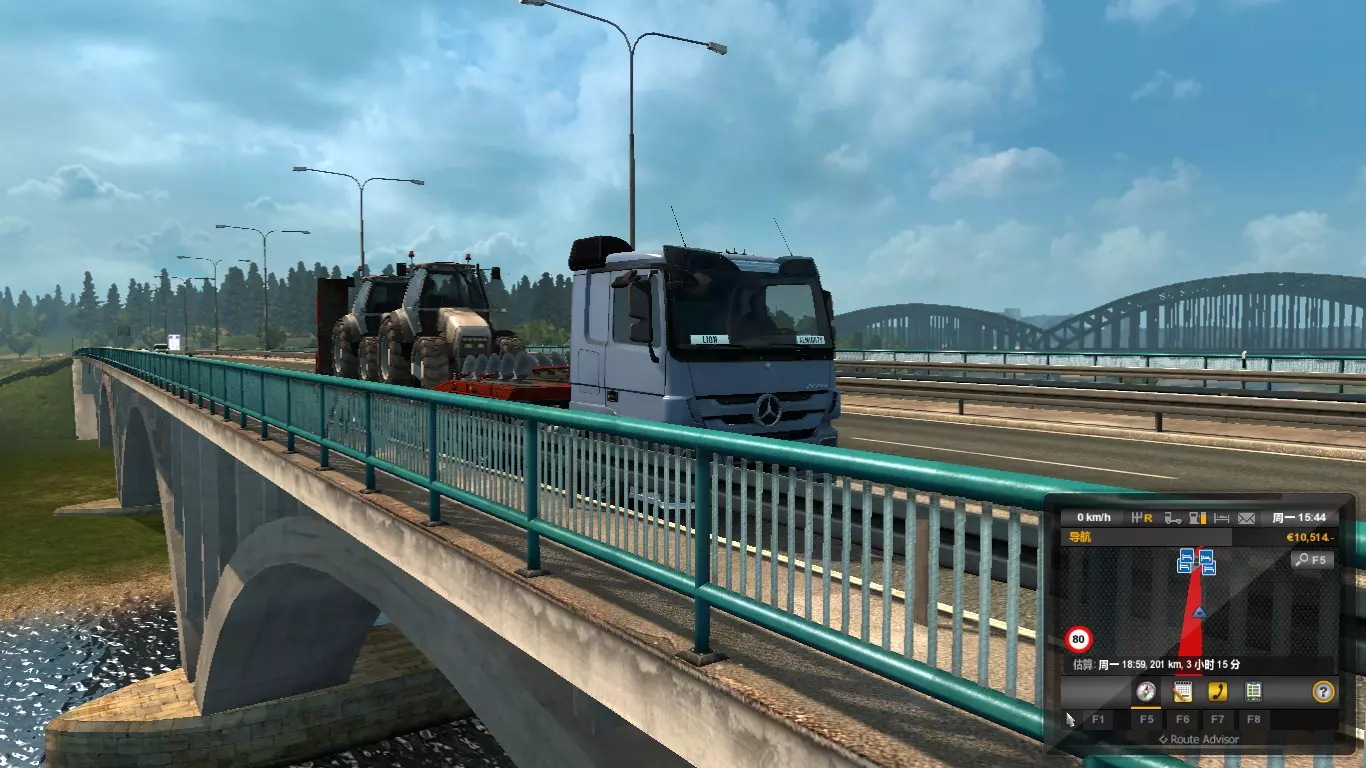 《欧洲卡车模拟2》截图(本人玩并截图于2016.01) “只有拱这一种结构”,严格来讲的话连梁、柱都不能有,而这种严格意义上的拱桥只有当拱券本身充当路面时才能实现,也就是说这时路面是拱起的。定义稍微宽松一点(允许出现梁、柱)的话,路面则可以全部水平,当然还可以倾斜、拱起或凹陷。