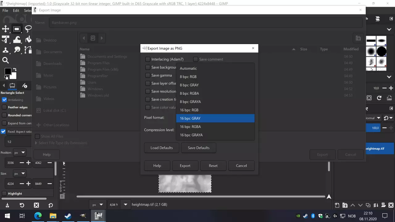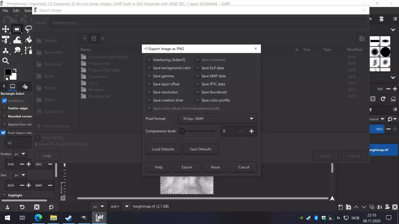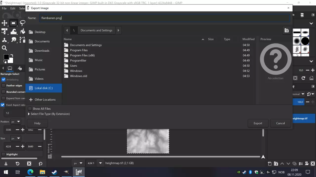 选择一个合适的文件名,并确保以.png结尾,因为我们必须将其保存为PNG文件用于《狂热运输》。我将其命名为flamsbanan.png,因为我正在创建的地图是弗洛姆铁路运行的区域。