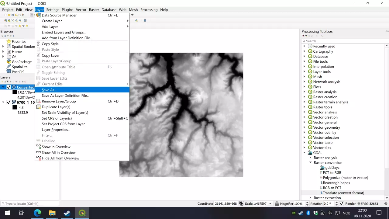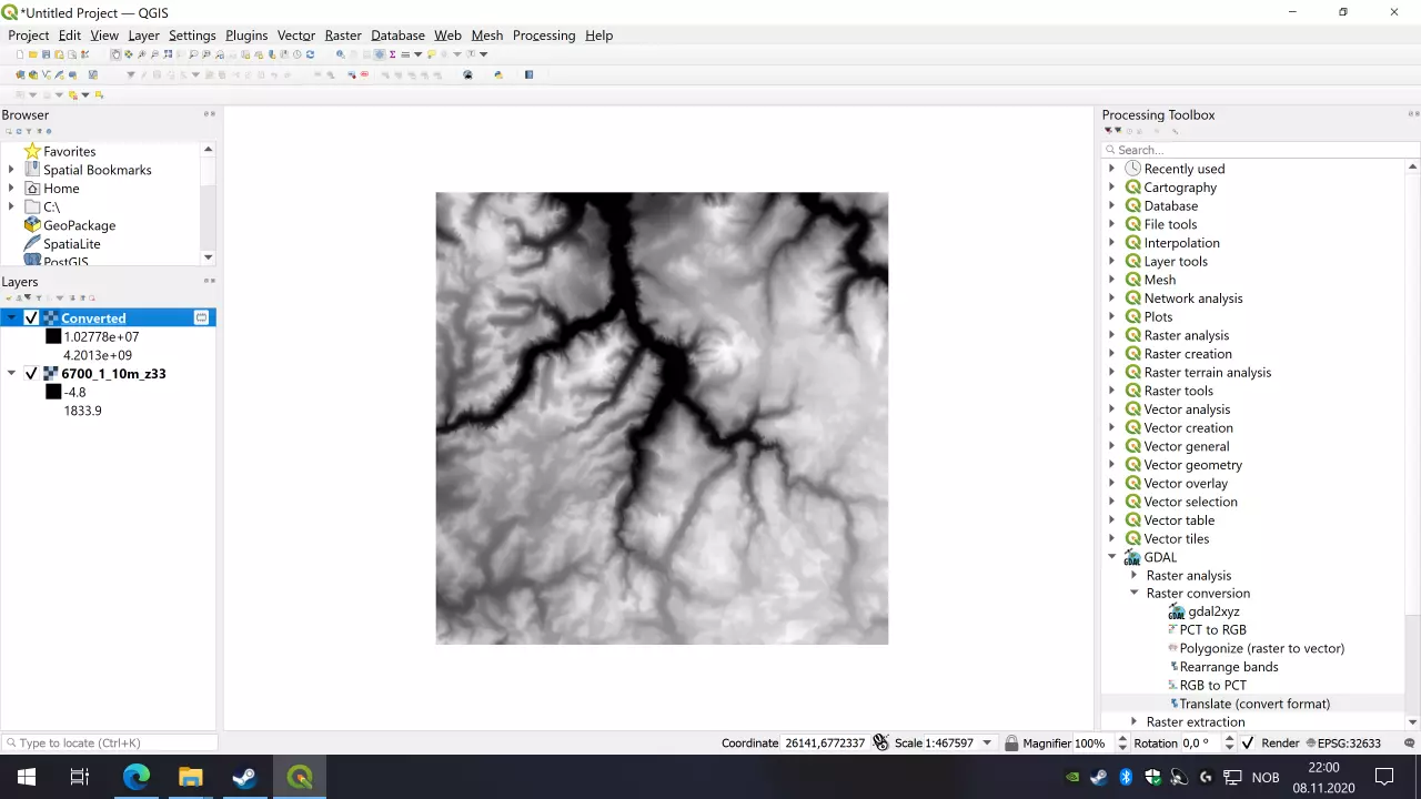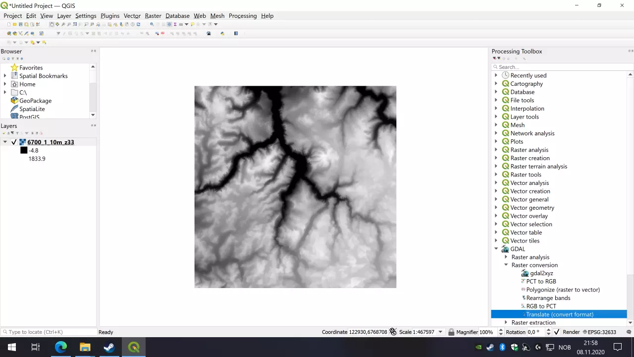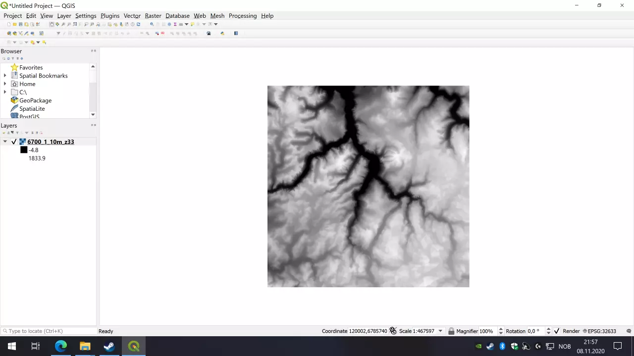 你应该能看到与QGIS中相同的熟悉高度图,但要检查顶部窗口栏是否显示类似“灰度32位”的内容。如果显示的是其他内容,你需要检查是否遗漏了某个步骤。