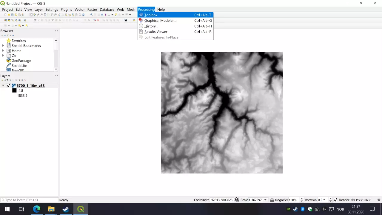 现在查看【图层】面板的左侧。那里应该会显示数字高程模型(DEM)的ID,在这个示例中是6700_1_10m_z33。其下方有两个数字:-4.8和1833.9。你需要记下这两个数字,后续会多次用到。它们分别代表该数据集中的最低和最高海拔,单位为米(m)。 接下来,前往菜单栏,点击【处理】->【工具箱】,或者按下快捷键(Ctrl+Alt+T)。